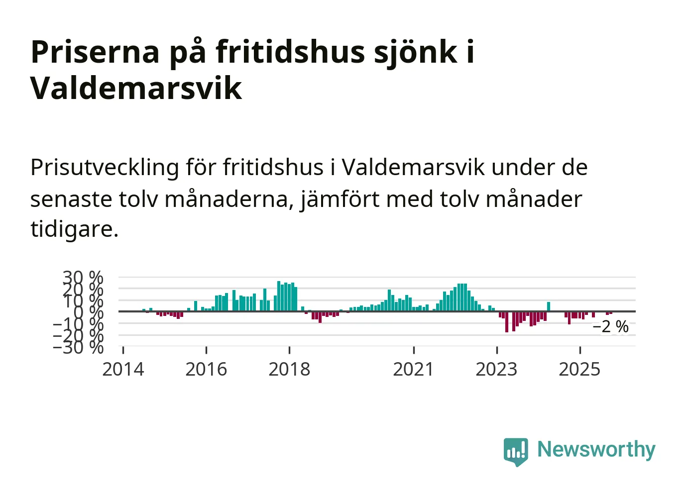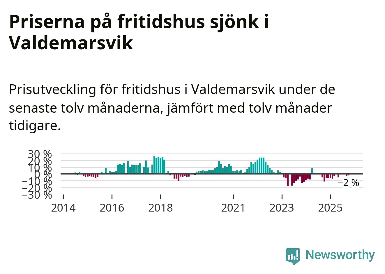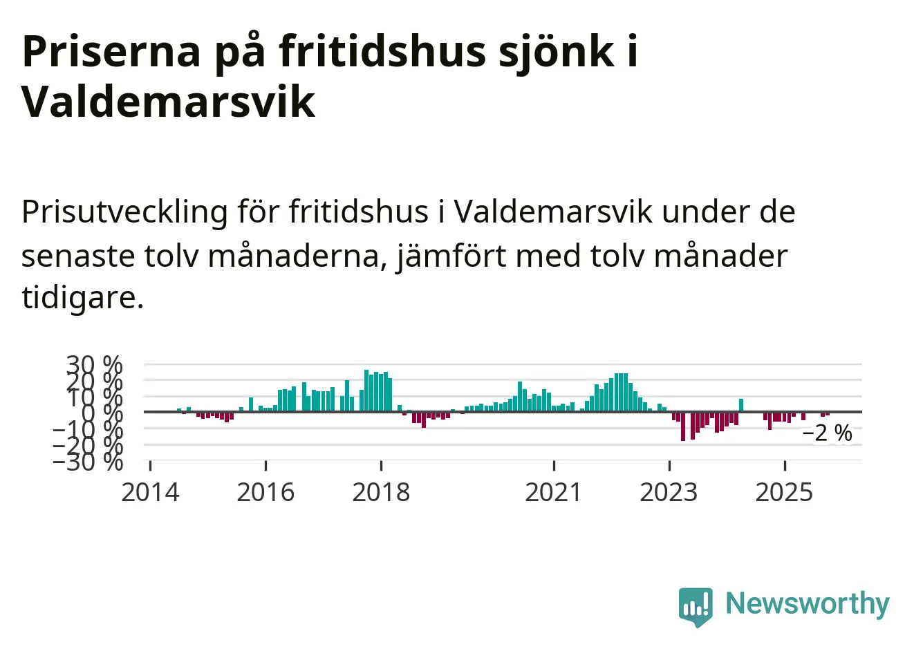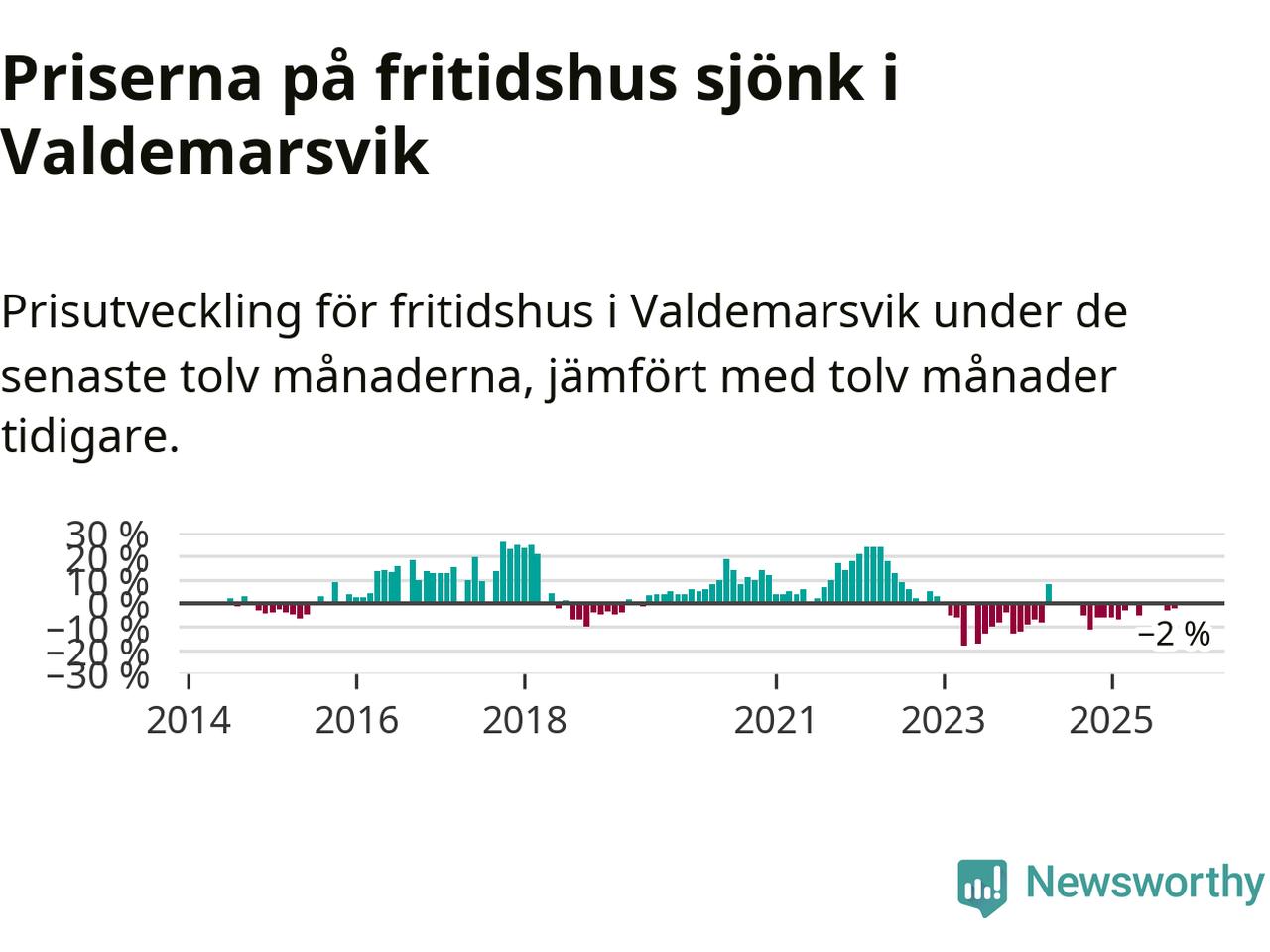 Priserna på fritidshus har gått ner i Valdemarsviks kommun. Medelpriset på försäljningarna under de senaste tolv månaderna visar på en nedgång med 2 procent.