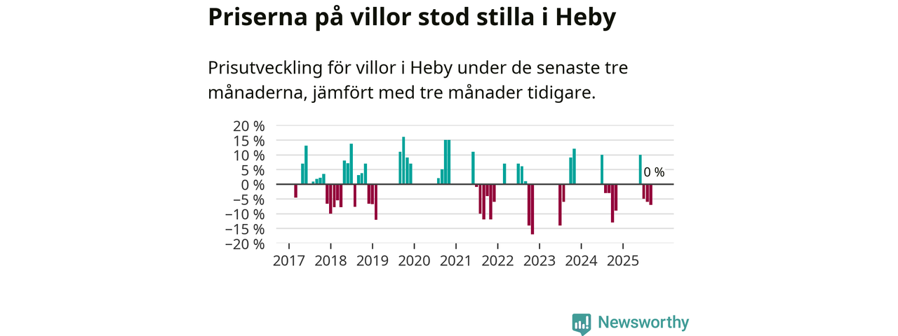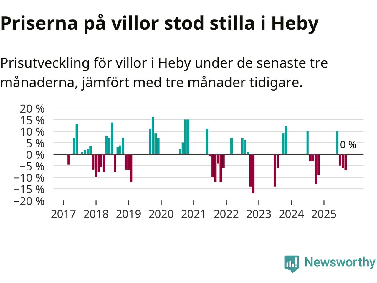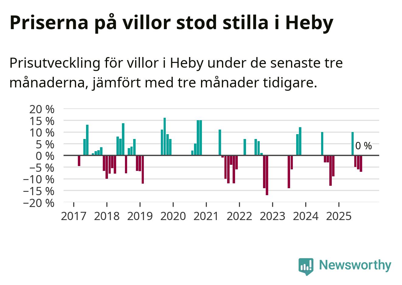 Medelpriset på försäljningarna i Heby kommun låg på i stort sett samma nivå som för tre månader sedan. I hela Uppsala däremot sjunker villapriserna. I hela länet noterades en prisnedgång på 2 procent.