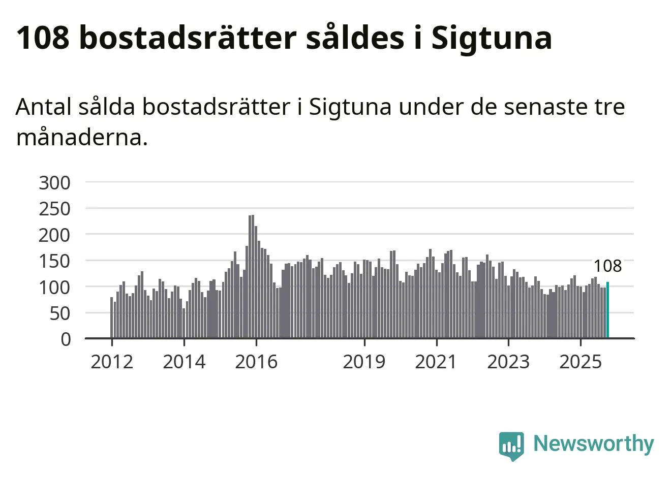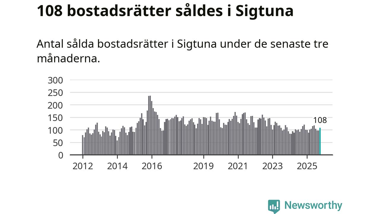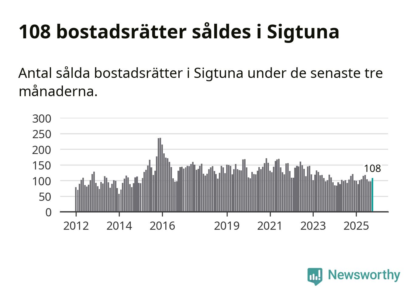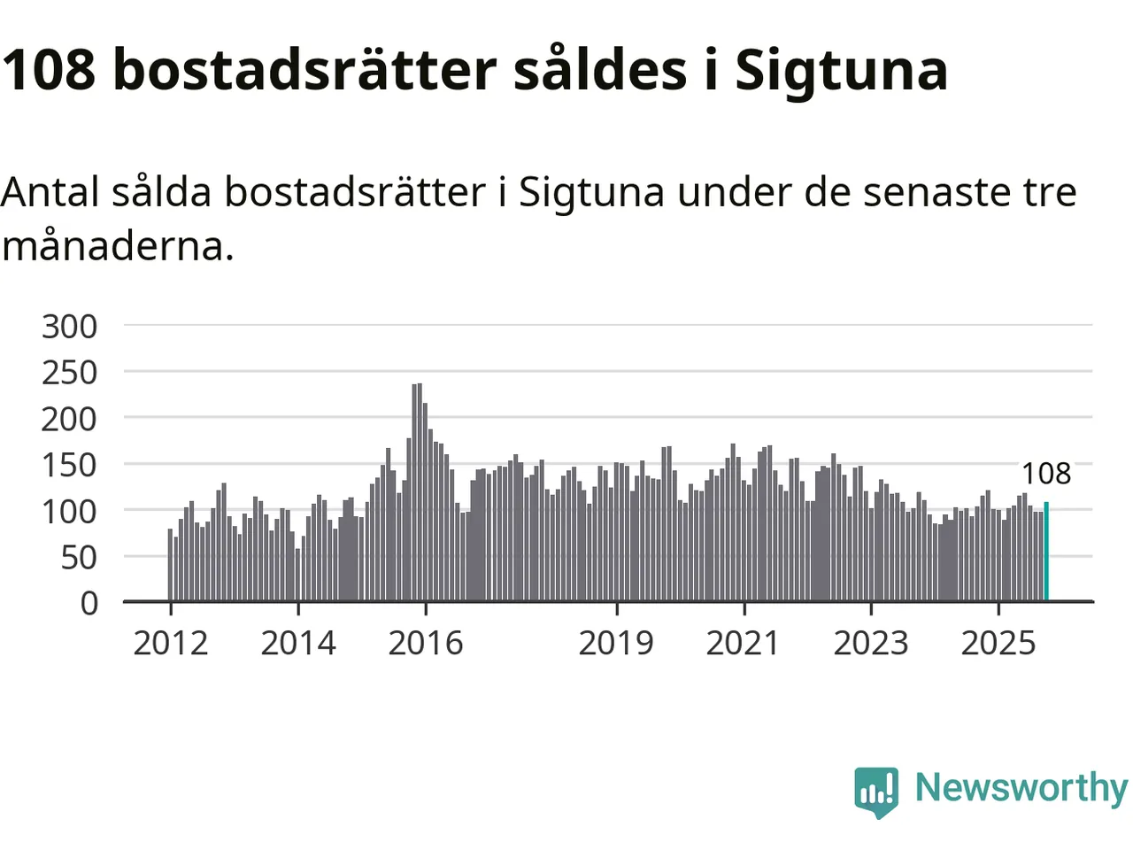 Sammanlagt såldes 108 bostadsrätter i Sigtuna kommun mellan augusti och oktober till ett genomsnittligt pris på 2,0 miljoner kronor. I fjol gjordes 115 affärer vid den här tiden på året.