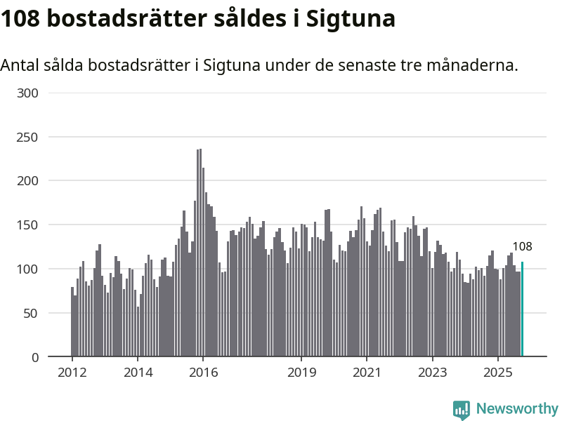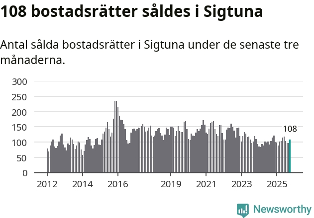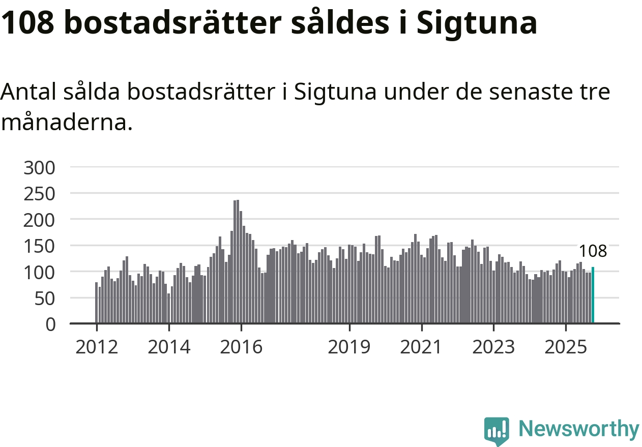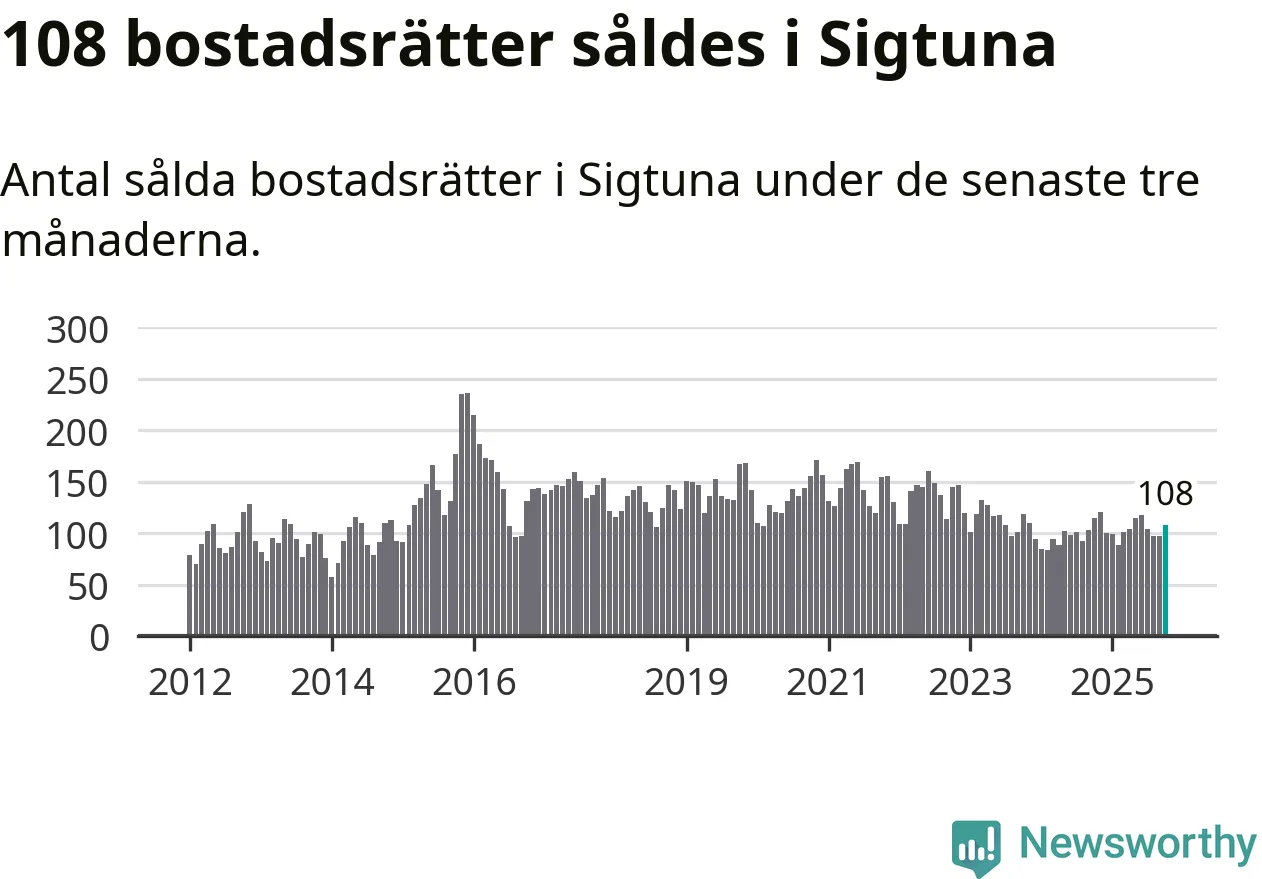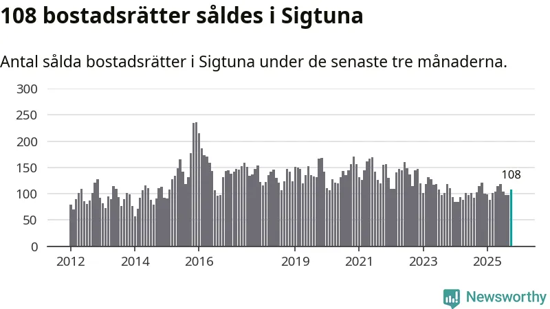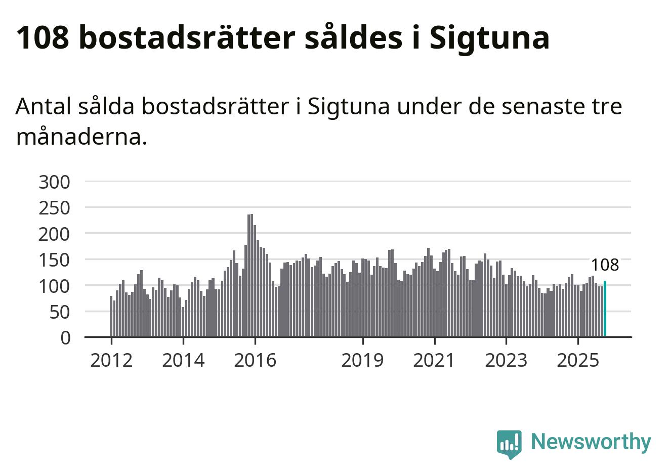 Sammanlagt såldes 108 bostadsrätter i Sigtuna kommun mellan augusti och oktober till ett genomsnittligt pris på 2,0 miljoner kronor. I fjol gjordes 115 affärer vid den här tiden på året.