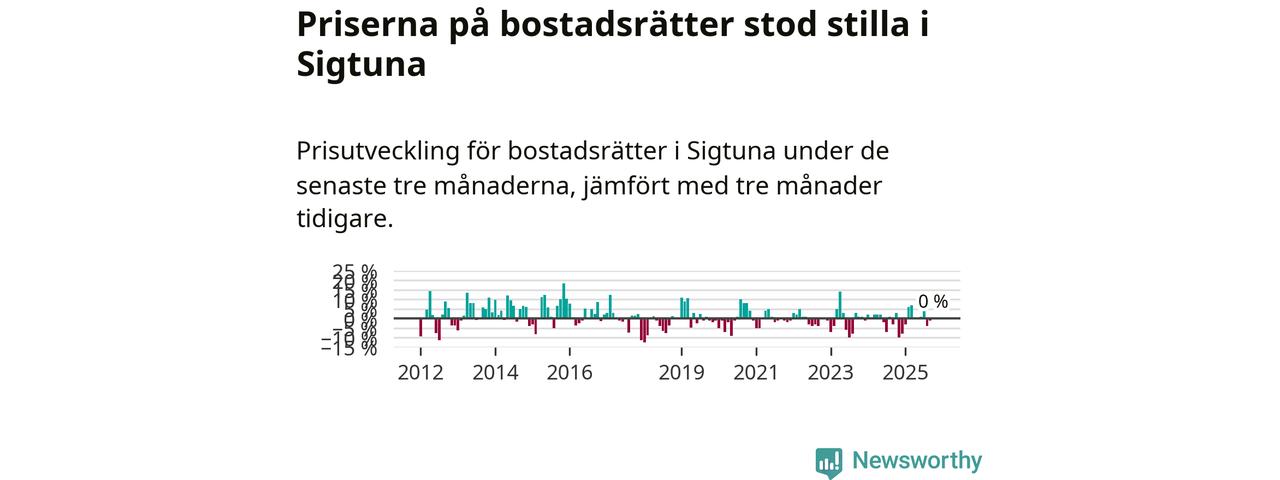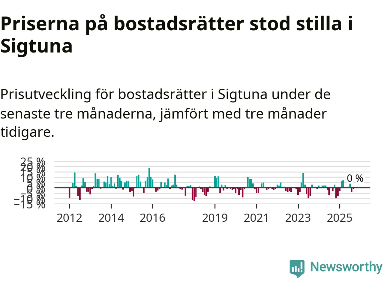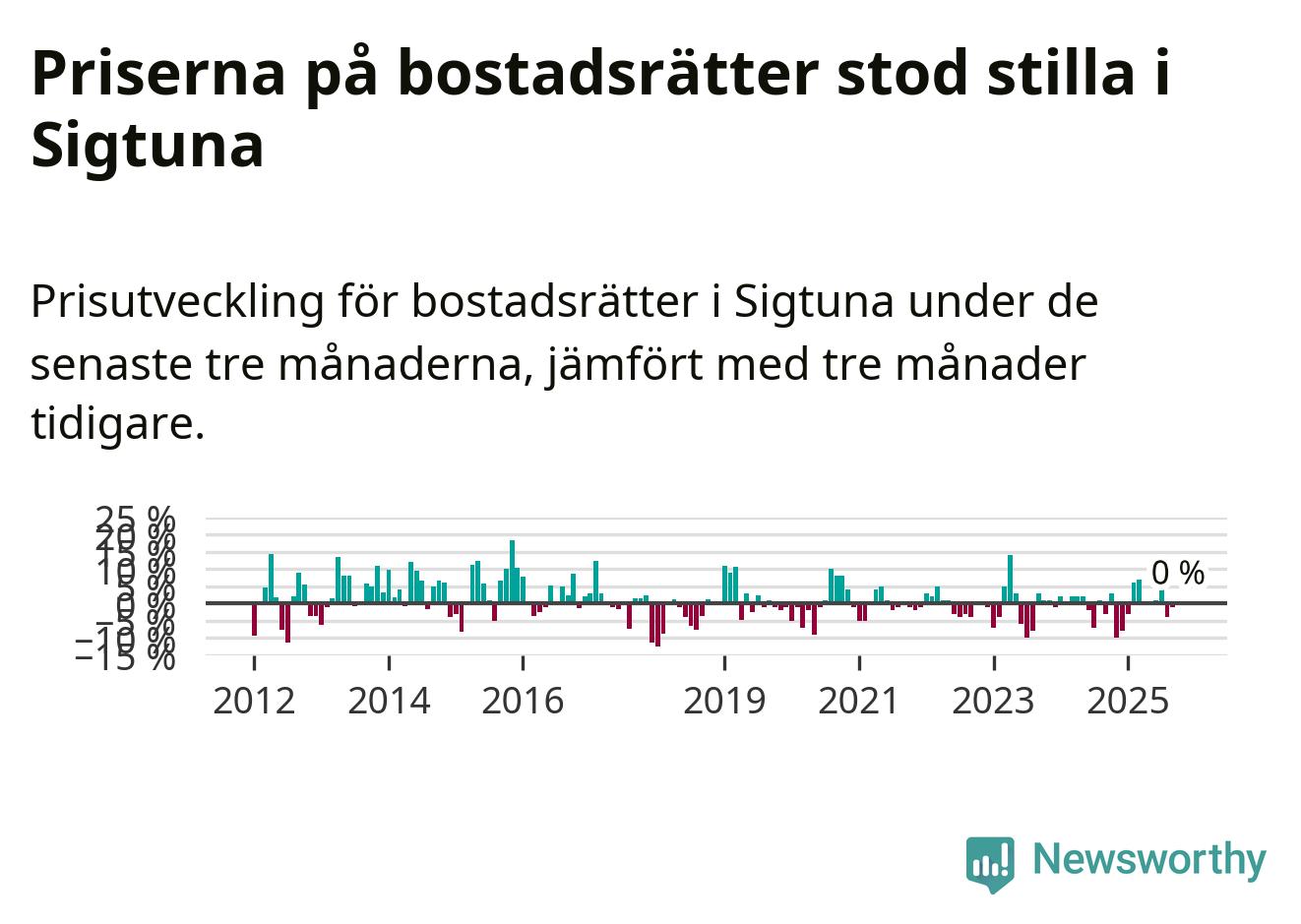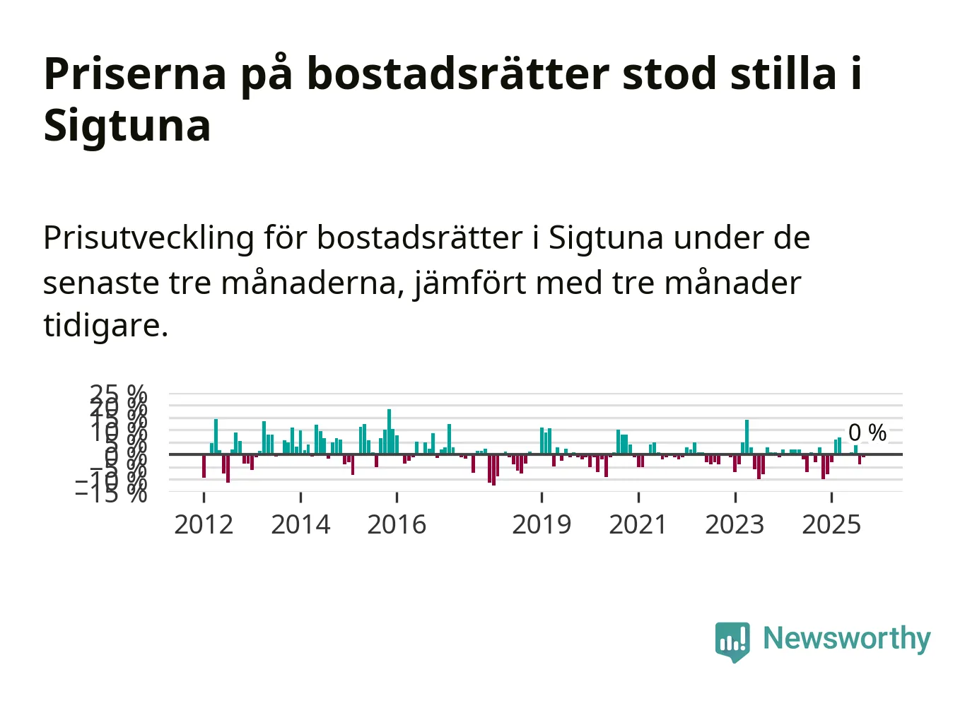 Priserna på bostadsrätter står i stort sett stilla i Sigtuna kommun. Medelpriset på de på försäljningarna under de senaste tre månaderna låg på samma nivå som för tre månader sedan.