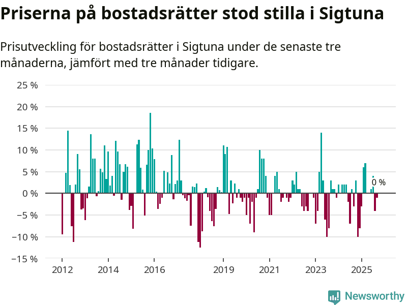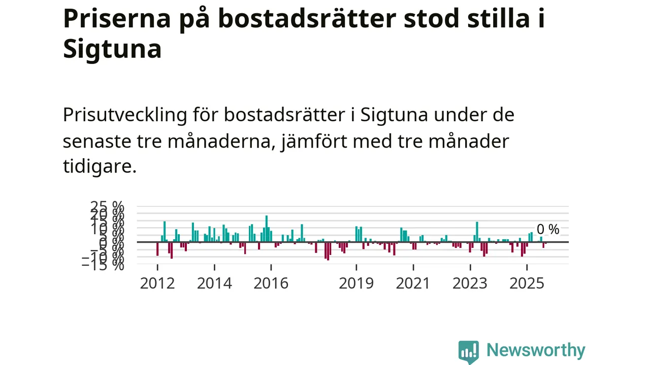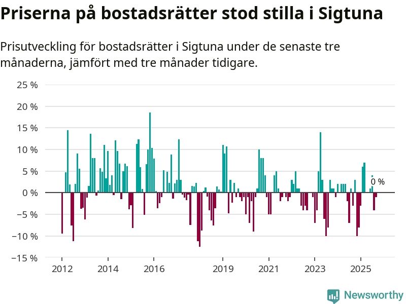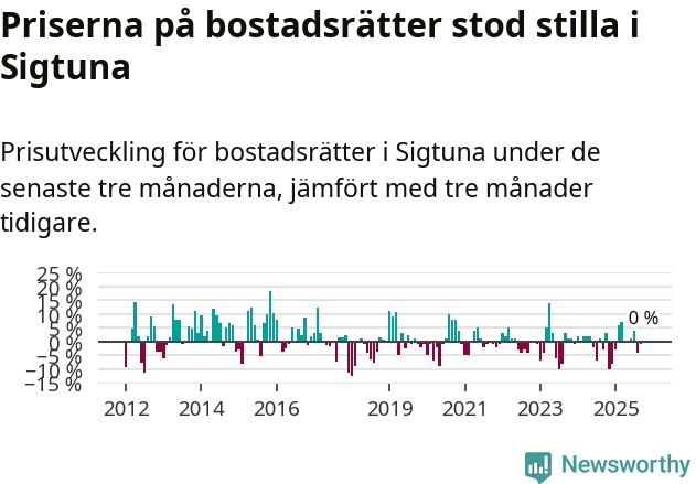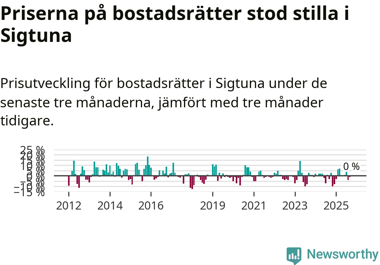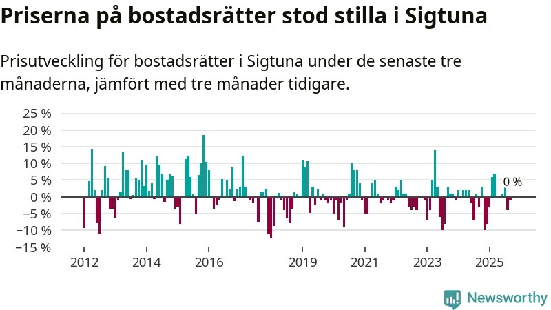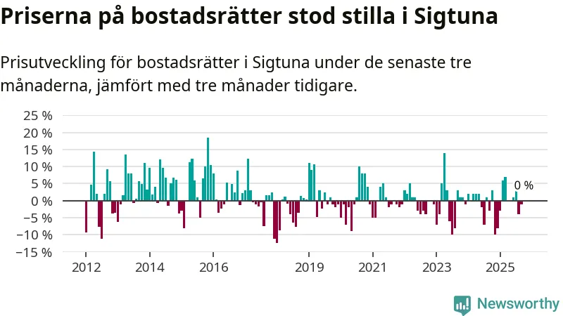 Priserna på bostadsrätter står i stort sett stilla i Sigtuna kommun. Medelpriset på de på försäljningarna under de senaste tre månaderna låg på samma nivå som för tre månader sedan.