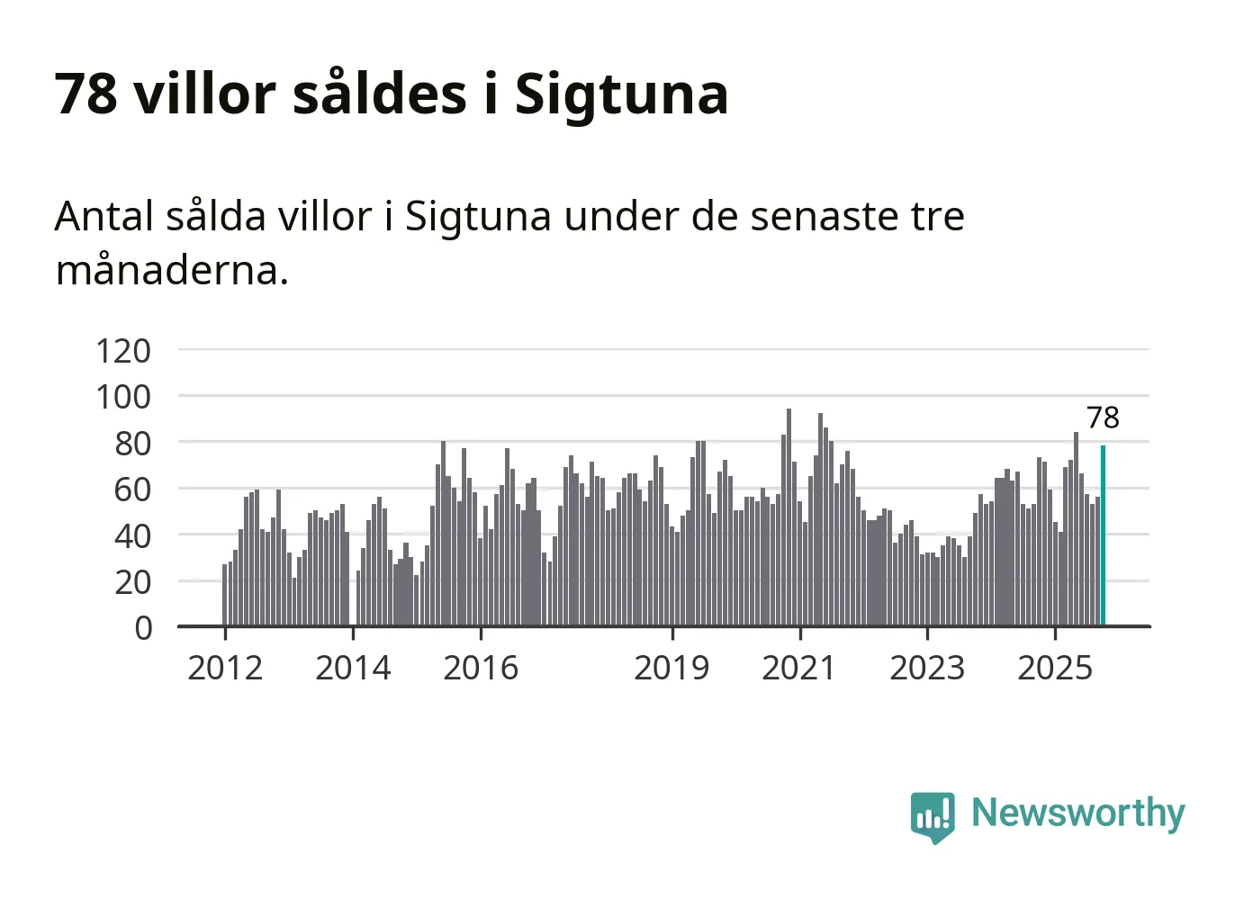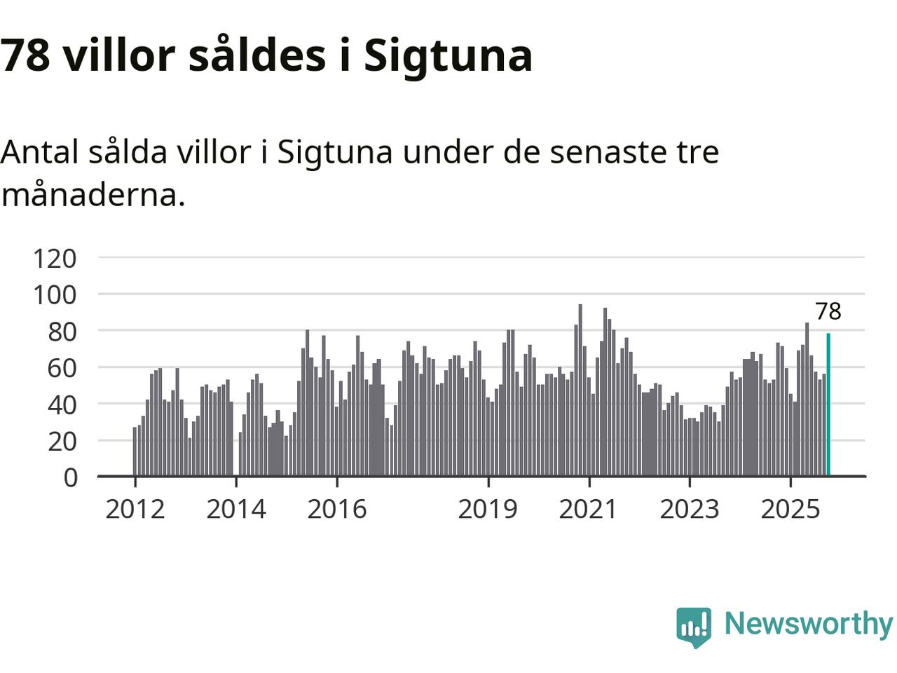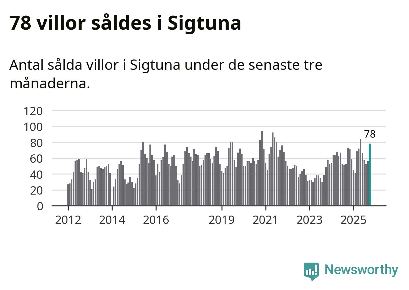 Sammanlagt såldes 78 villor i Sigtuna kommun mellan augusti och oktober till ett genomsnittligt pris på 5,3 miljoner kronor. I fjol gjordes 73 affärer vid den här tiden på året.