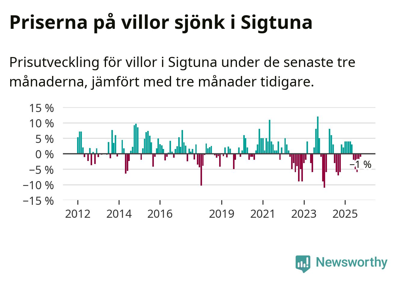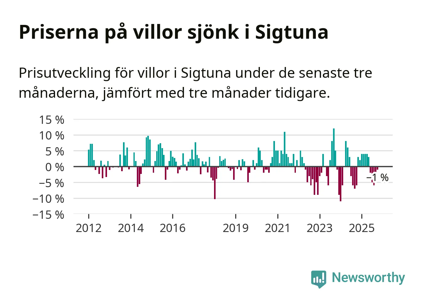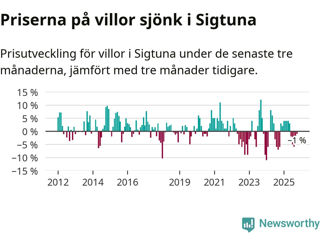 Villapriserna har gått ner i Sigtuna kommun. Medelpriset på försäljningarna under de senaste tre månaderna visar på en nedgång med 1 procent.