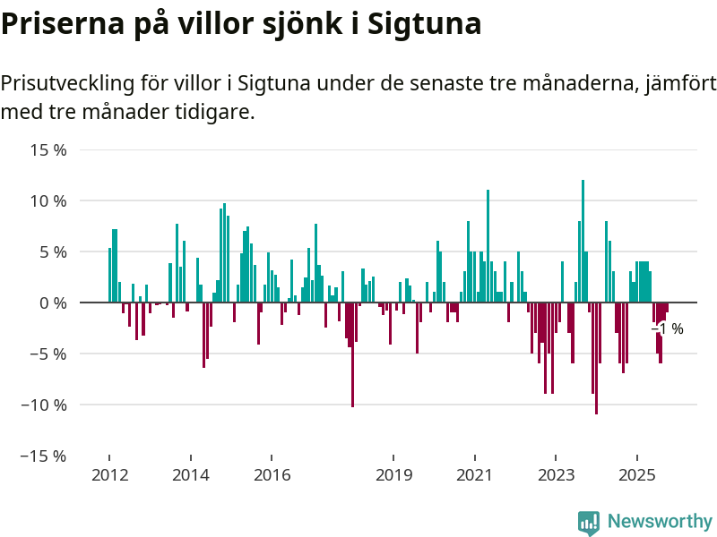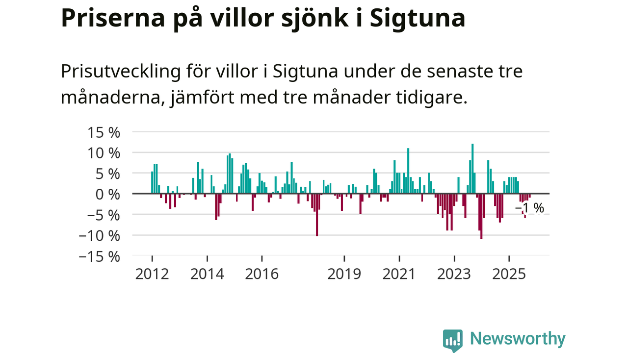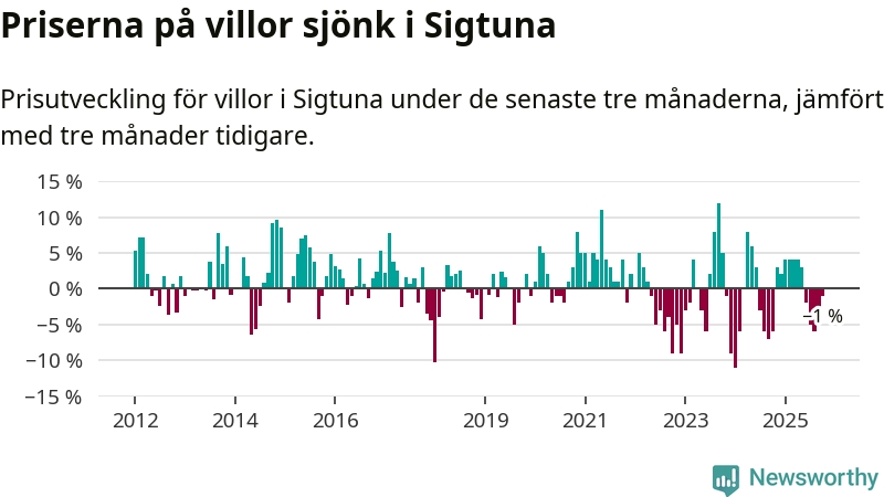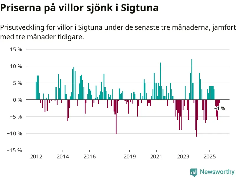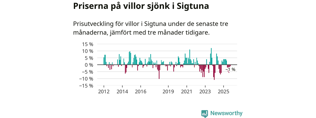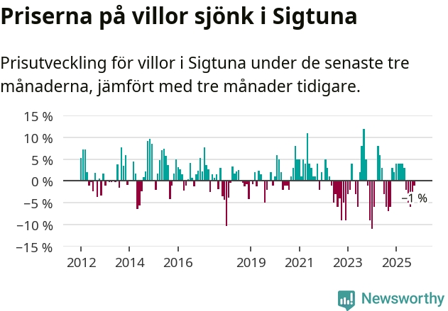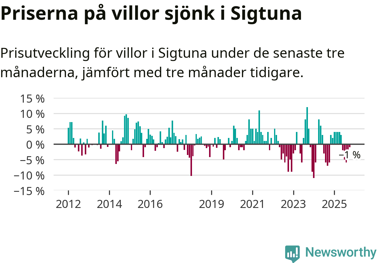Villapriserna har gått ner i Sigtuna kommun. Medelpriset på försäljningarna under de senaste tre månaderna visar på en nedgång med 1 procent.
