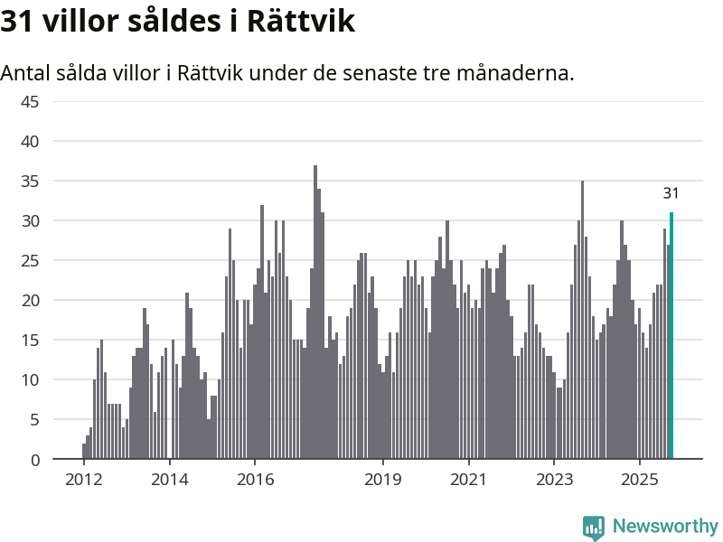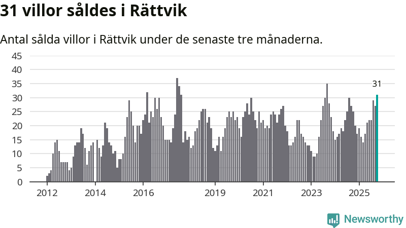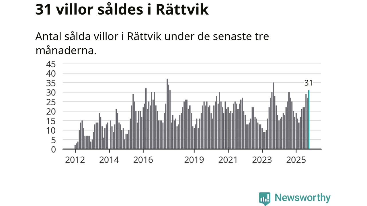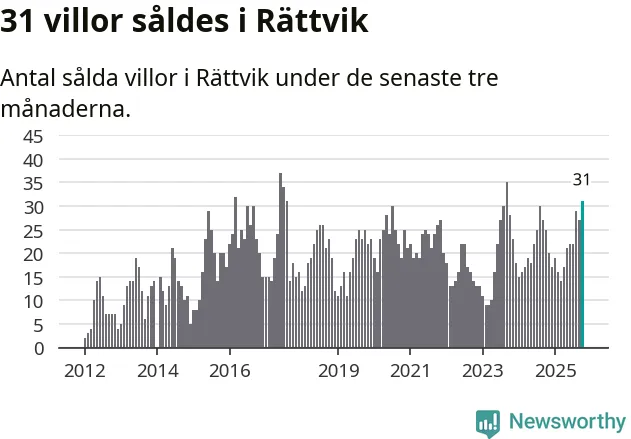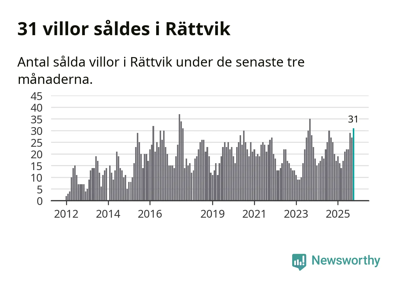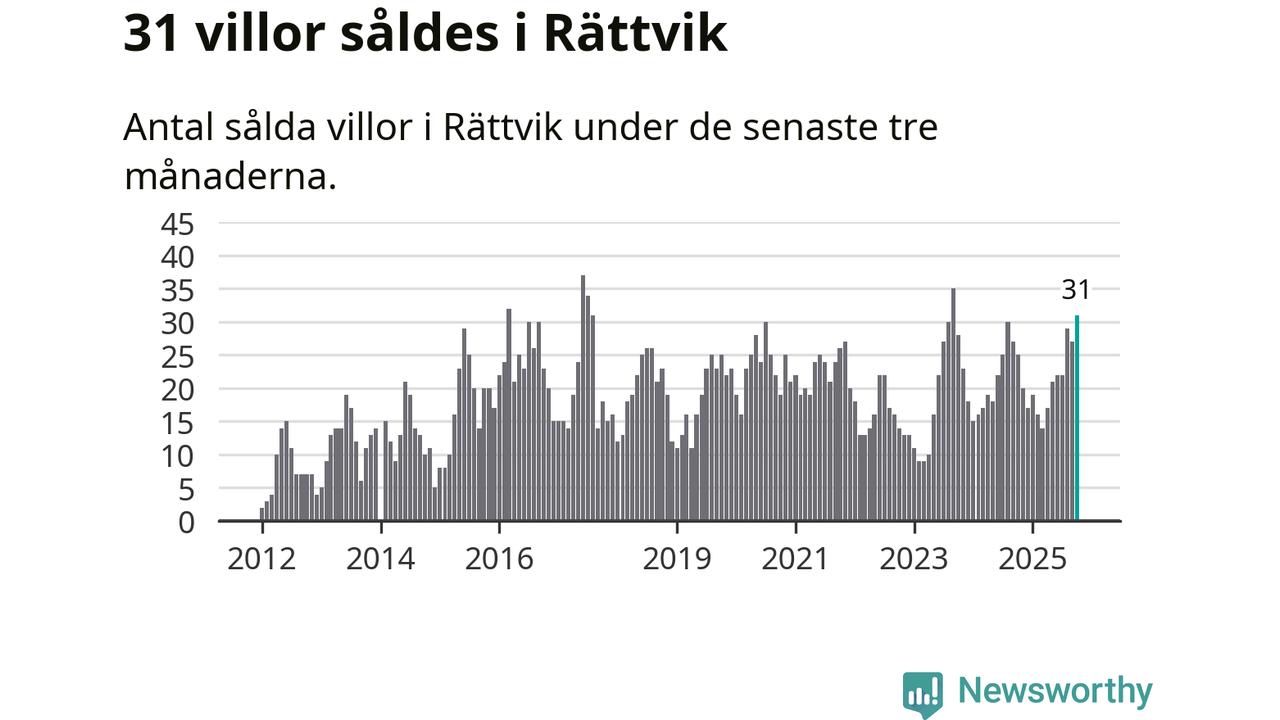 Mellan augusti och oktober såldes 31 villor i Rättviks kommun. Det är relativt många sett till aktiviteten på bostadsmarknaden i kommunen under de senaste tolv månaderna, samt det historiska snittet för den här tiden på året.