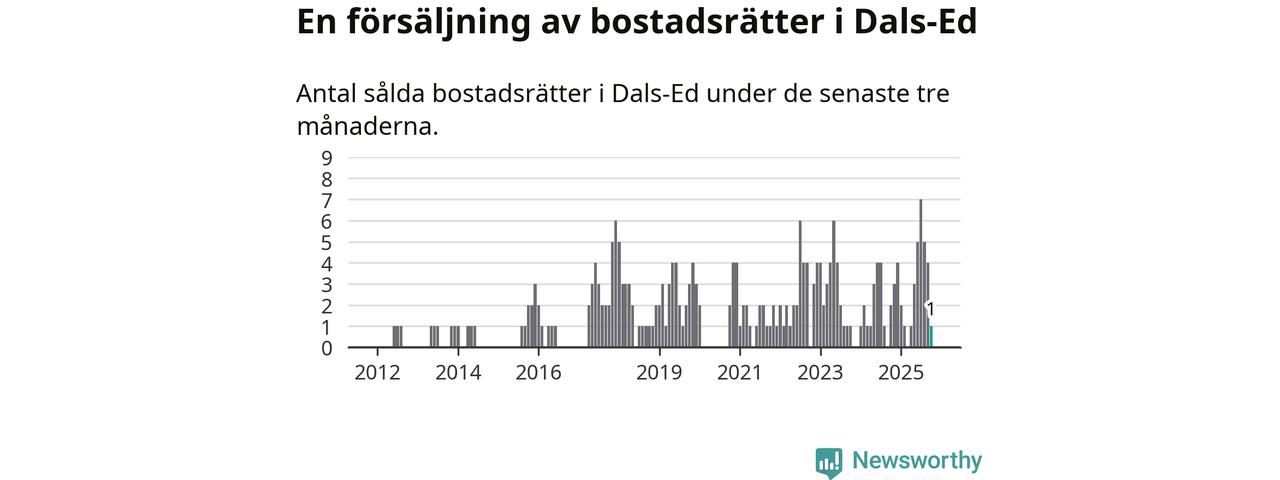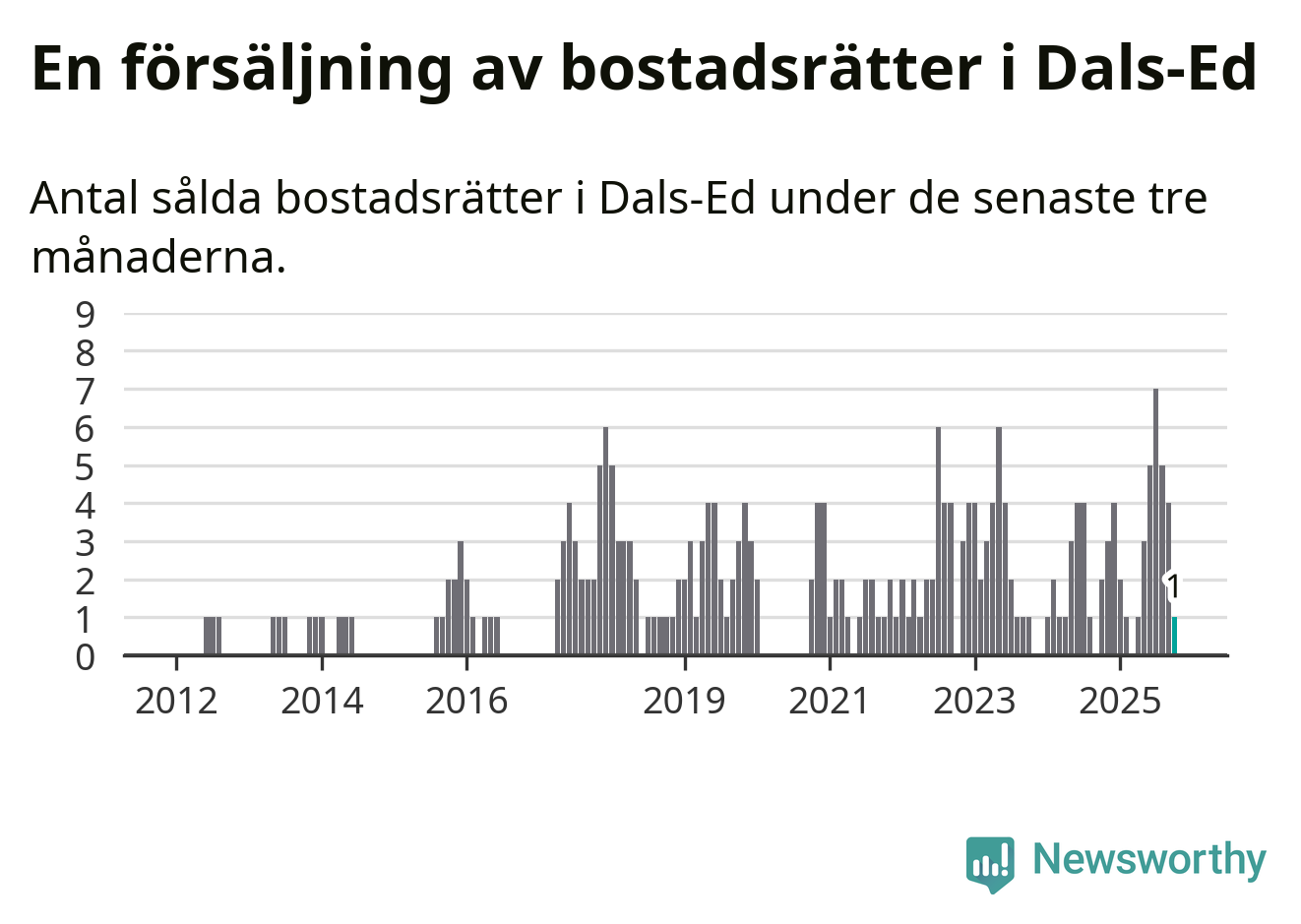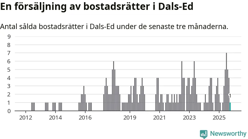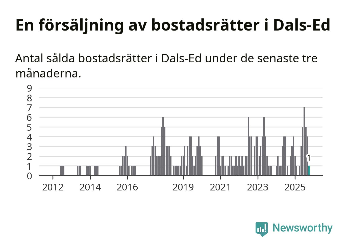 Mellan augusti och oktober gjordes sammanlagt en affär med bostadsrätter i Dals-Eds kommun. Det kan jämföras med två vid motsvarande tid i fjol.