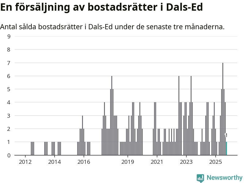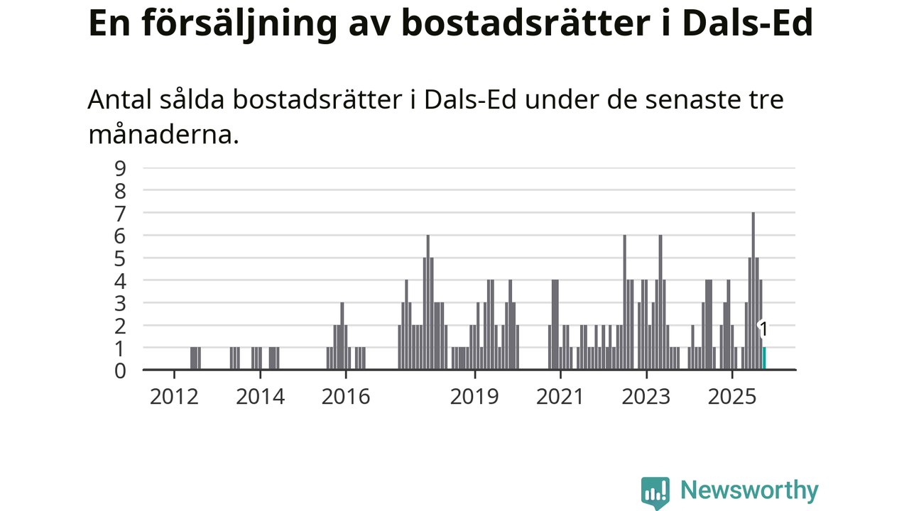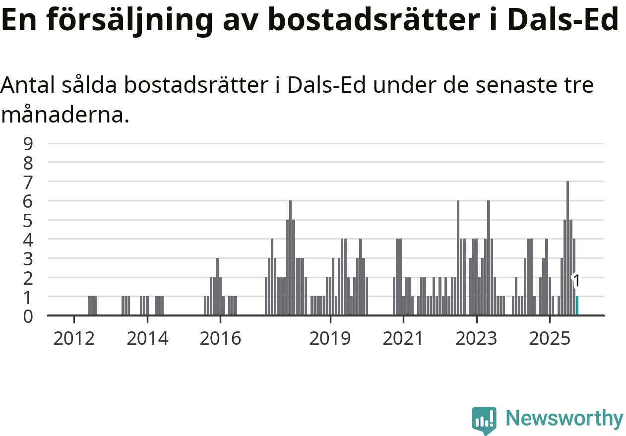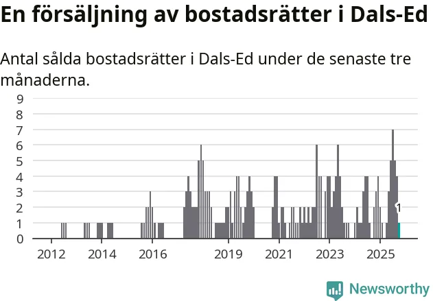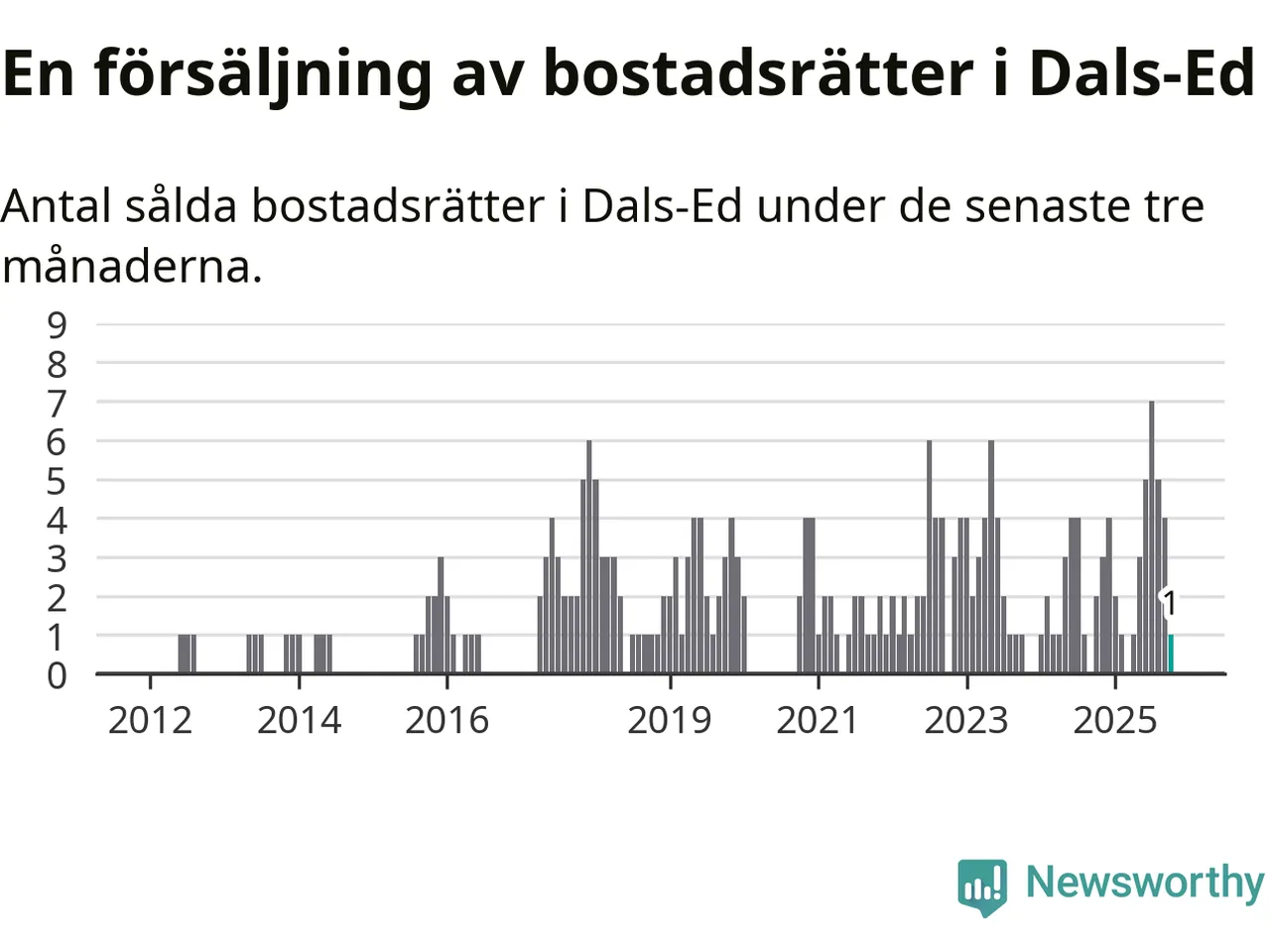 Mellan augusti och oktober gjordes sammanlagt en affär med bostadsrätter i Dals-Eds kommun. Det kan jämföras med två vid motsvarande tid i fjol.