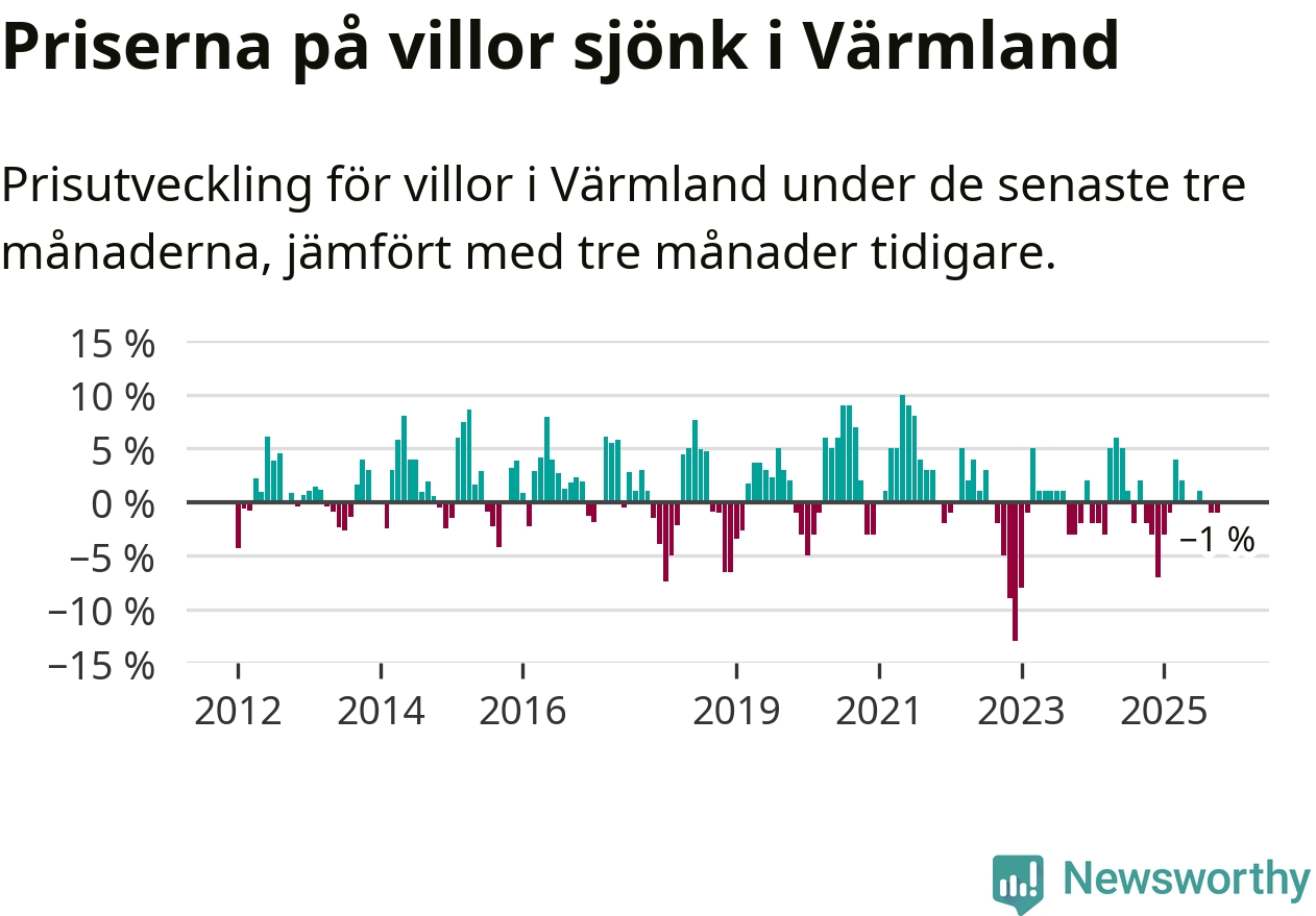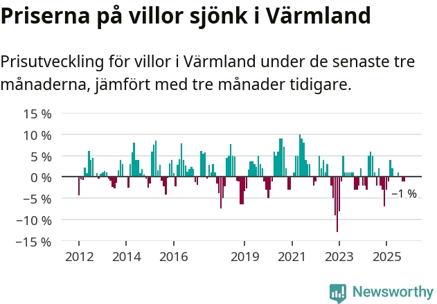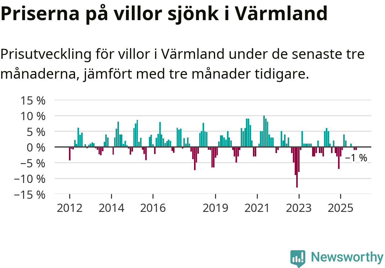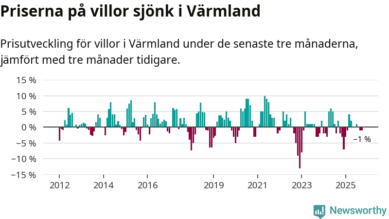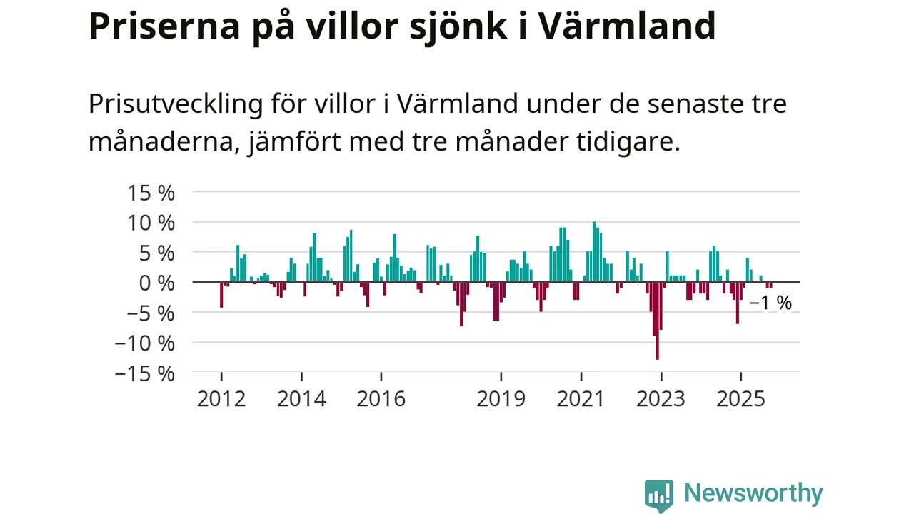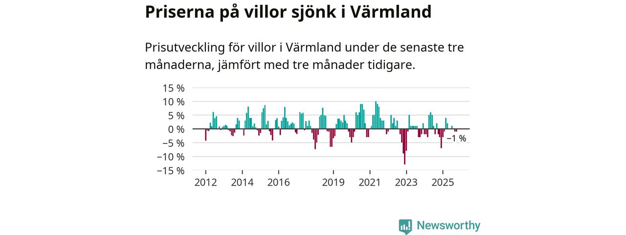 Villapriserna har gått ner i Värmlands län. Medelpriset på försäljningarna under de senaste tre månaderna visar på en nedgång med 1 procent.
