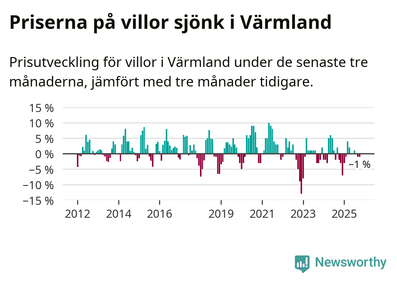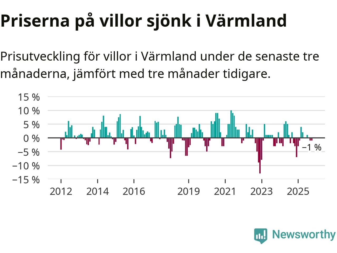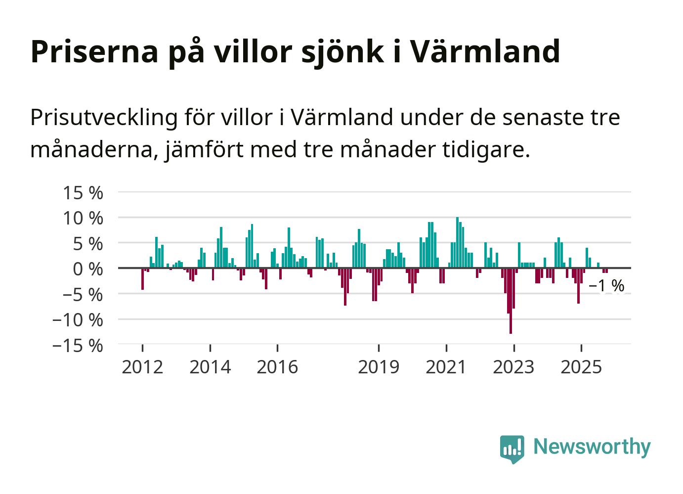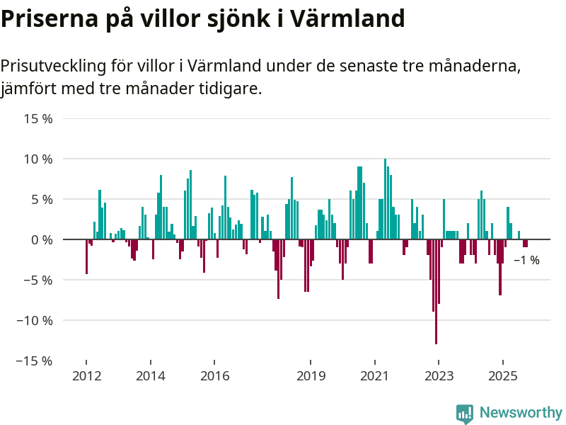 Villapriserna har gått ner i Värmlands län. Medelpriset på försäljningarna under de senaste tre månaderna visar på en nedgång med 1 procent.