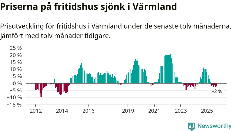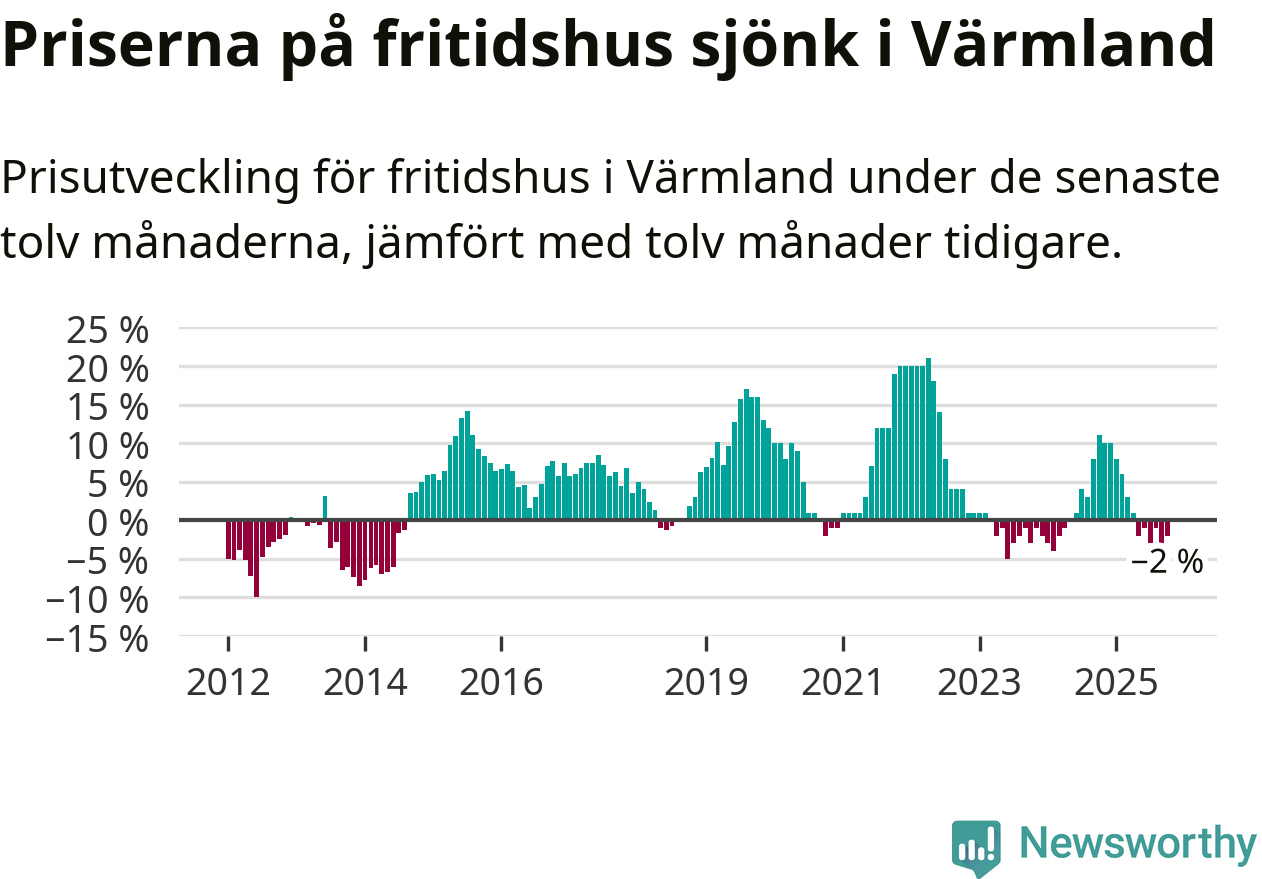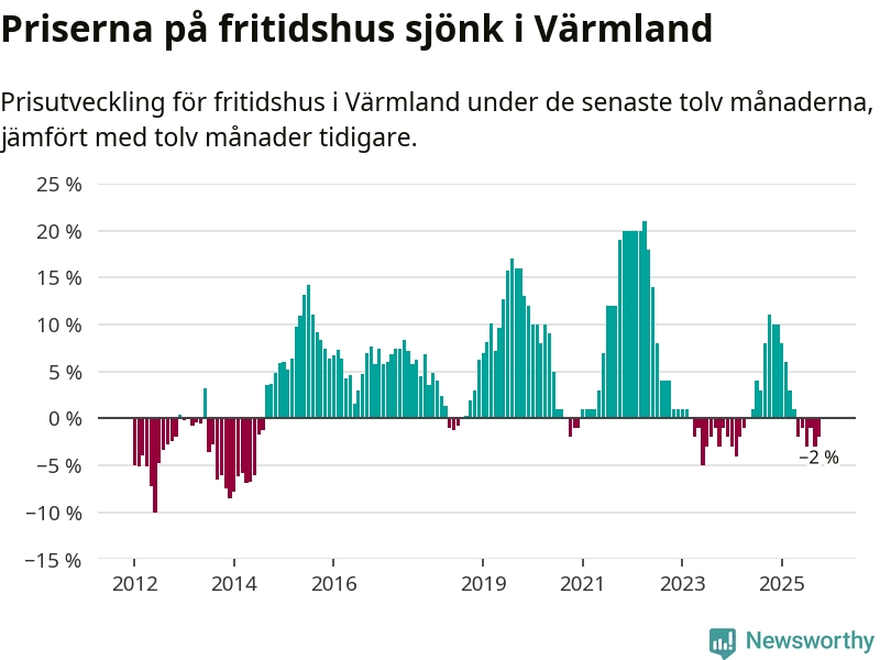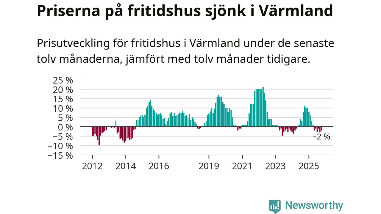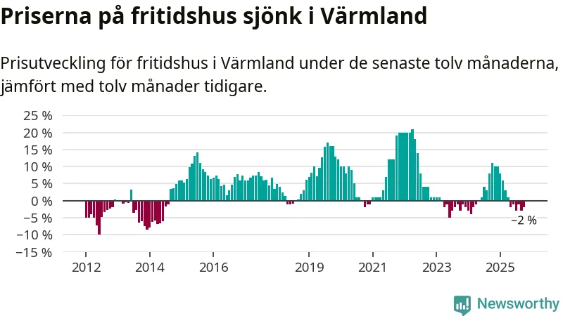Priserna på fritidshus har gått ner i Värmlands län. Medelpriset på försäljningarna under de senaste tolv månaderna visar på en nedgång med 2 procent.