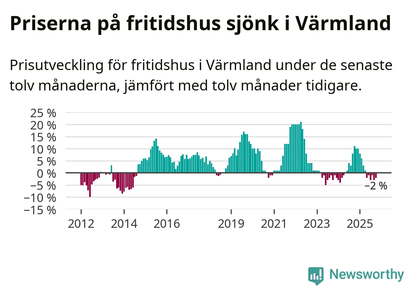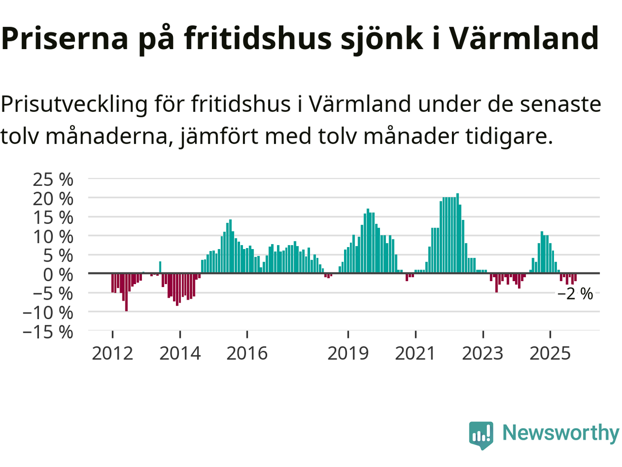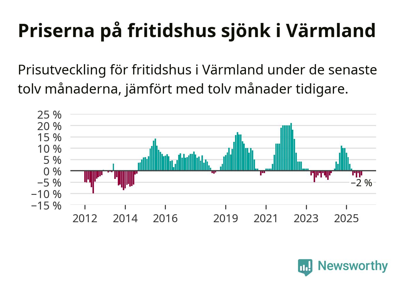 Priserna på fritidshus har gått ner i Värmlands län. Medelpriset på försäljningarna under de senaste tolv månaderna visar på en nedgång med 2 procent.