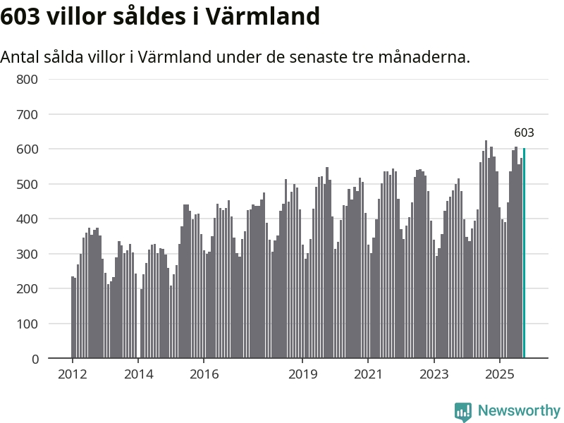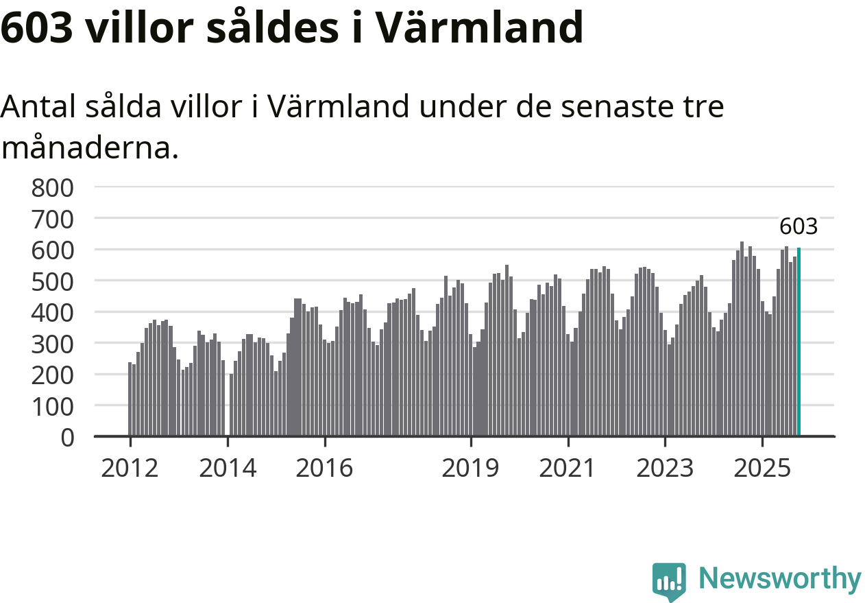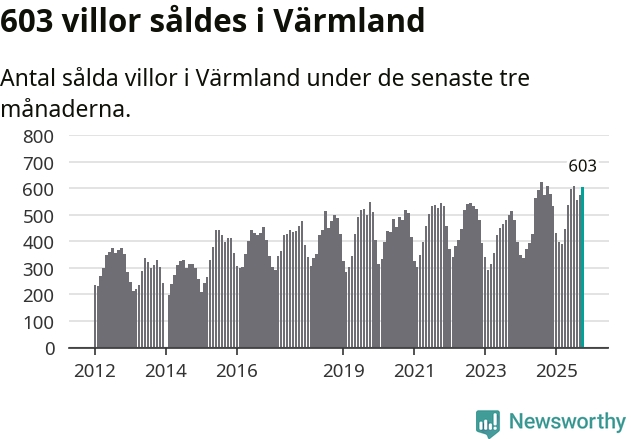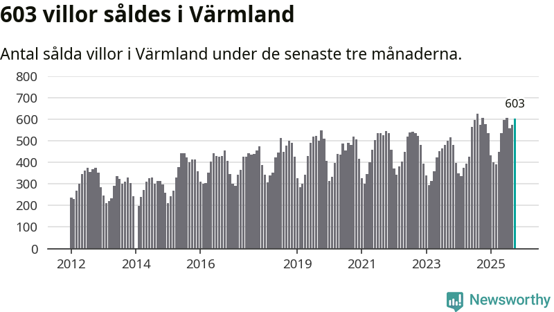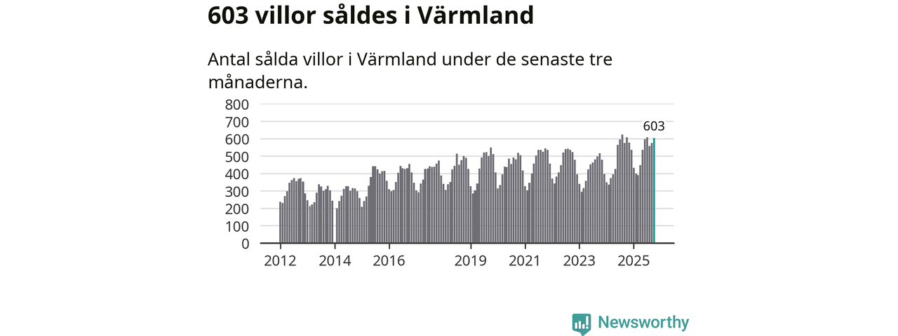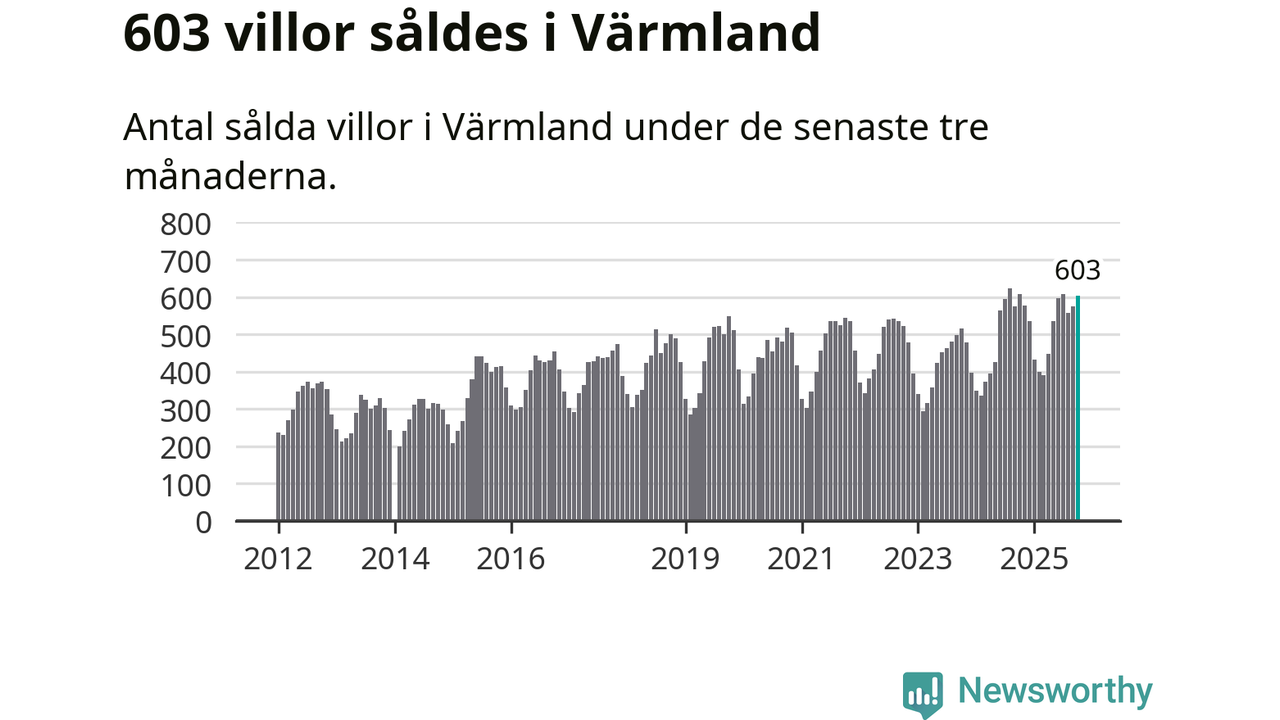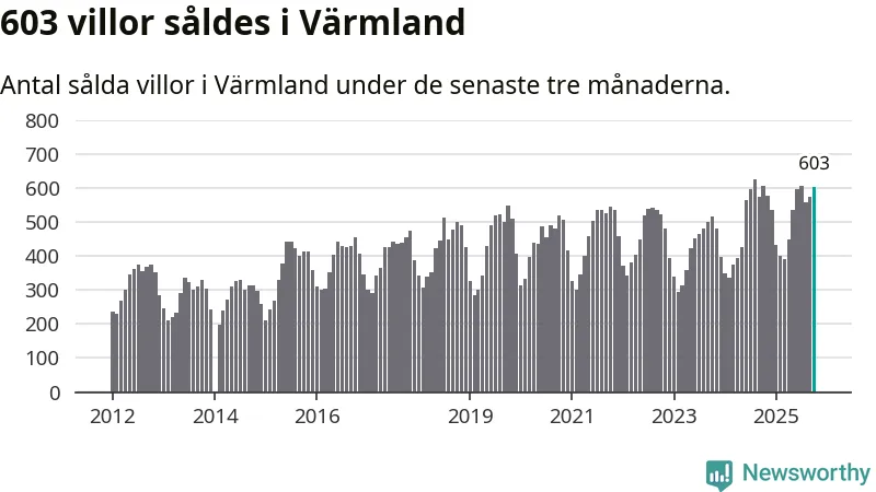 Sammanlagt såldes 603 villor i Värmlands län mellan augusti och oktober till ett genomsnittligt pris på 2,2 miljoner kronor. I fjol gjordes 607 affärer vid den här tiden på året.
