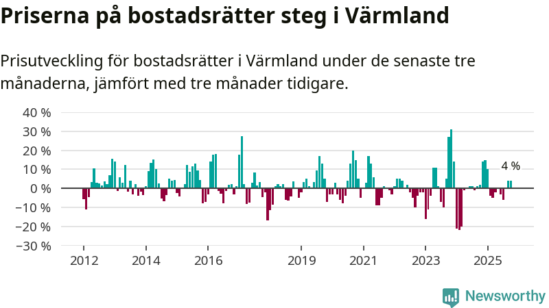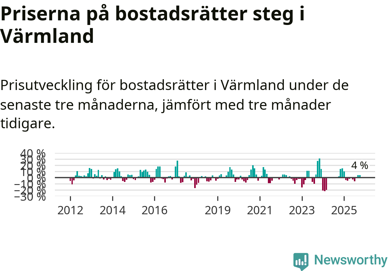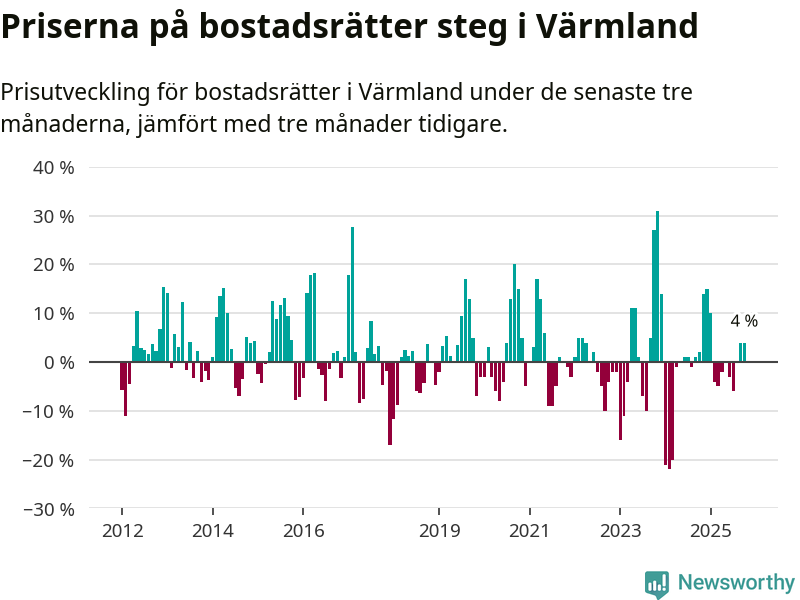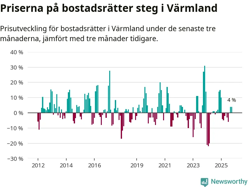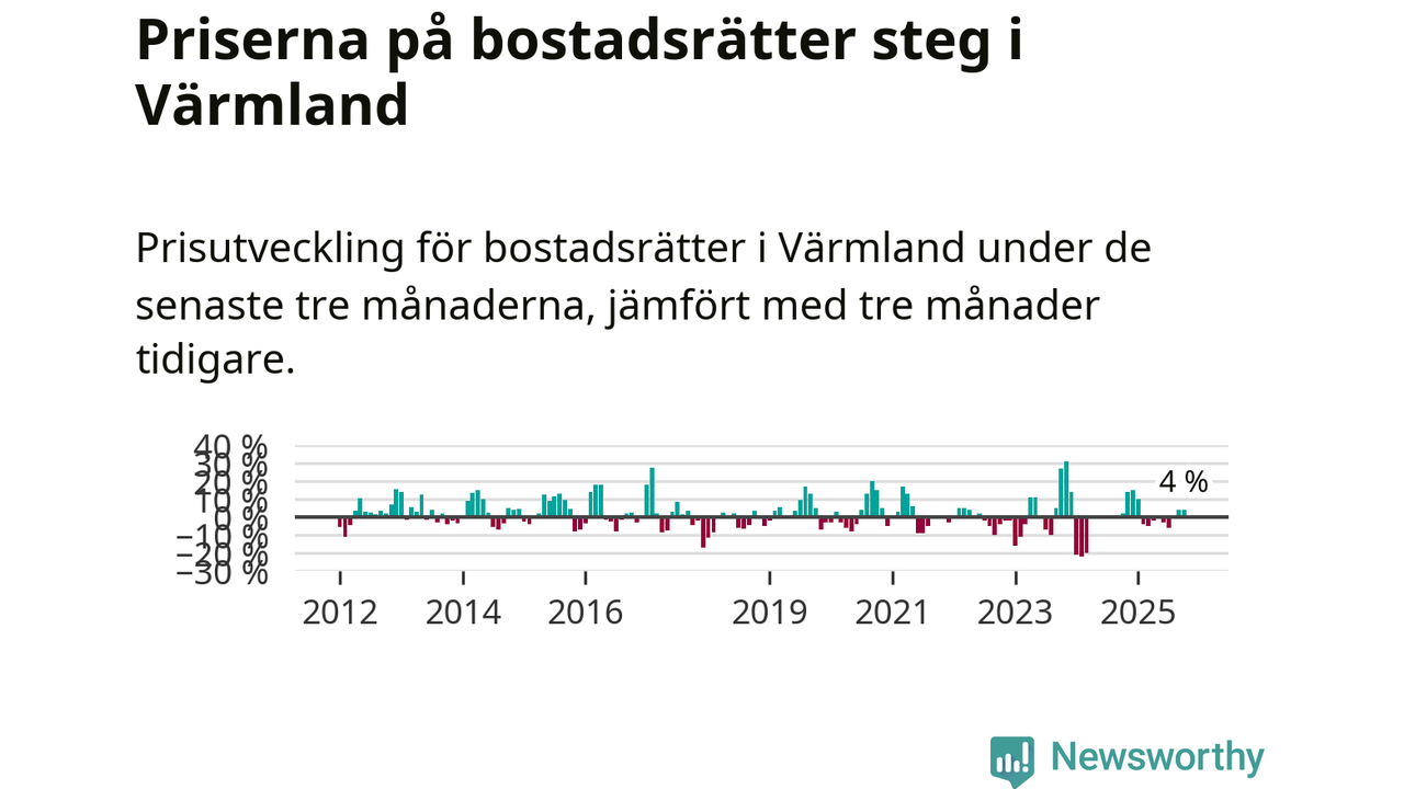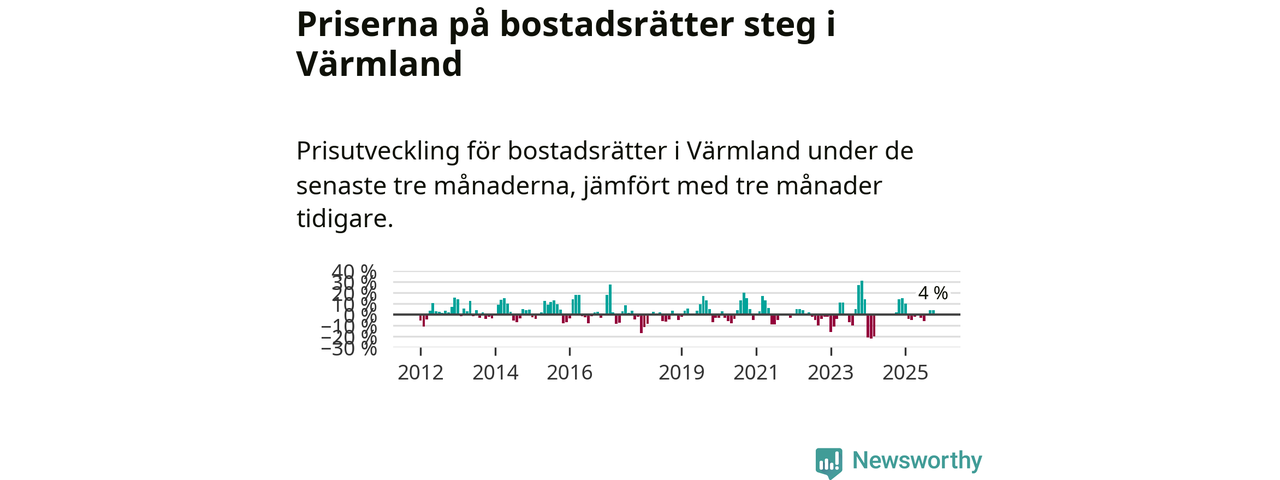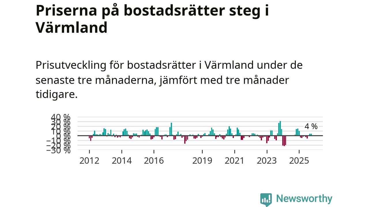 Priserna på bostadsrätter har gått upp i Värmlands län. Medelpriset på försäljningarna under de senaste tre månaderna visar på en uppgång med 4 procent.
