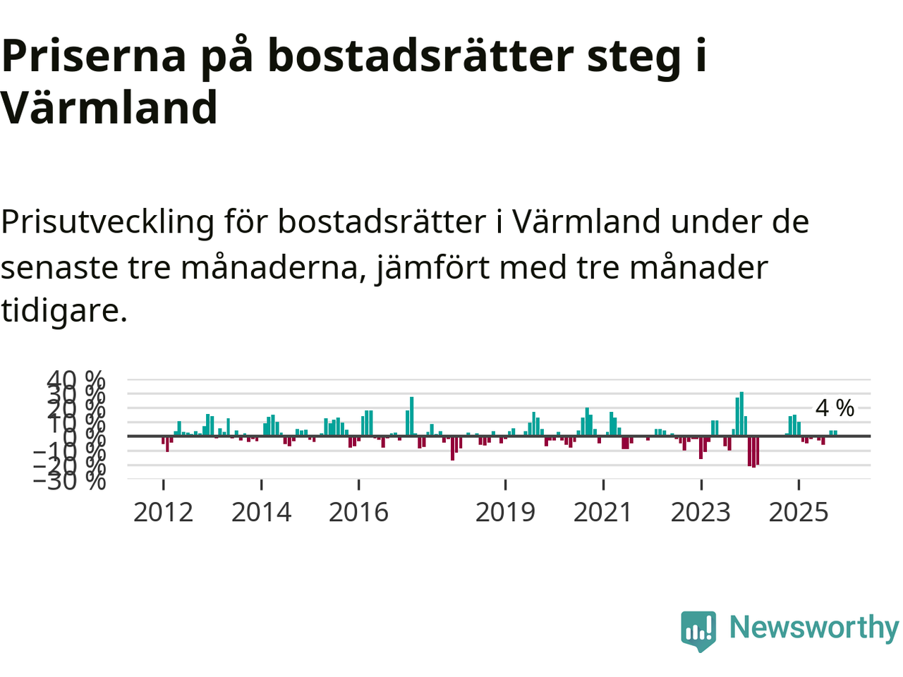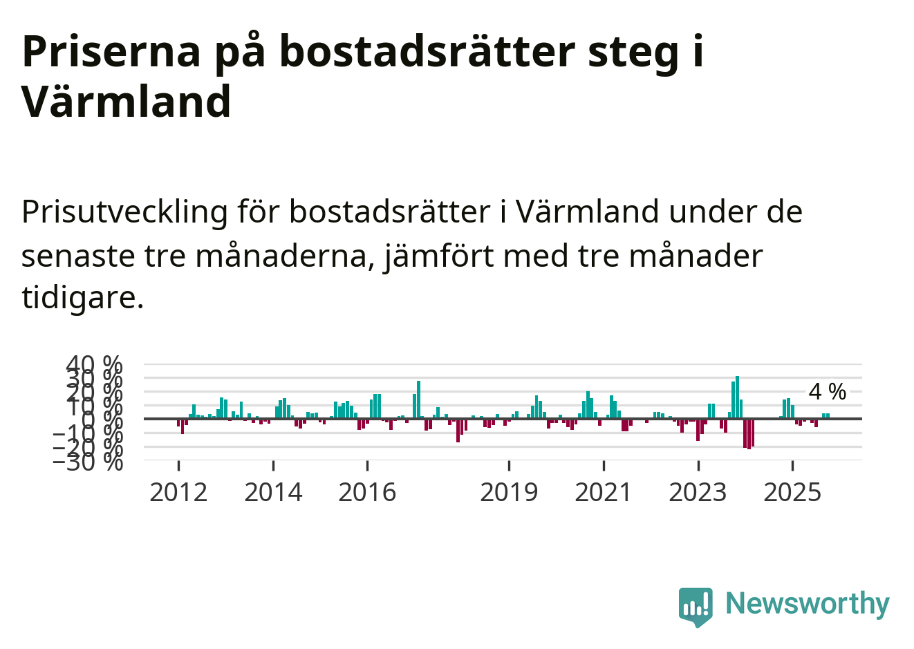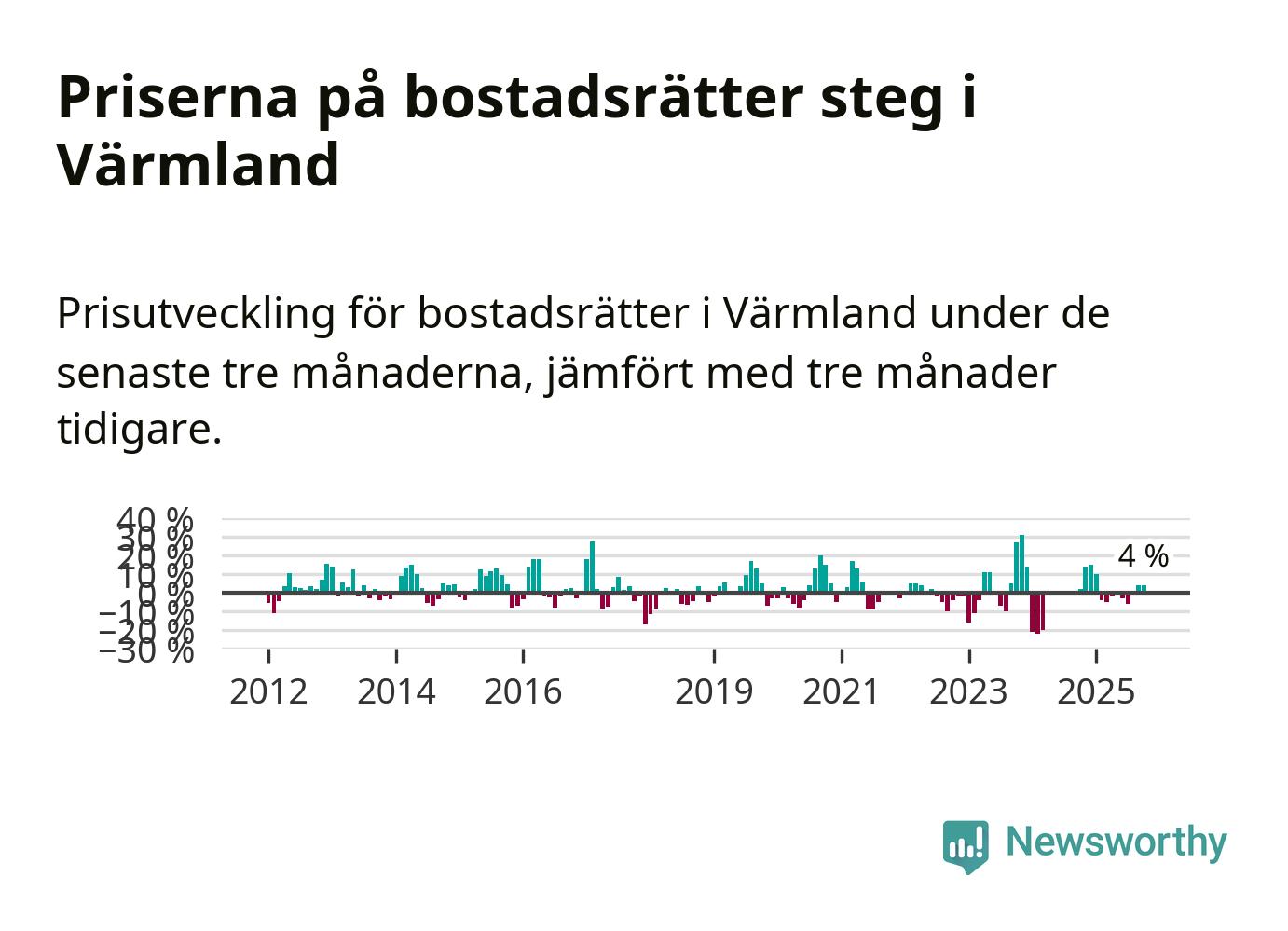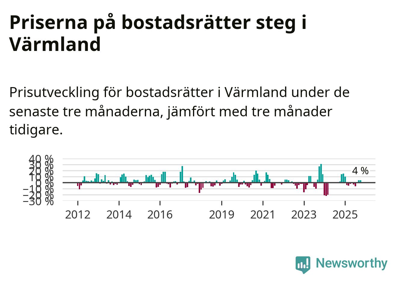 Priserna på bostadsrätter har gått upp i Värmlands län. Medelpriset på försäljningarna under de senaste tre månaderna visar på en uppgång med 4 procent.