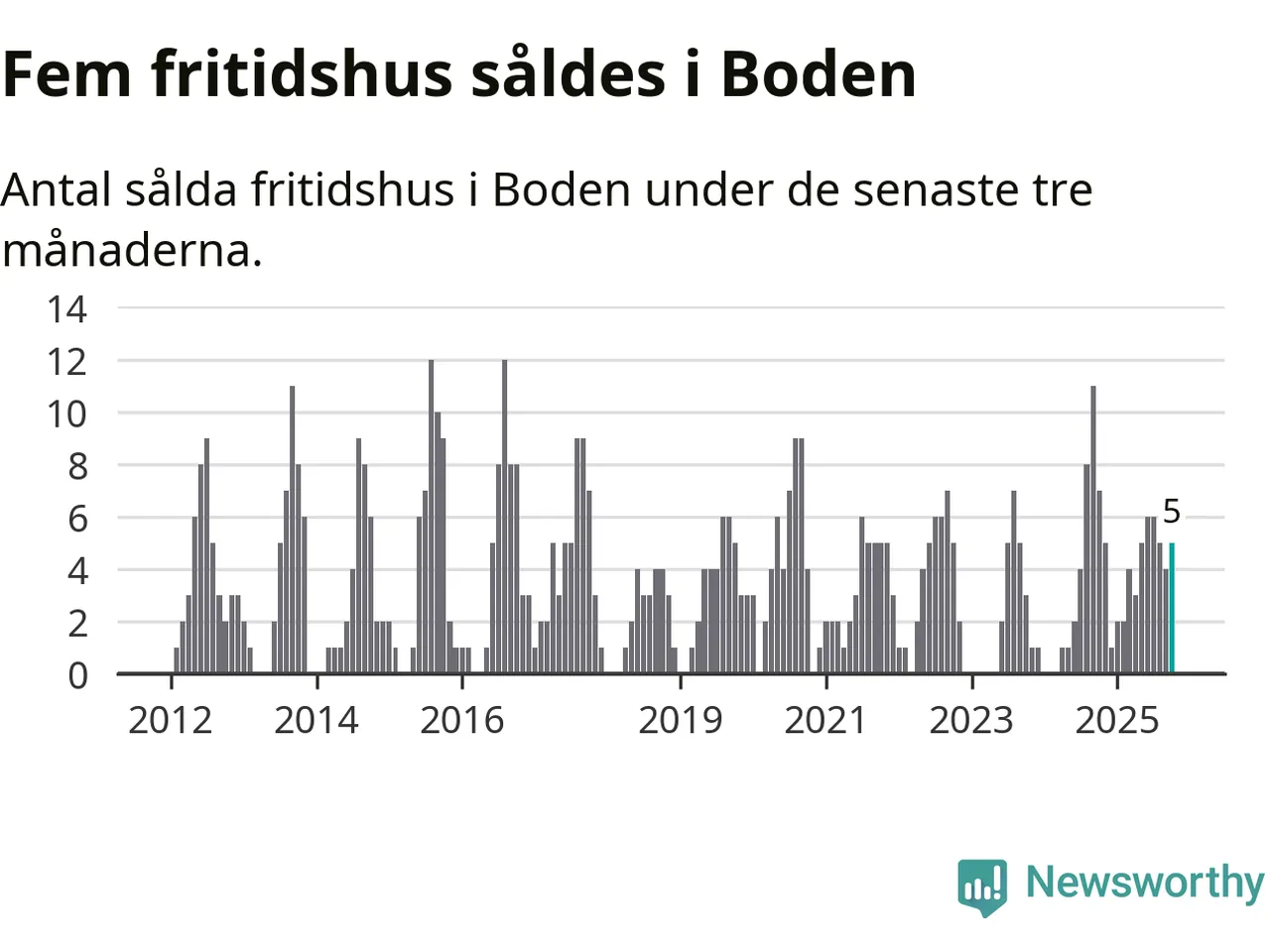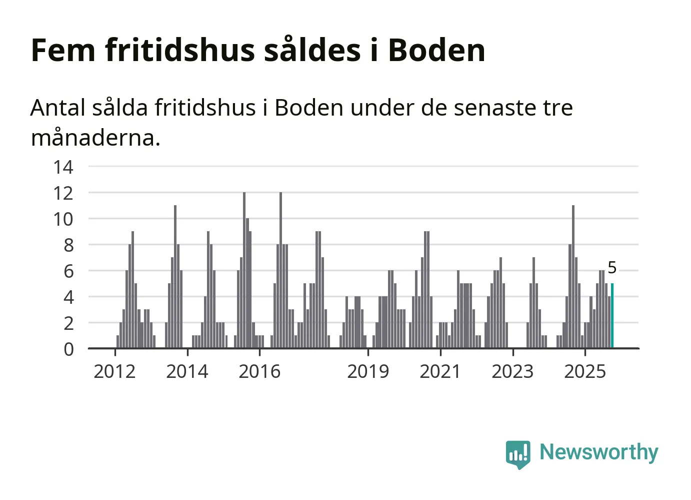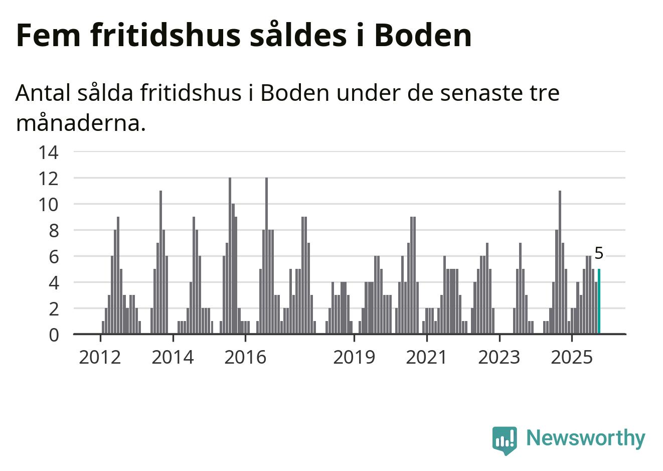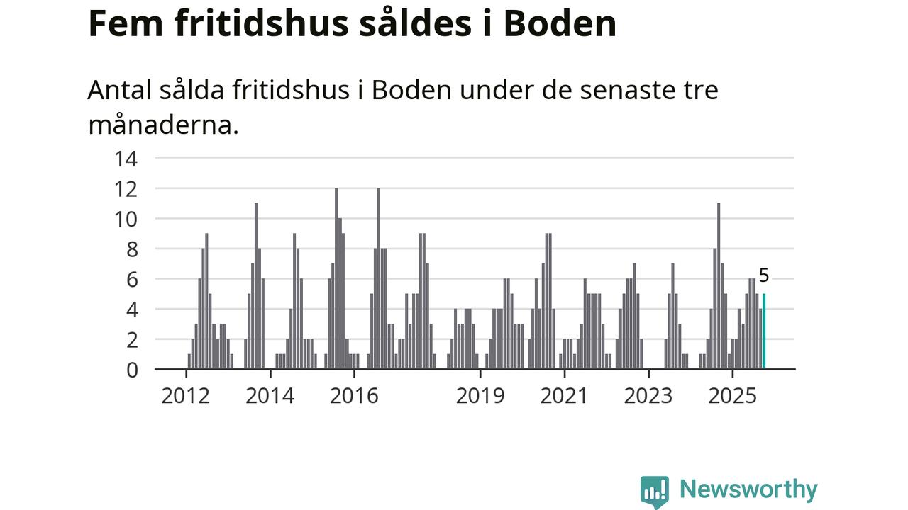 Mellan augusti och oktober gjordes sammanlagt fem affärer med fritidshus i Bodens kommun. Det kan jämföras med sju vid motsvarande tid i fjol.