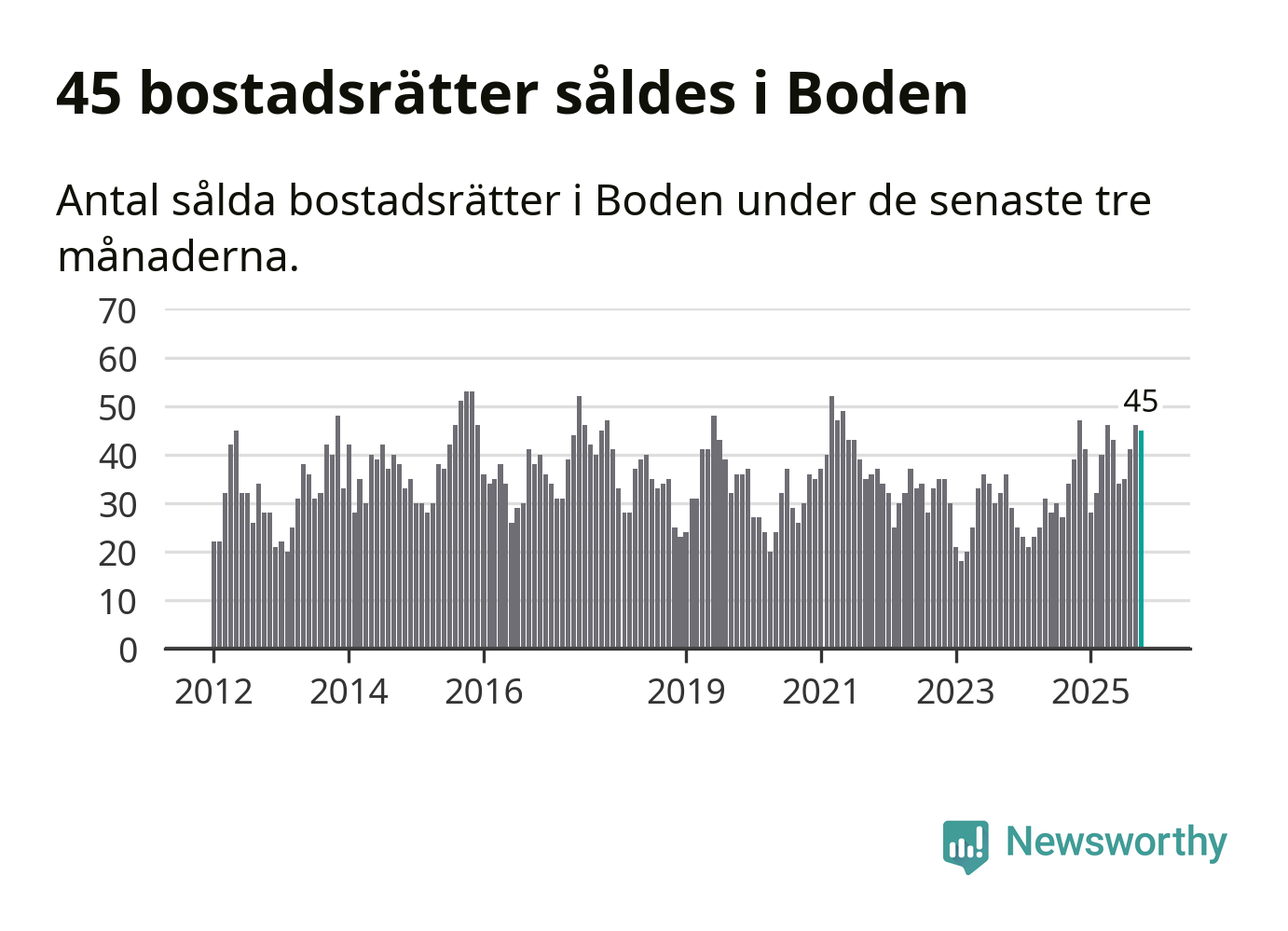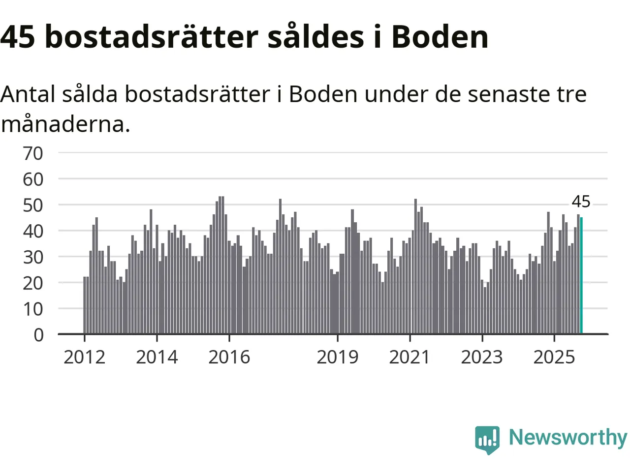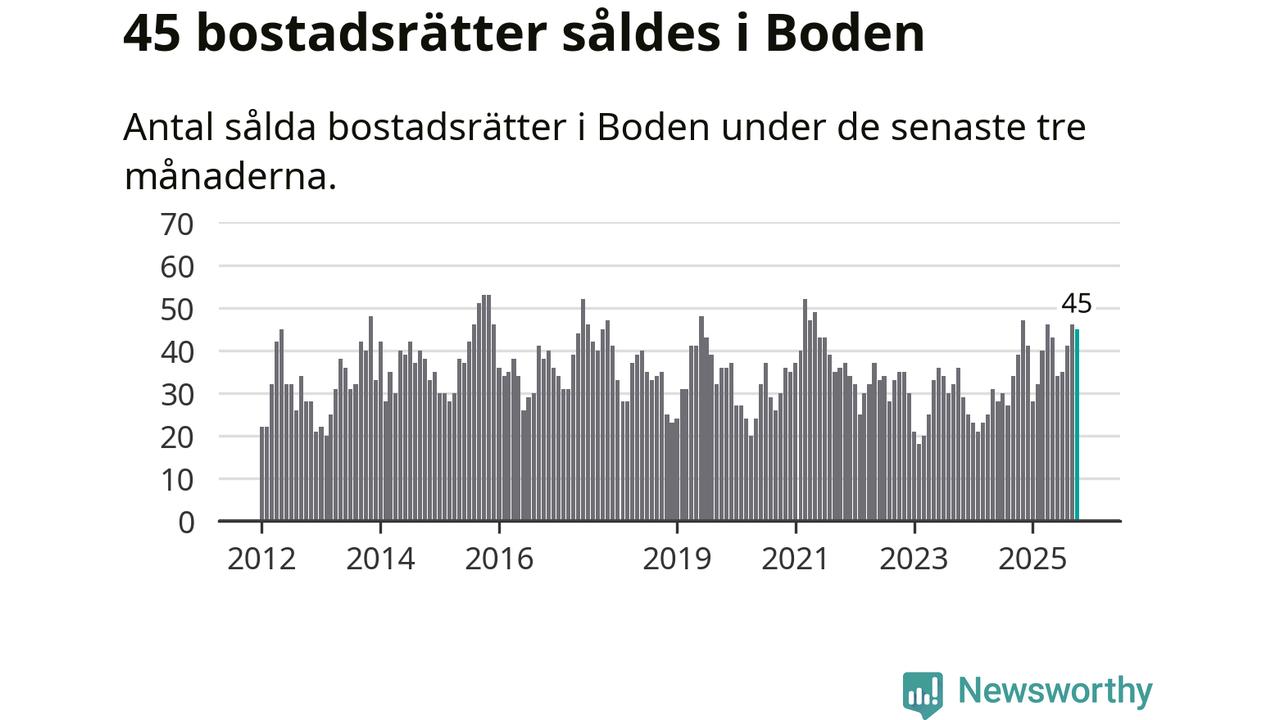 Sammanlagt såldes 45 bostadsrätter i Bodens kommun mellan augusti och oktober till ett genomsnittligt pris på 1,2 miljoner kronor. I fjol gjordes 39 affärer vid den här tiden på året.