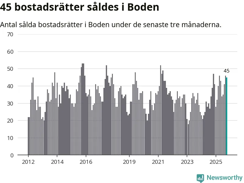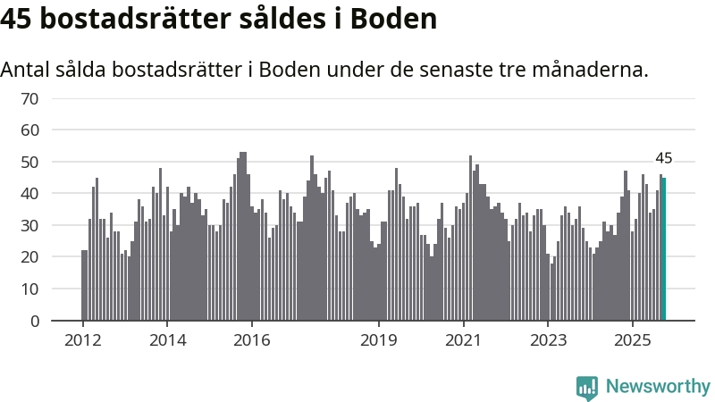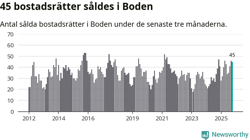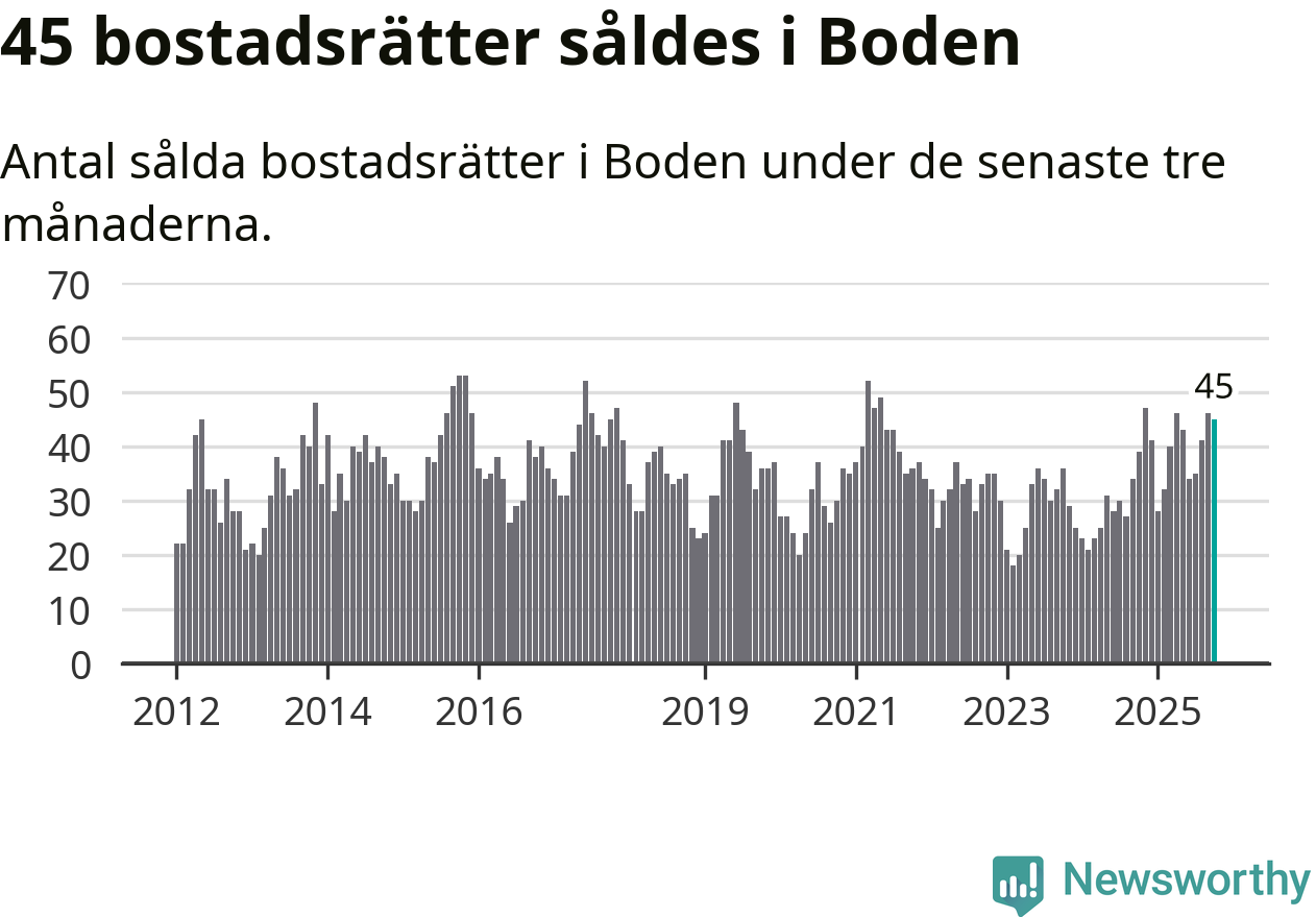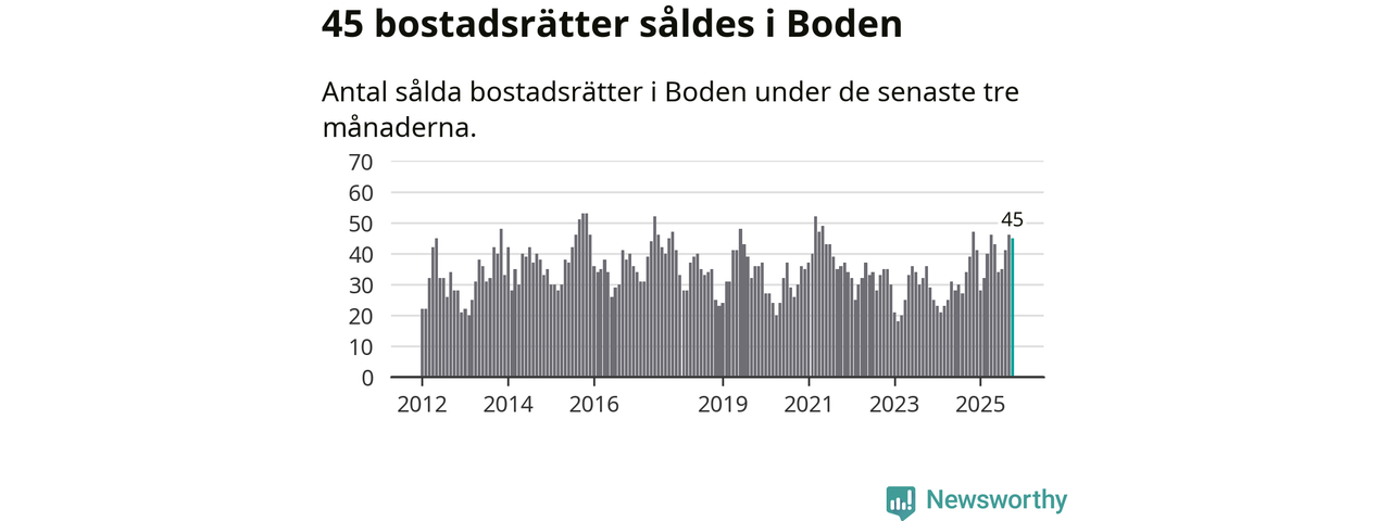 Sammanlagt såldes 45 bostadsrätter i Bodens kommun mellan augusti och oktober till ett genomsnittligt pris på 1,2 miljoner kronor. I fjol gjordes 39 affärer vid den här tiden på året.