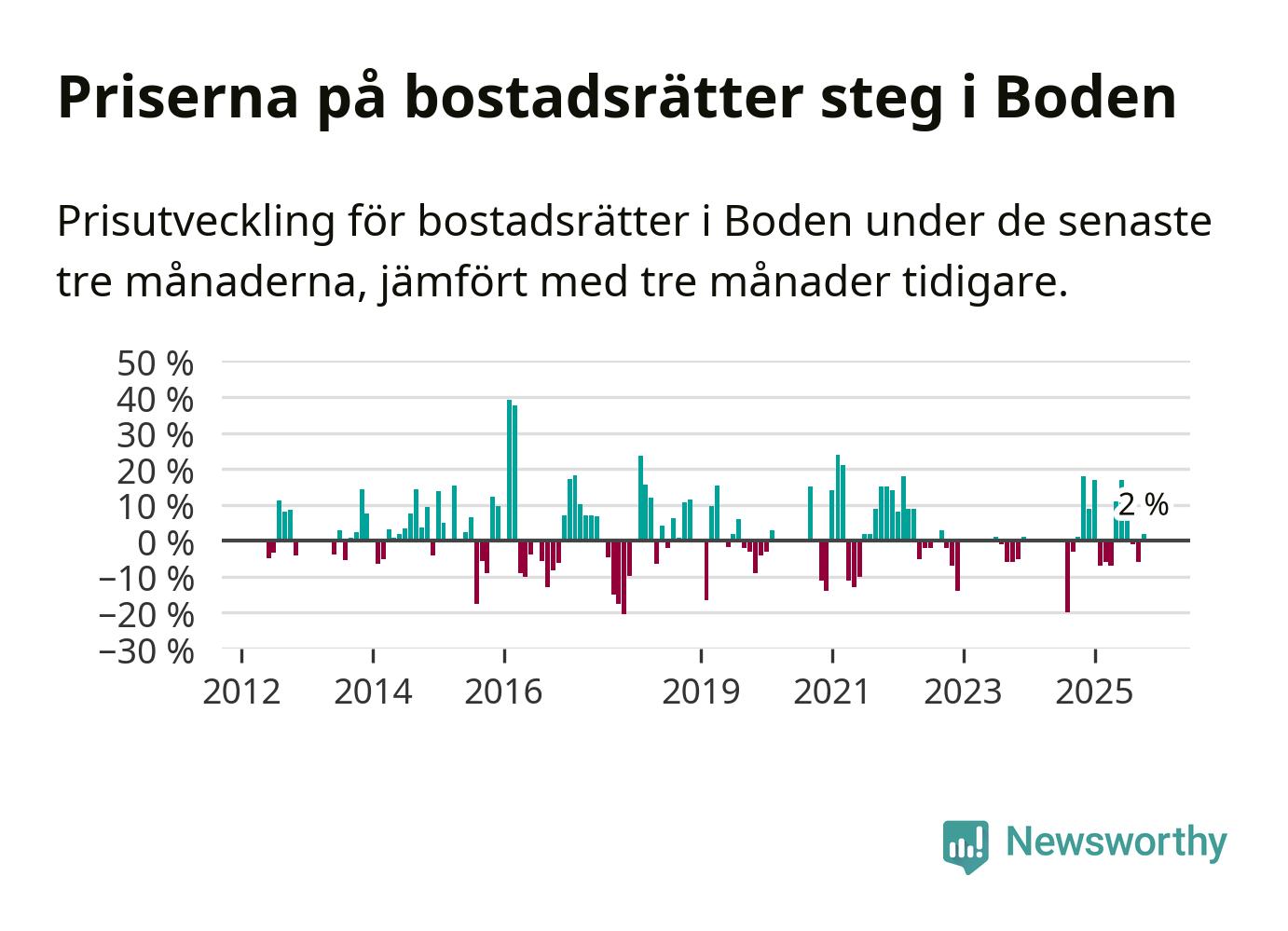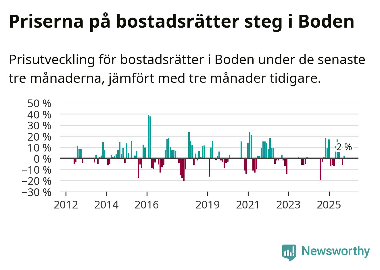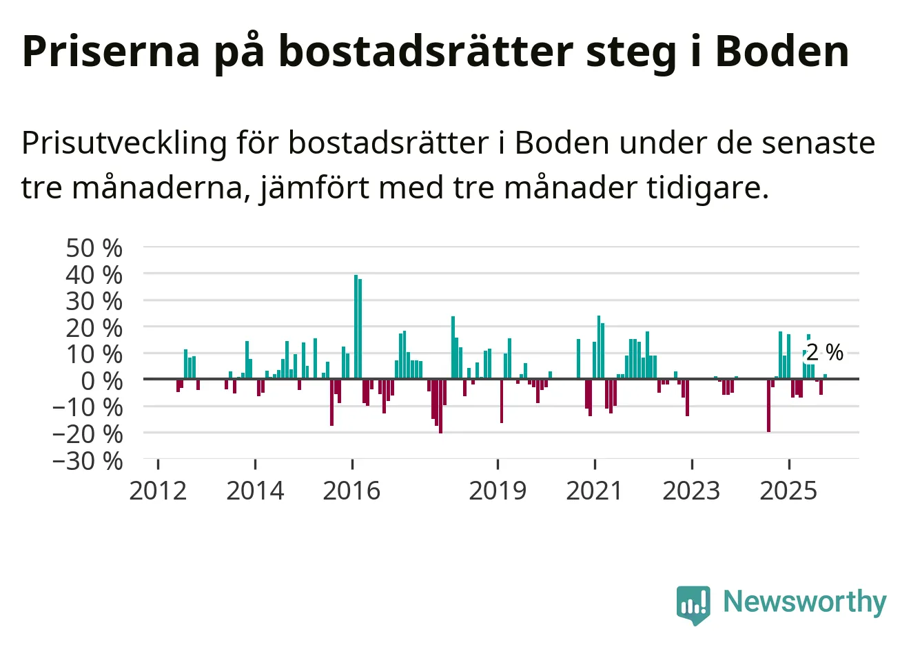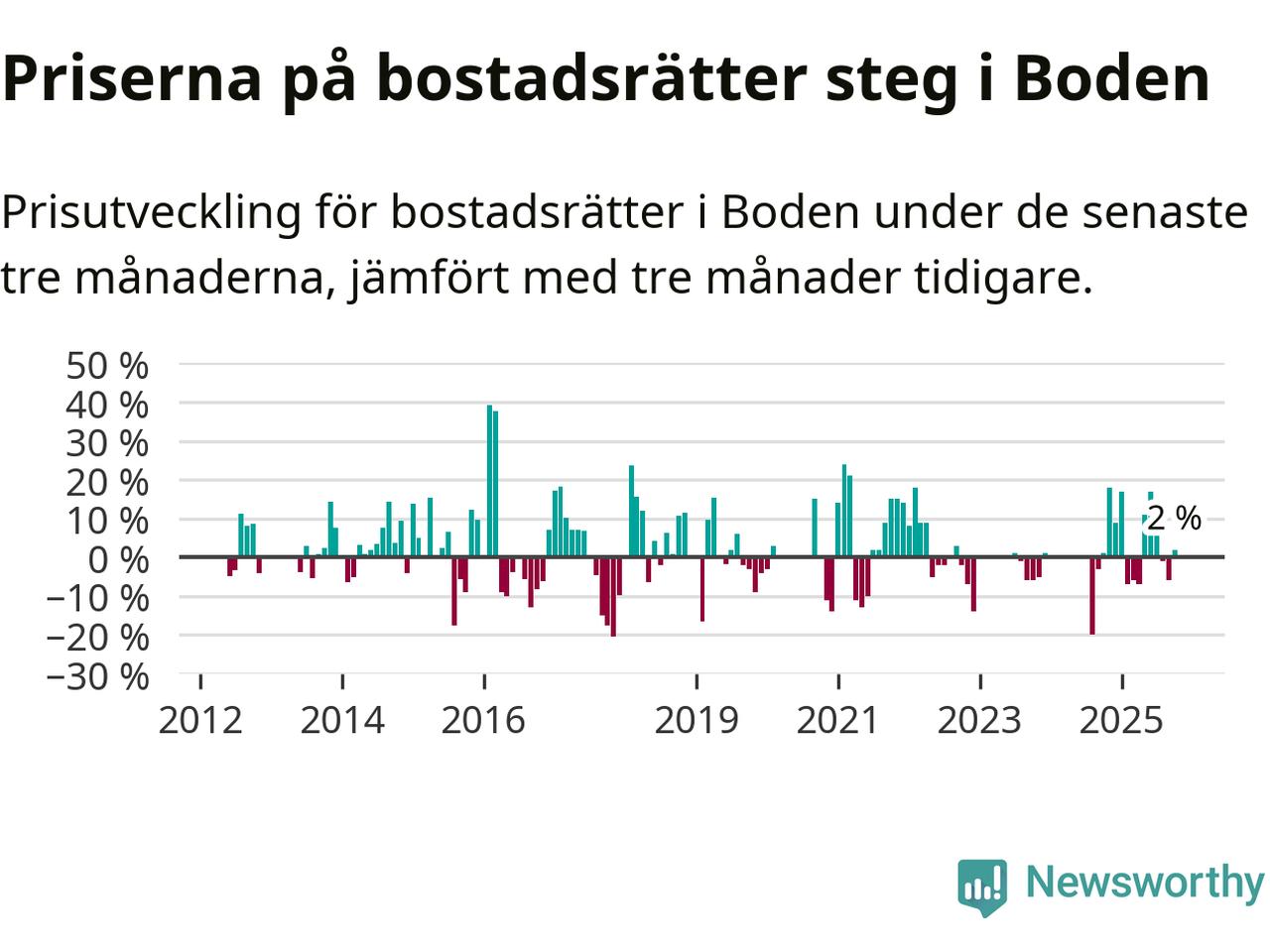 Priserna på bostadsrätter har gått upp i Bodens kommun. Medelpriset på försäljningarna under de senaste tre månaderna visar på en uppgång med 2 procent.