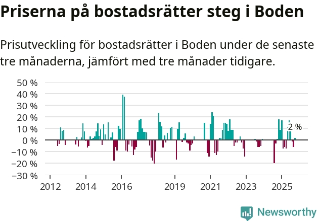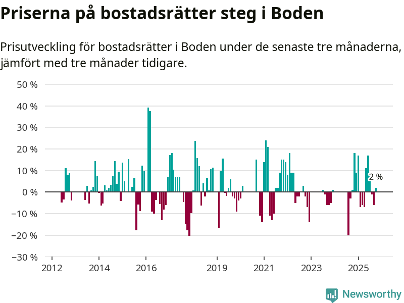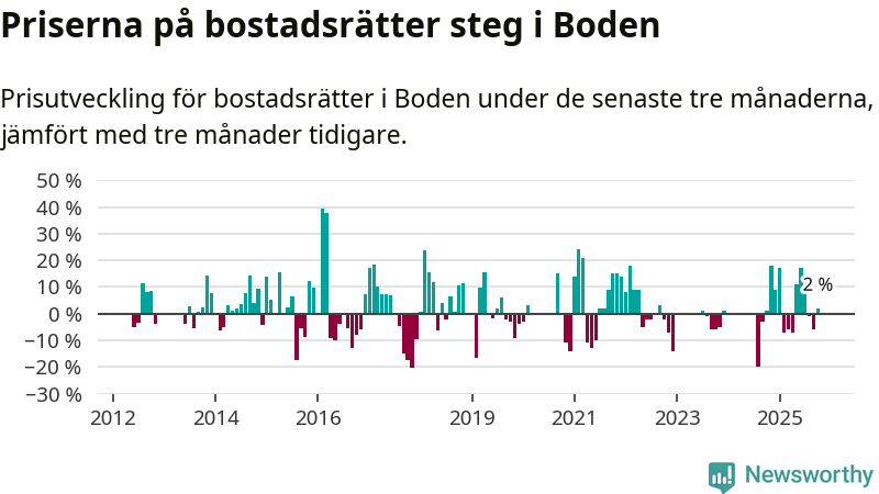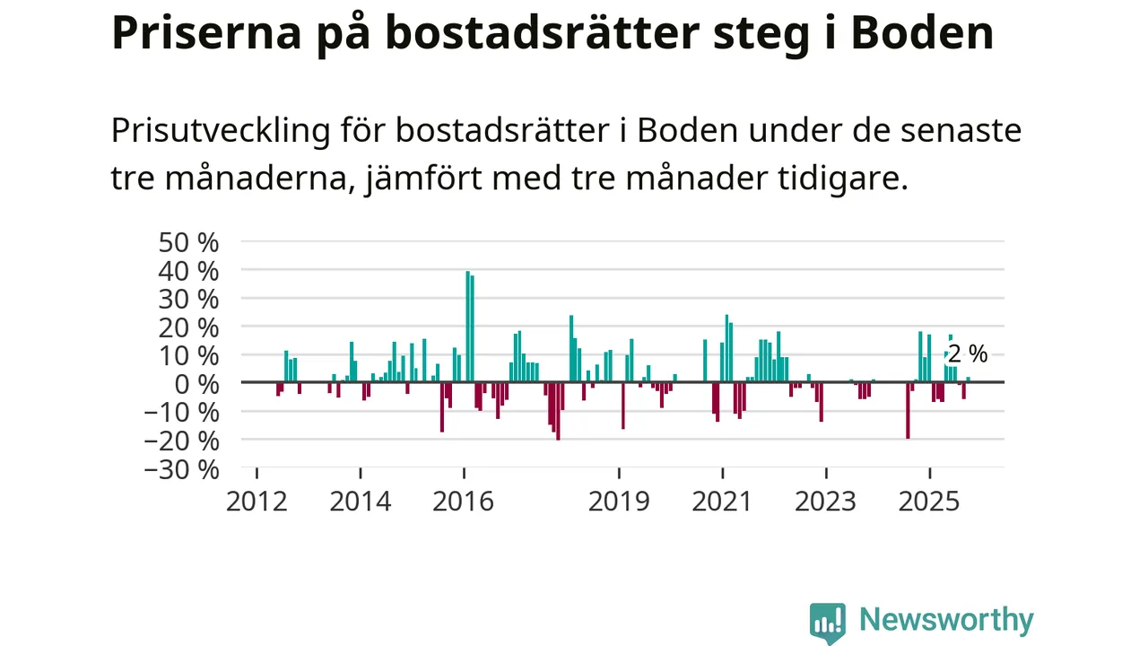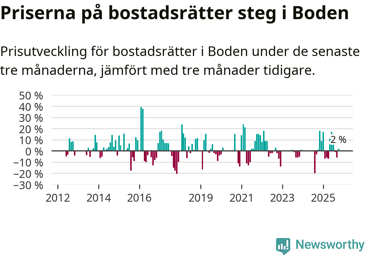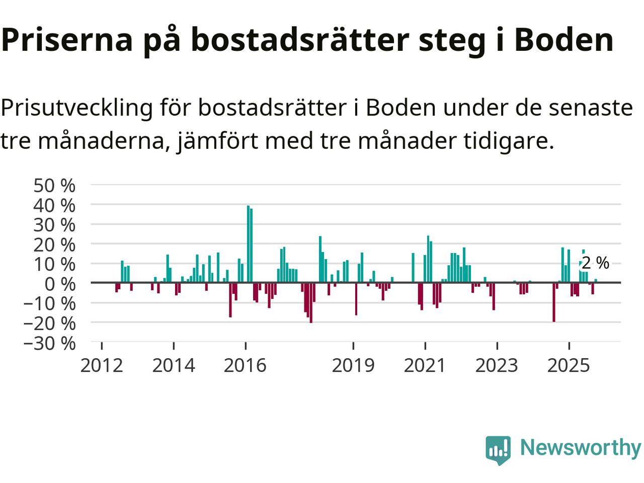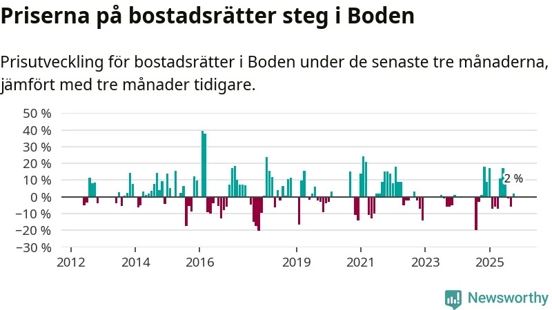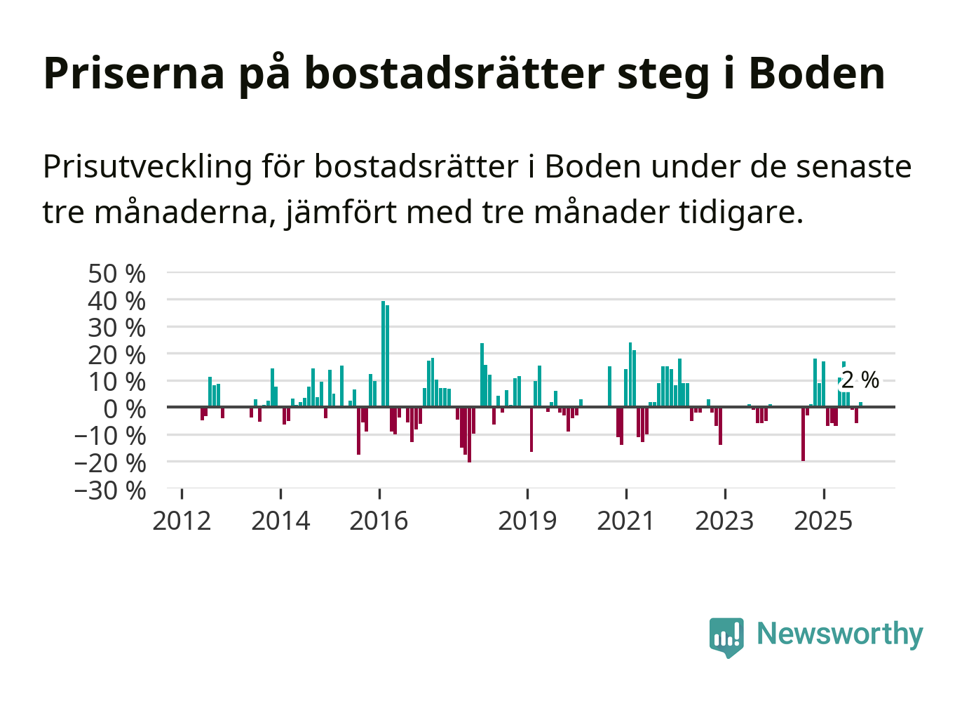 Priserna på bostadsrätter har gått upp i Bodens kommun. Medelpriset på försäljningarna under de senaste tre månaderna visar på en uppgång med 2 procent.