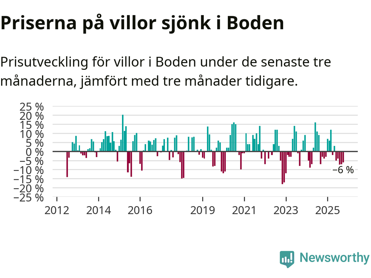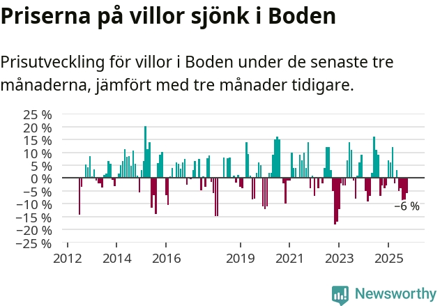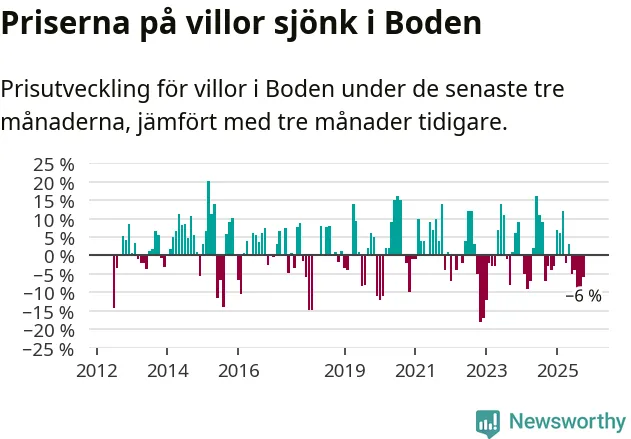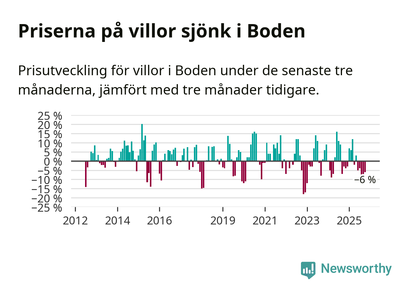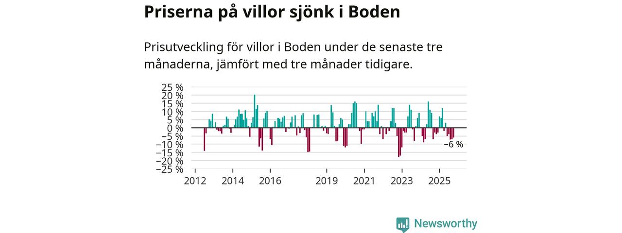Statistiken visar även på en kännbar prisnedgång i Bodens kommun. Medelpriset på försäljningarna av villor i kommunen var 6 procent lägre än för tre månader sedan. I hela Norrbotten däremot ökar villapriserna. I hela länet noterades en prisuppgång på 1 procent.