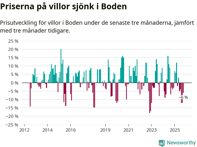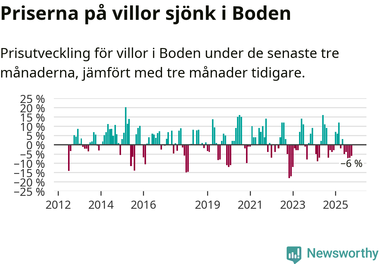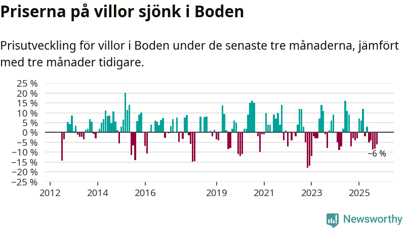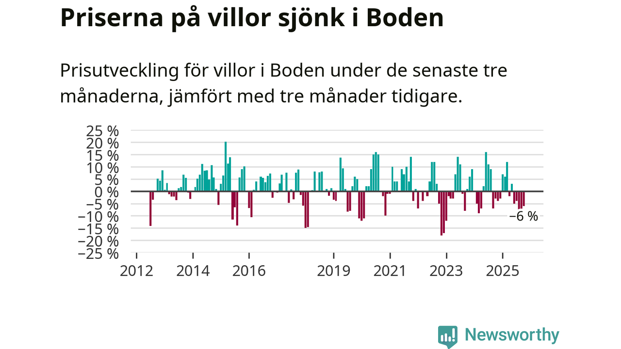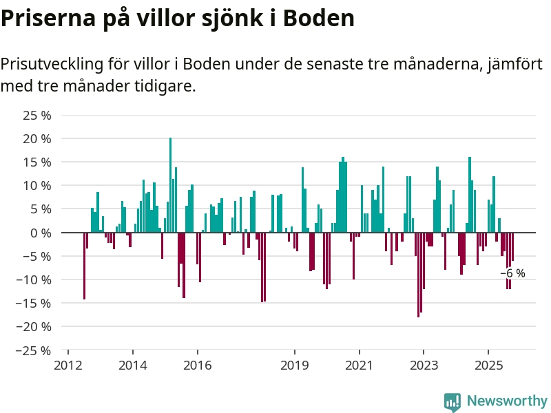 Statistiken visar även på en kännbar prisnedgång i Bodens kommun. Medelpriset på försäljningarna av villor i kommunen var 6 procent lägre än för tre månader sedan. I hela Norrbotten däremot ökar villapriserna. I hela länet noterades en prisuppgång på 1 procent.