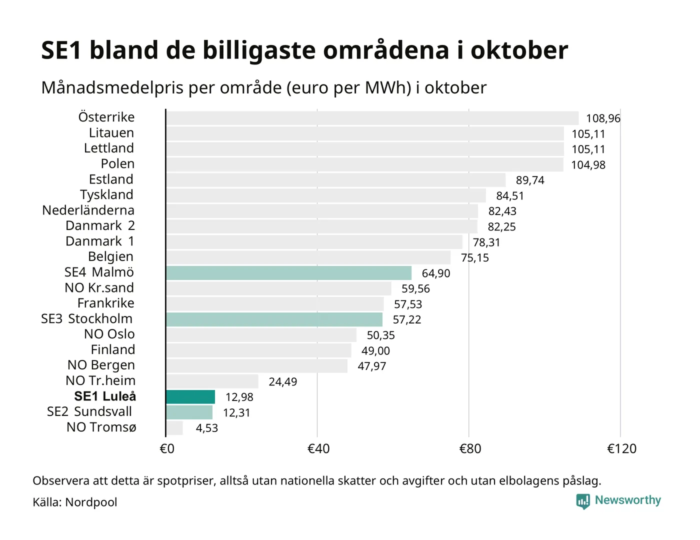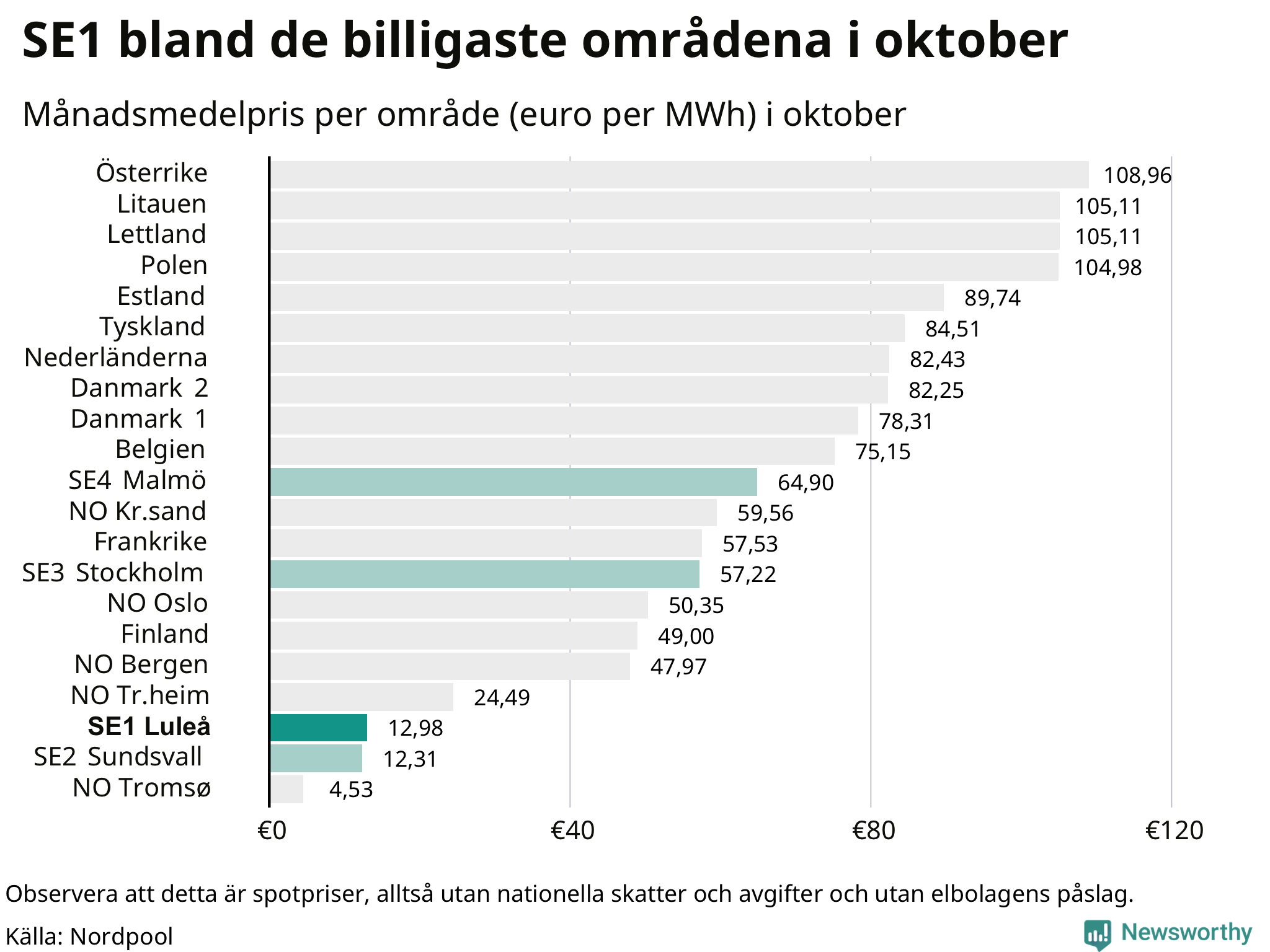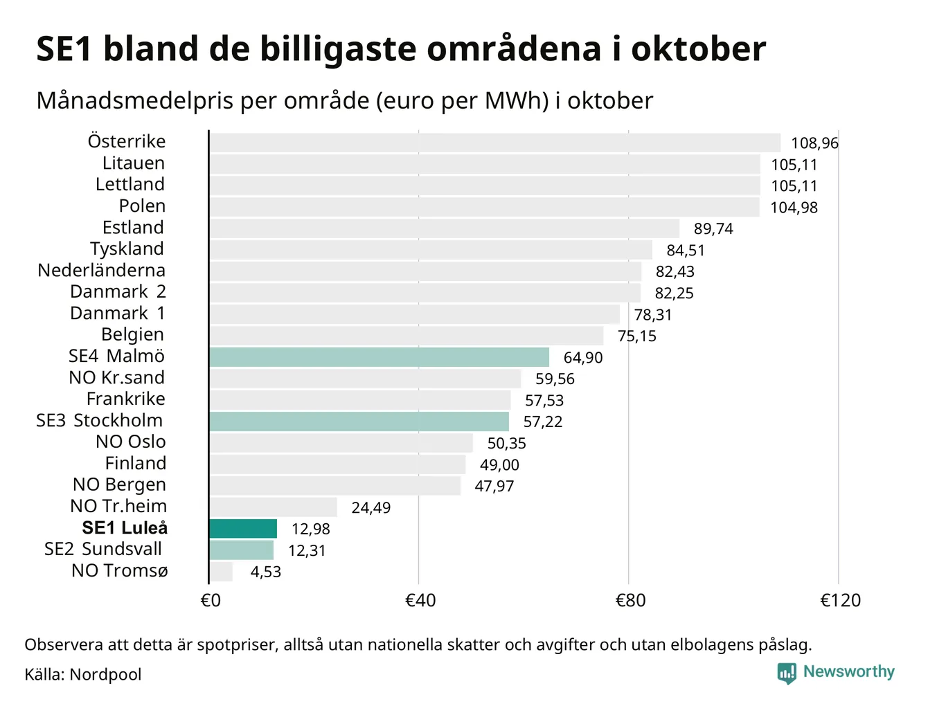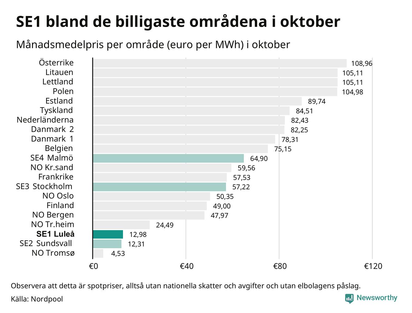 Om man tittar på månadsmedelpriset brukar de svenska elområdena oftast tillhöra de med lägst spotpriser i en europeisk jämförelse. Värt att notera är att detta handlar om spotpriser, de priser konsumenten sedan betalar beror på nationella avgifter och skatter samt elbolagens påslag. I praktiken ligger de svenska konsumentpriserna närmare det europeiska snittet efter skatter och påslag.