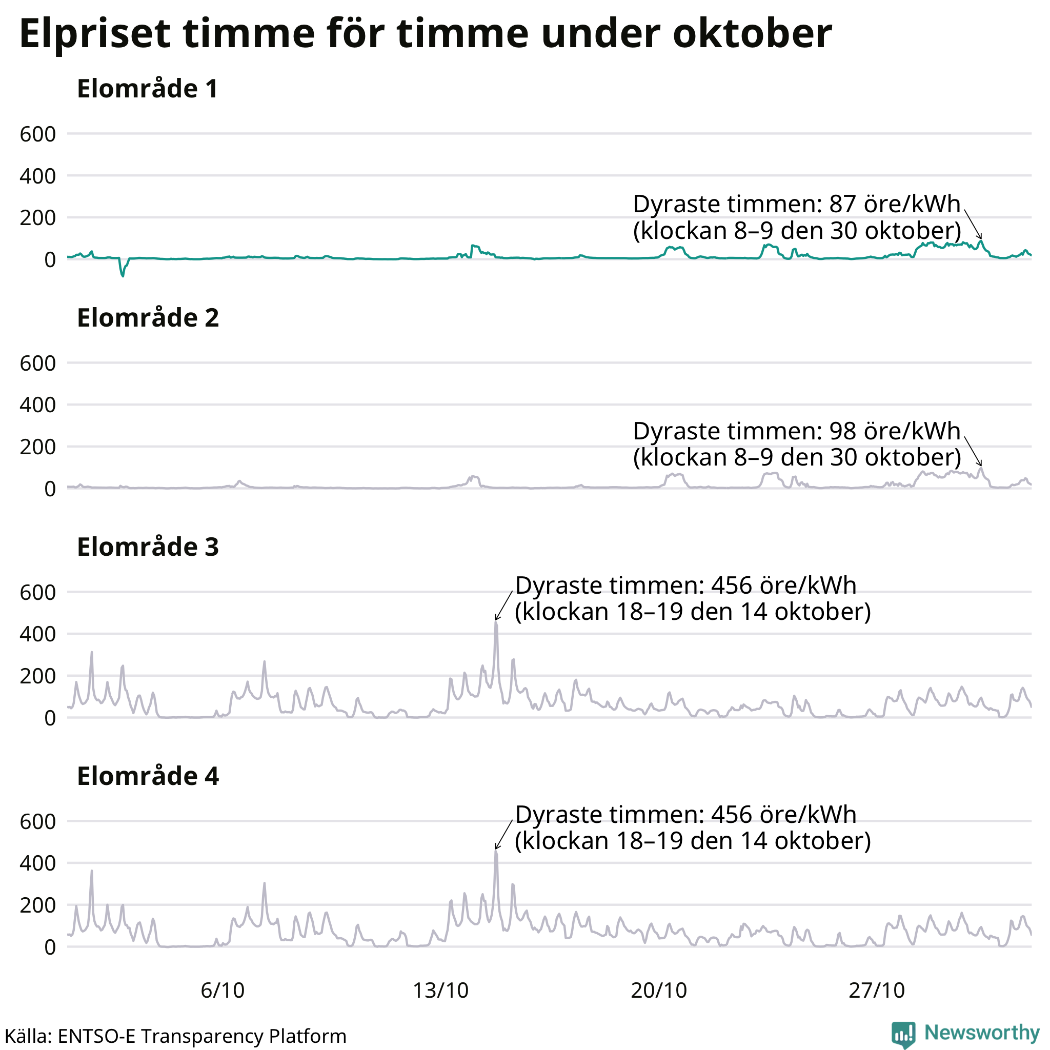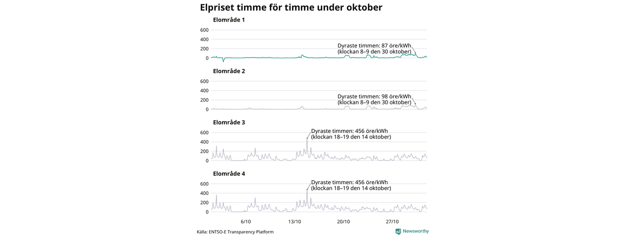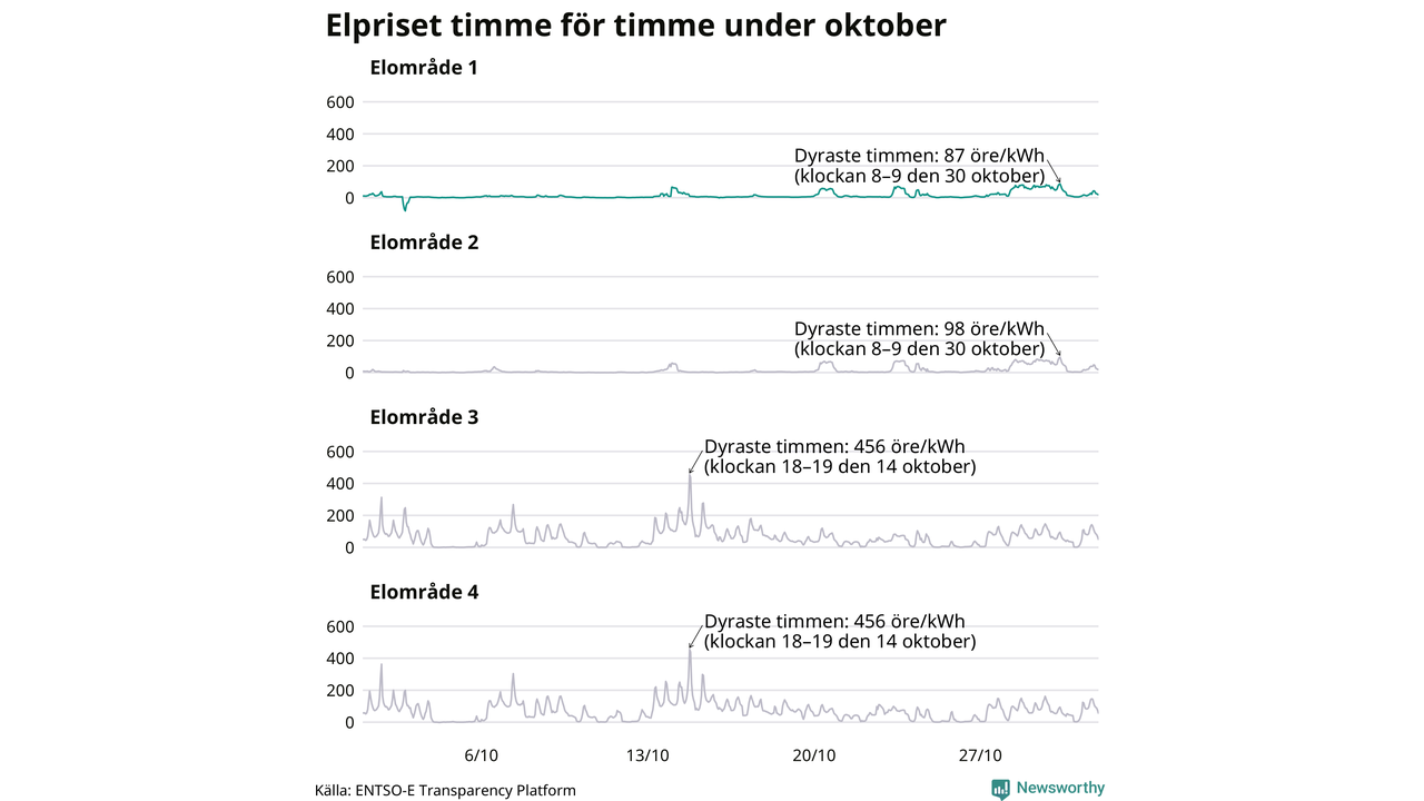 Det är inte bara prisskillnaderna mellan prisområdena som har ökat de senaste åren, även inom områdena pendlar priserna timme för timme. Skillnaderna mellan de dyraste och billigaste timmarna har blivit större sedan 2020. Dyraste timmen i oktober i Jokkmokk inträffade mellan klockan 7 och 8 den 30 oktober, då kostade en kilowattimme 87 öre. Som lägst var priset i området −82 öre. Det är det lägsta timpriset hittills och noterades 2 oktober. Under oktober var timpriset negativt under 12 timmar. Negativa priser har noterats under elva av de senaste tolv månaderna.