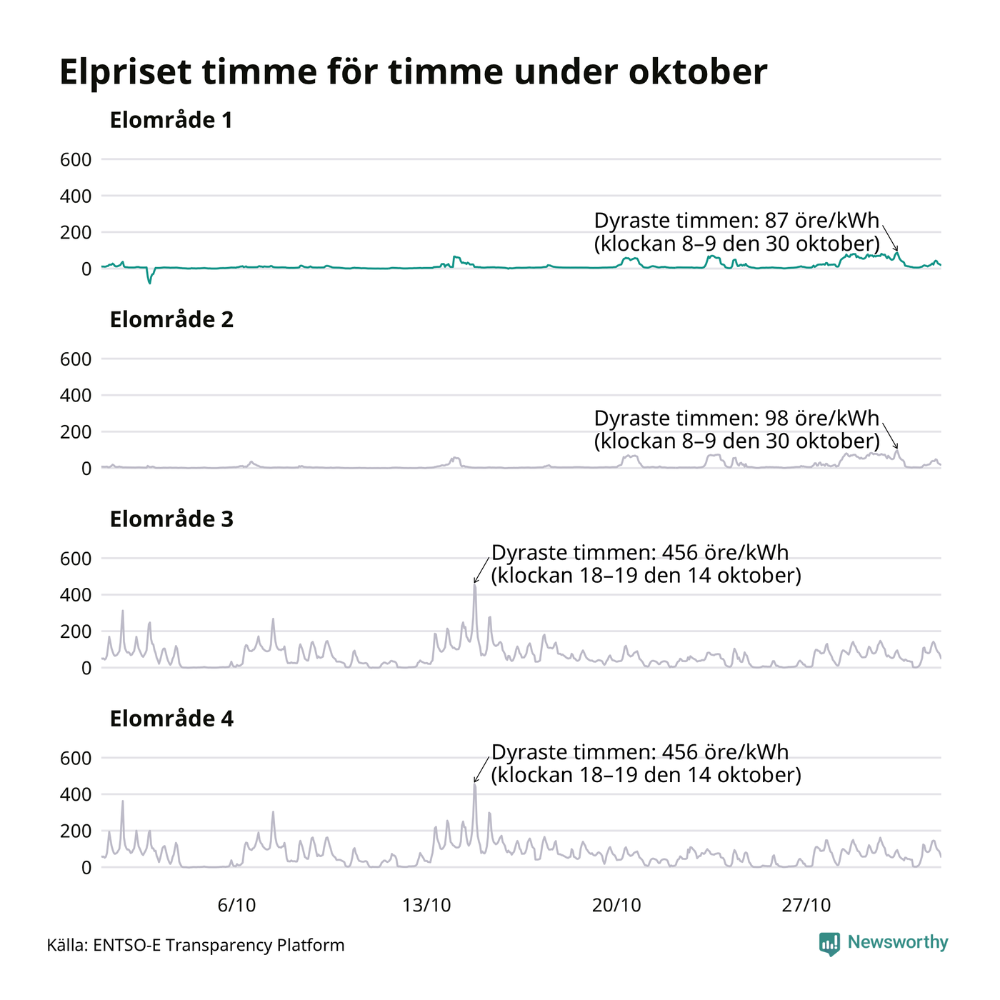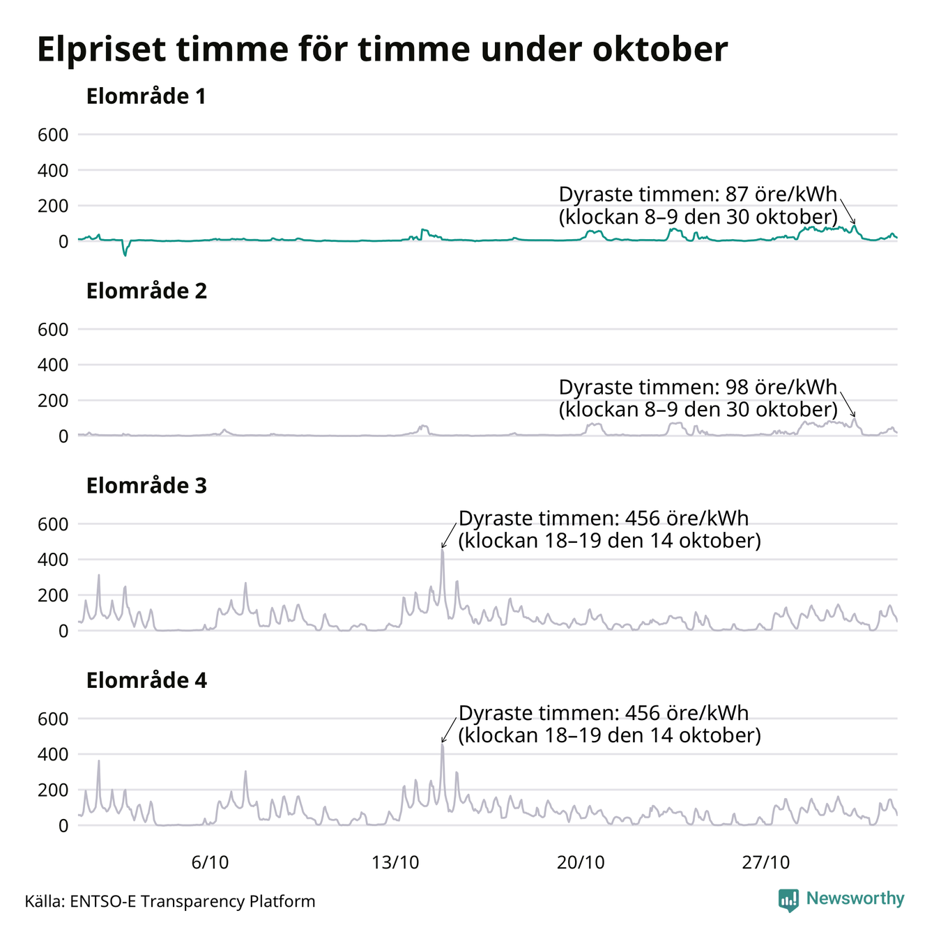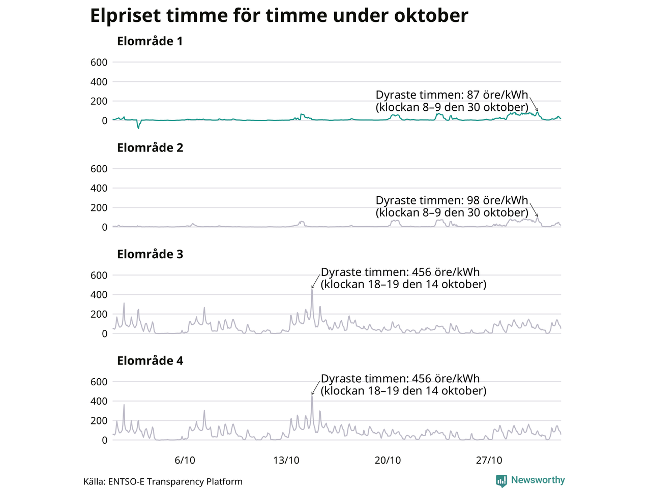 Det är inte bara prisskillnaderna mellan prisområdena som har ökat de senaste åren, även inom områdena pendlar priserna timme för timme. Skillnaderna mellan de dyraste och billigaste timmarna har blivit större sedan 2020. Dyraste timmen i oktober i Jokkmokk inträffade mellan klockan 7 och 8 den 30 oktober, då kostade en kilowattimme 87 öre. Som lägst var priset i området −82 öre. Det är det lägsta timpriset hittills och noterades 2 oktober. Under oktober var timpriset negativt under 12 timmar. Negativa priser har noterats under elva av de senaste tolv månaderna.