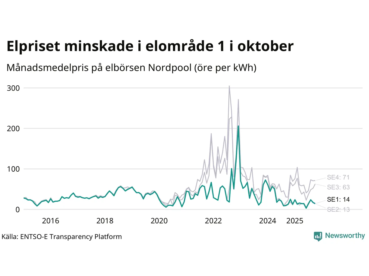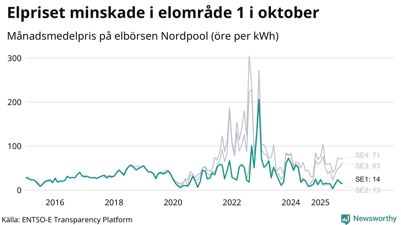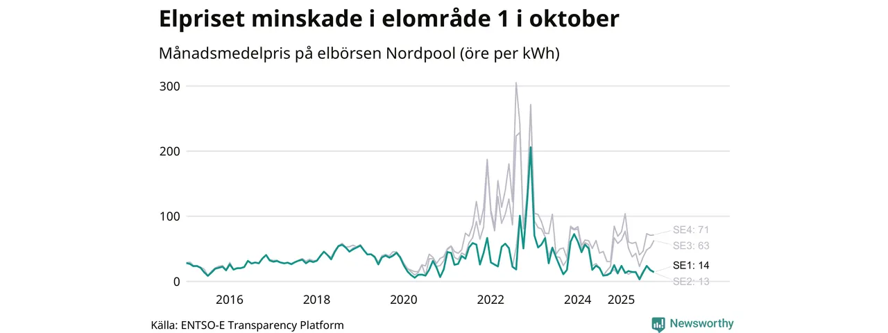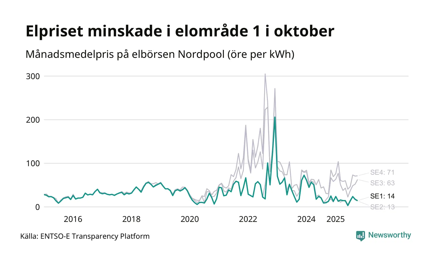Spotpriset – alltså priset som elbolagen köper in elen för – sjönk i elområde 1 som Jokkmokk tillhör. Månadspriset i oktober var 14 öre per kilowattimme, vilket är 3 öre billigare än i september. Det högsta priset i elområdet hittills noterades i december 2022, då en kilowattimme kostade 206 öre. För ett år sedan – i oktober 2024 – kostade en kilowattimme 13 öre.