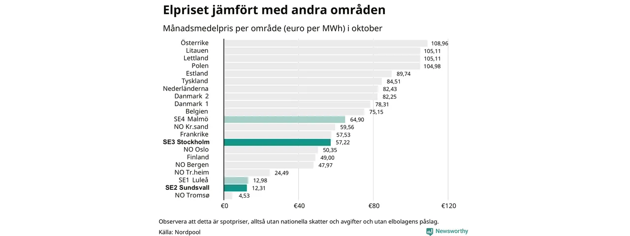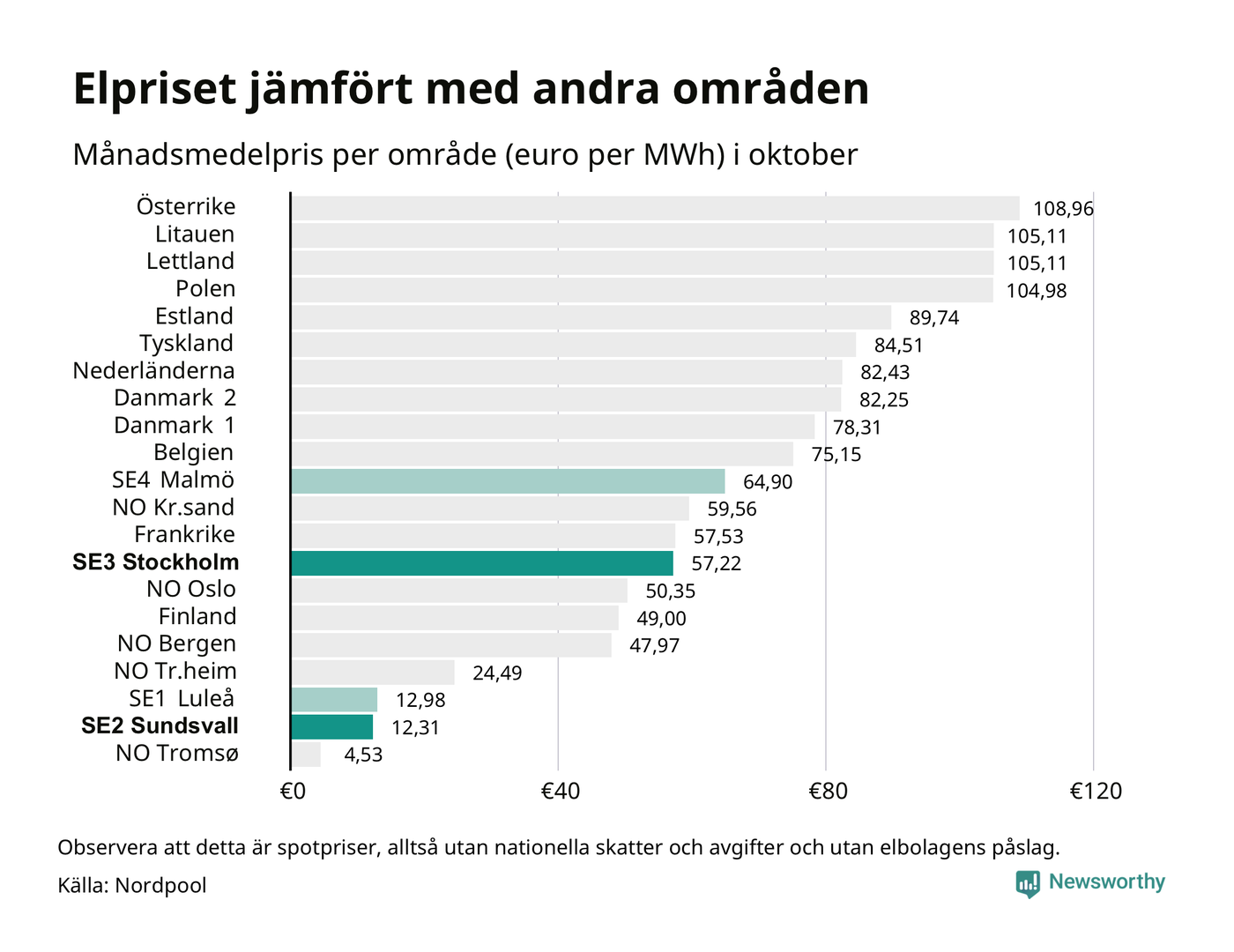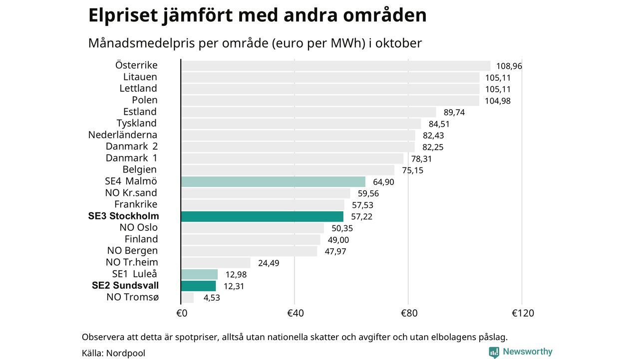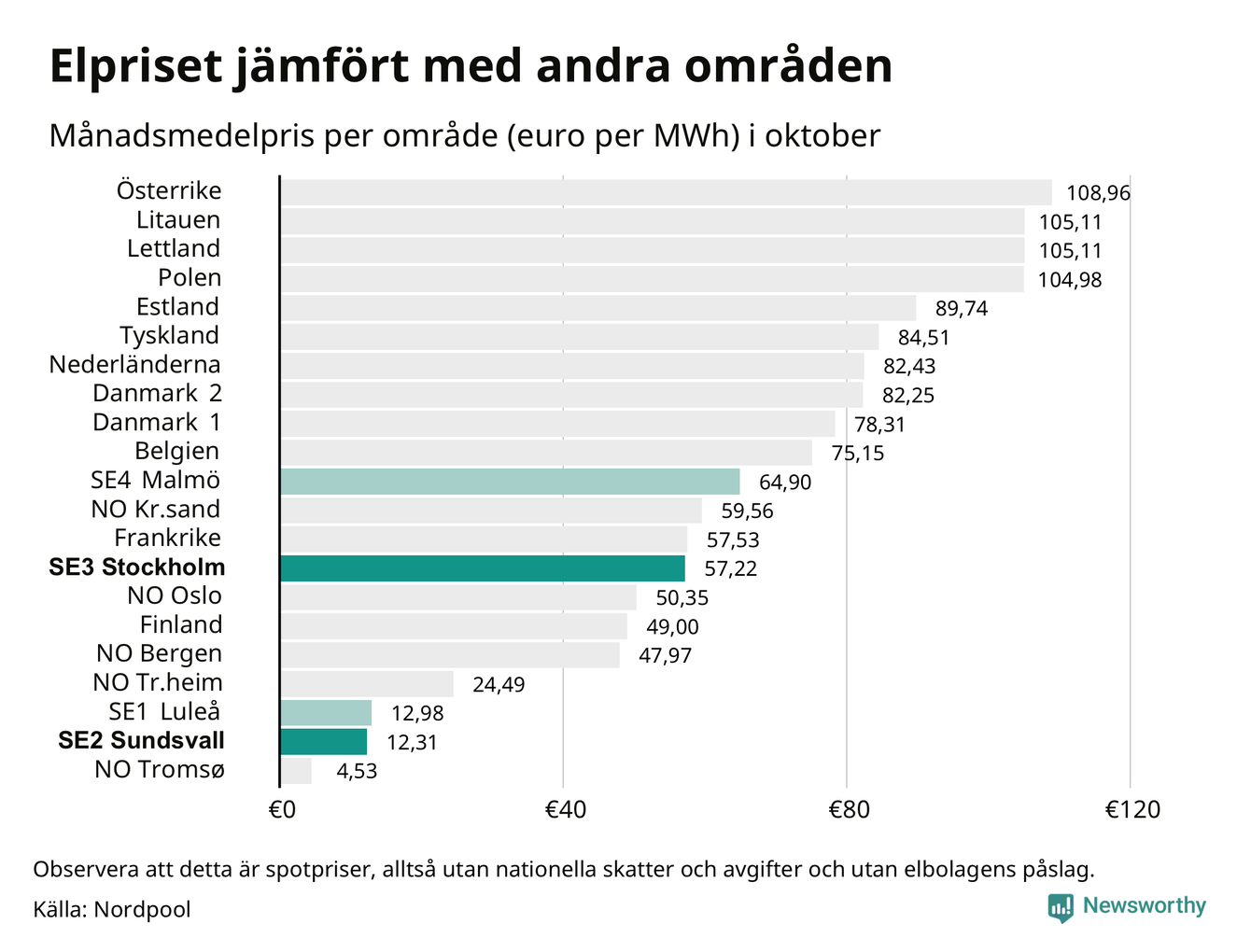 Om man tittar på månadsmedelpriset brukar de svenska elområdena oftast tillhöra de med lägst spotpriser i en europeisk jämförelse. Värt att notera är att detta handlar om spotpriser, de priser konsumenten sedan betalar beror på nationella avgifter och skatter samt elbolagens påslag. I praktiken ligger de svenska konsumentpriserna närmare det europeiska snittet efter skatter och påslag.
