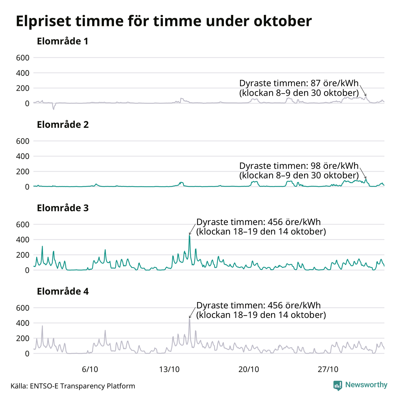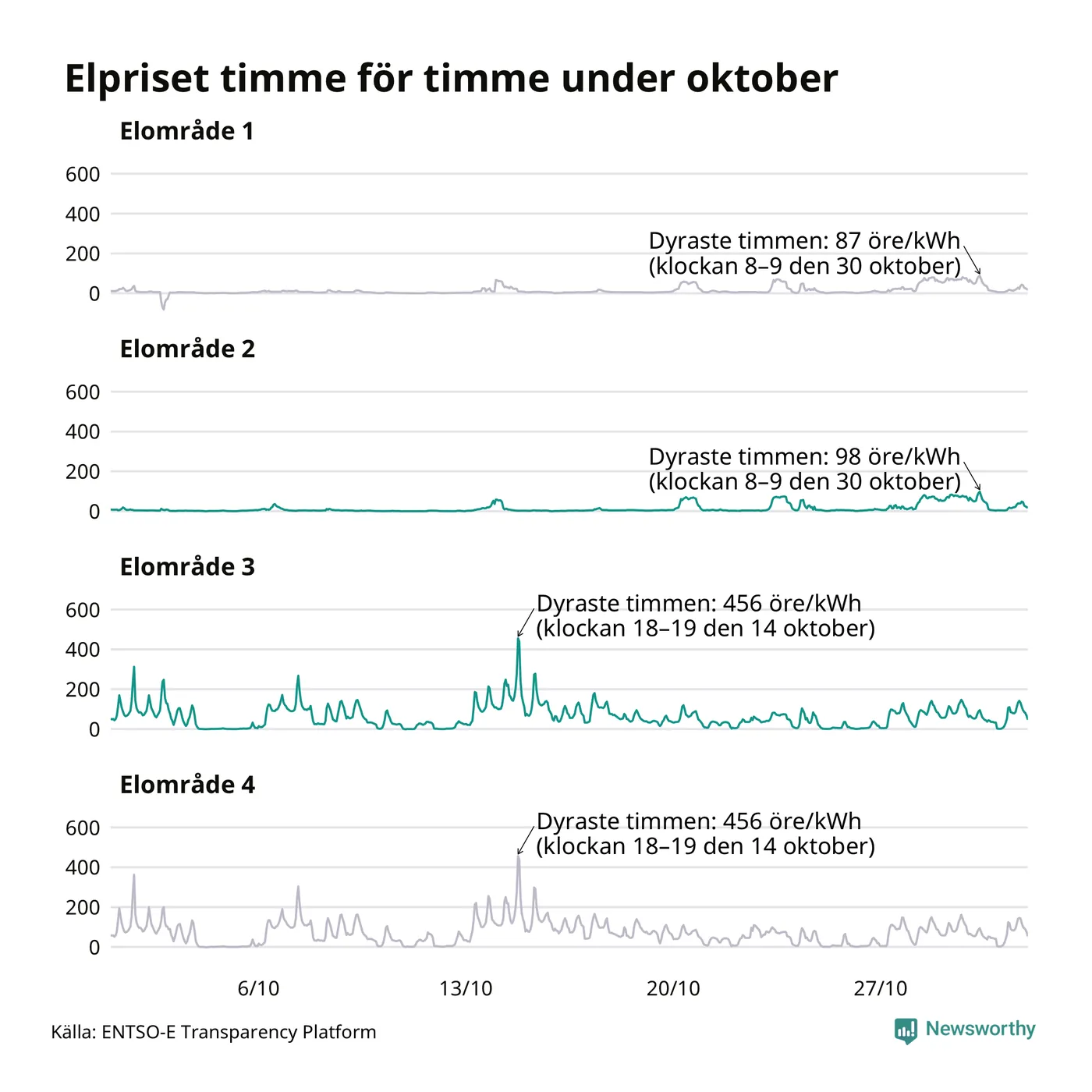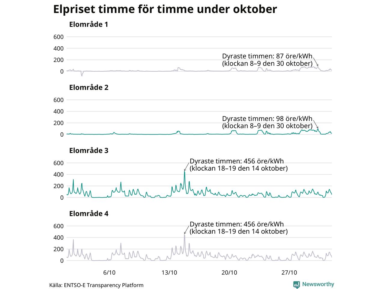 Det är inte bara prisskillnaderna mellan prisområdena som har ökat de senaste åren, även inom områdena pendlar priserna timme för timme – och skillnaderna mellan de dyraste och billigaste timmarna har blivit större sedan 2020. Dyraste timmen i oktober i elområde 3 inträffade mellan klockan 18 och 19 den 14 oktober, då kostade en kilowattimme 456 öre. Som lägst var priset i området −1 öre. I elområde 2 toppade priset mellan klockan 7 och 8 den 30 oktober på 98 öre per kilowattimme. Som lägst kostade elen i området −1 öre per kilowattimme.