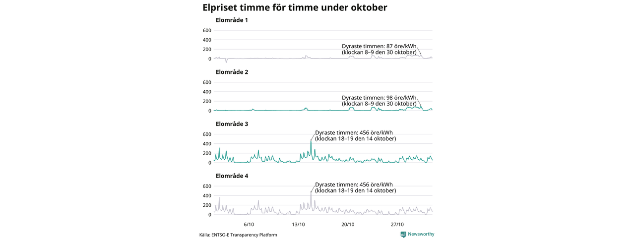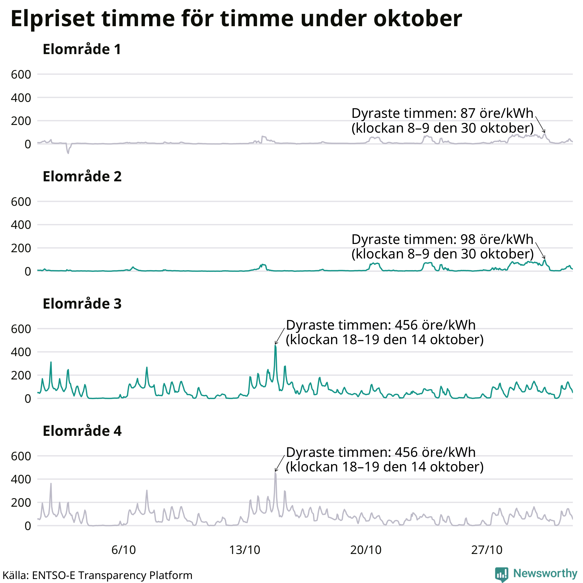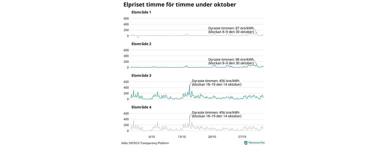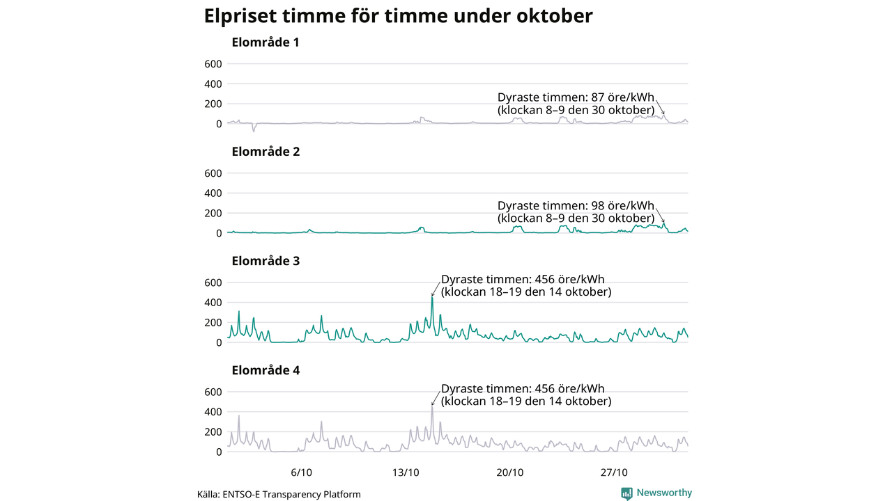 Det är inte bara prisskillnaderna mellan prisområdena som har ökat de senaste åren, även inom områdena pendlar priserna timme för timme – och skillnaderna mellan de dyraste och billigaste timmarna har blivit större sedan 2020. Dyraste timmen i oktober i elområde 3 inträffade mellan klockan 18 och 19 den 14 oktober, då kostade en kilowattimme 456 öre. Som lägst var priset i området −1 öre. I elområde 2 toppade priset mellan klockan 7 och 8 den 30 oktober på 98 öre per kilowattimme. Som lägst kostade elen i området −1 öre per kilowattimme.
