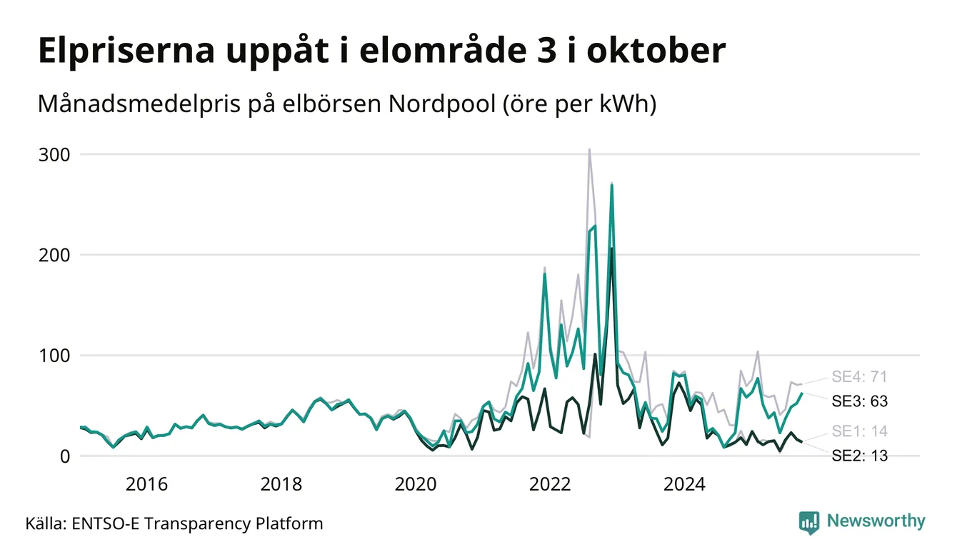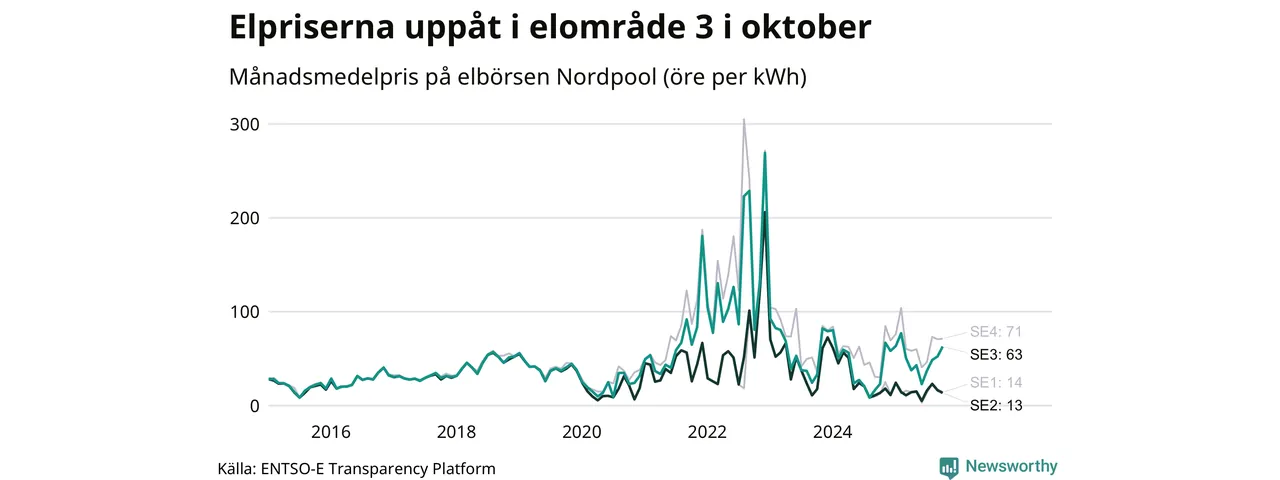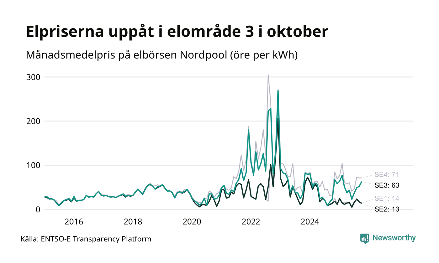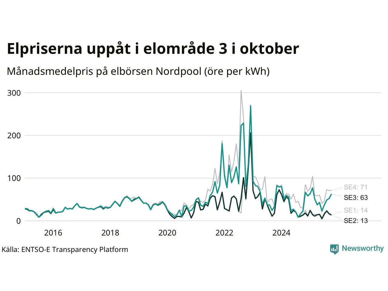 Gävle kommun tillhör två elområden, tätorten Gävle ligger i elområde 3, medan till exempel Bergby och Norrsundet tillhör elområde 2. Spotpriset – alltså priset som elbolagen köper in elen för – landade på 63 öre per kilowattimme i elområde 3 och 13 öre per kilowattimme i elområde 2 i oktober. Motsvarande priser i september var 52 öre (elområde 3) och 16 öre per kilowattimme (elområde 2). Rekordnoteringarna är 269 öre per kilowattimme i elområde 3 och 206 öre per kilowattimme i elområde 2. De noterades i december 2022. För ett år sedan, i oktober 2024, var snittpriset 23 öre per kilowattimme i elområde 3 och 14 öre per kilowattimme i elområde 2.