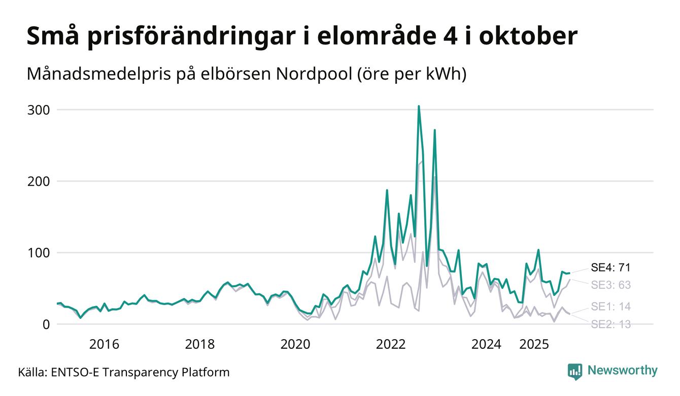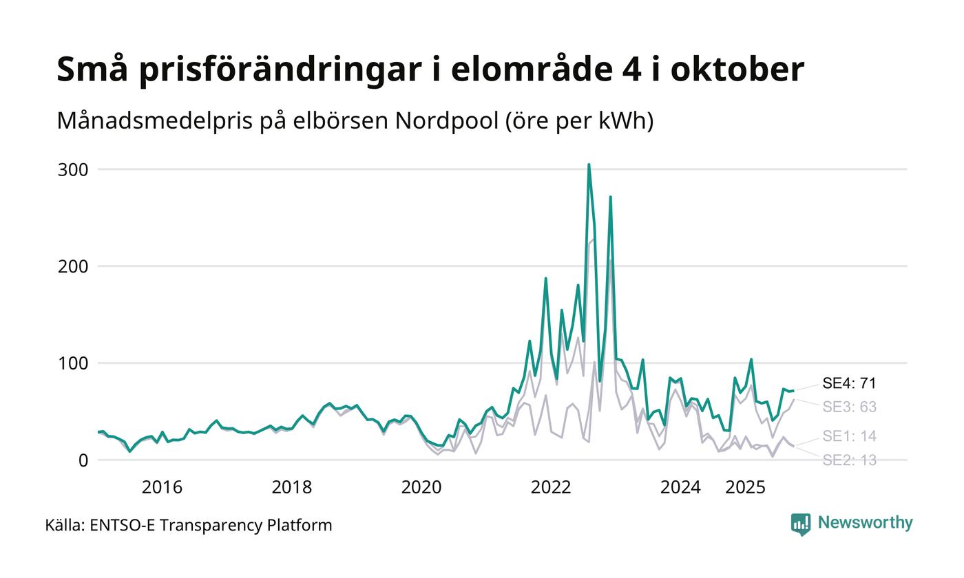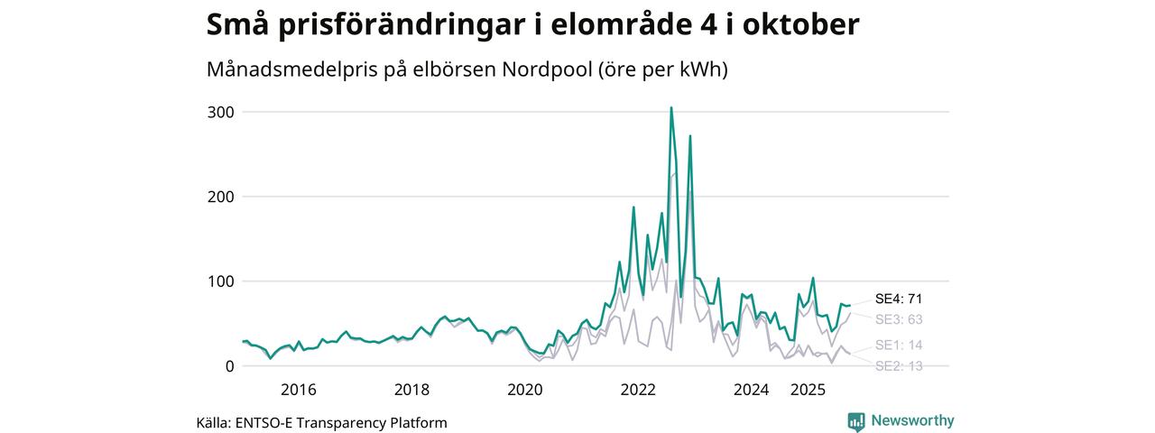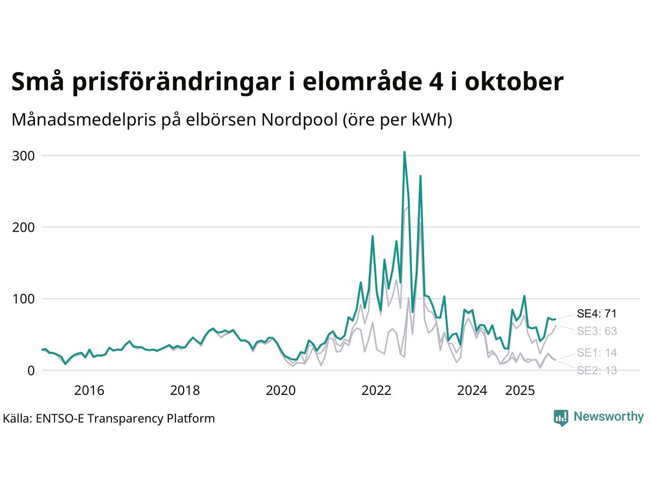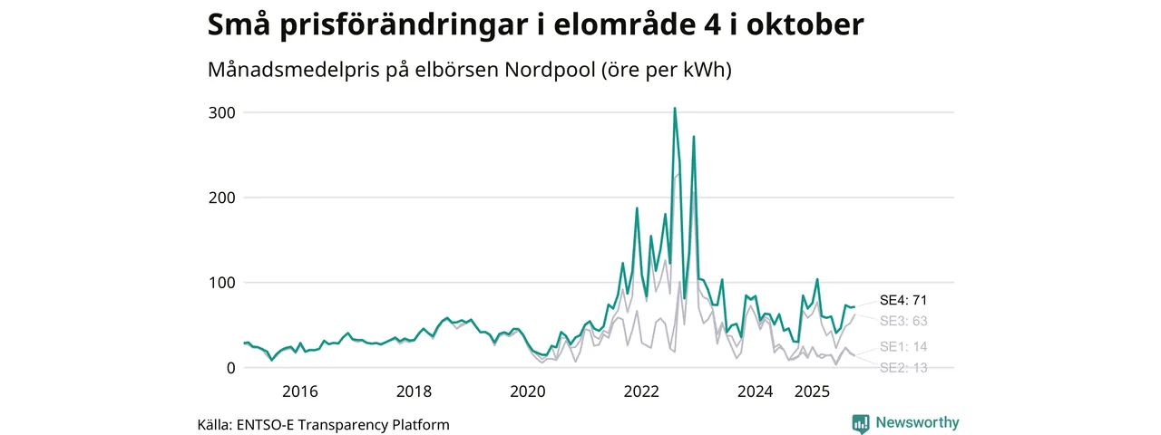Spotpriset – alltså priset som elbolagen köper in elen för – landade på 71 öre per kilowattimme i oktober i elområde 4 som Växjö till största delen tillhör. Det är ungefär samma nivå som månaden innan. Det högsta priset i elområdet hittills noterades i augusti 2022, då en kilowattimme kostade 305 öre. För ett år sedan – i oktober 2024 – kostade en kilowattimme 30 öre.