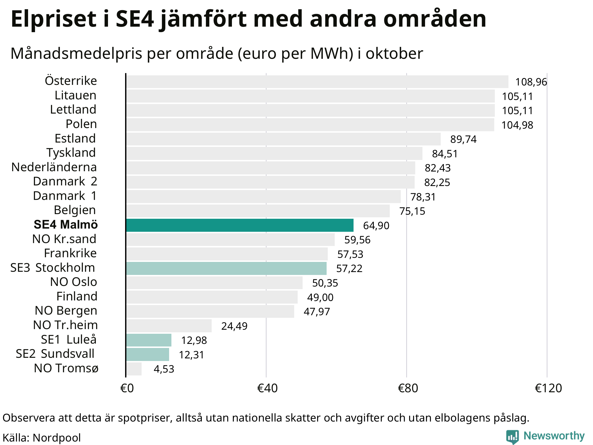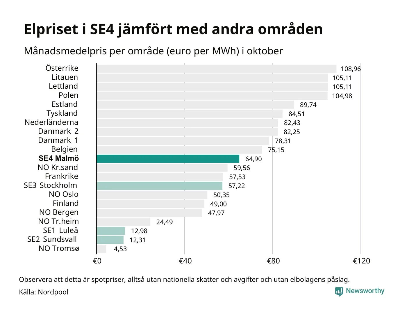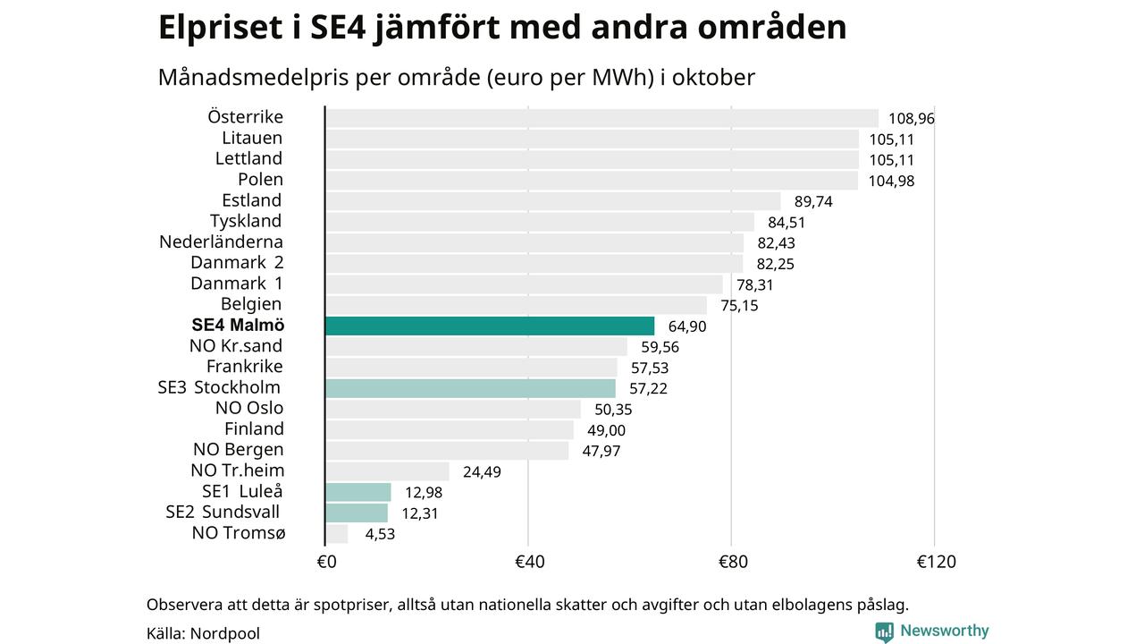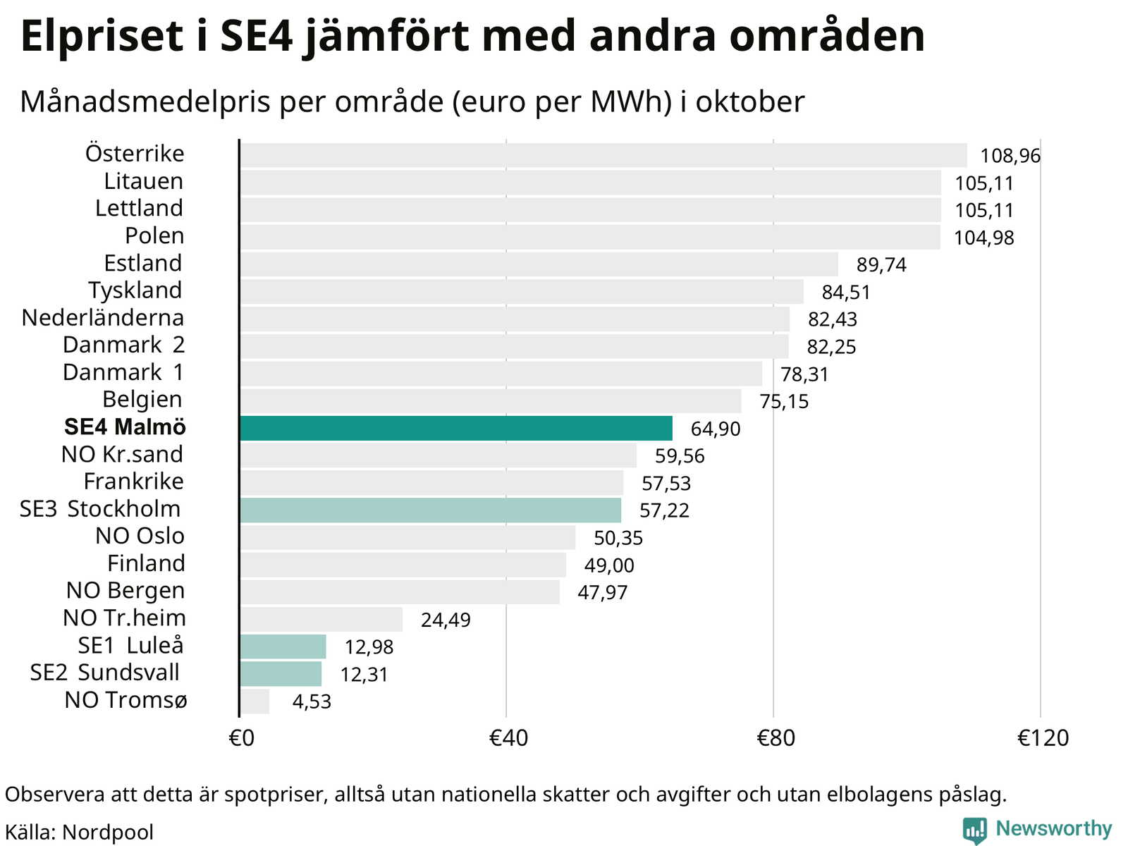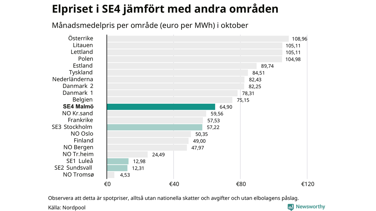 Spotpriset – alltså priset som elbolagen köper in elen för – landade på 71 öre per kilowattimme i oktober i elområde 4 som Växjö till största delen tillhör. Det är ungefär samma nivå som månaden innan. Det högsta priset i elområdet hittills noterades i augusti 2022, då en kilowattimme kostade 305 öre. För ett år sedan – i oktober 2024 – kostade en kilowattimme 30 öre.