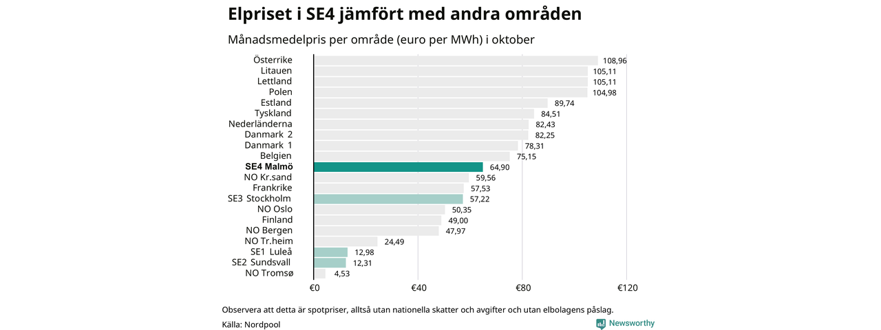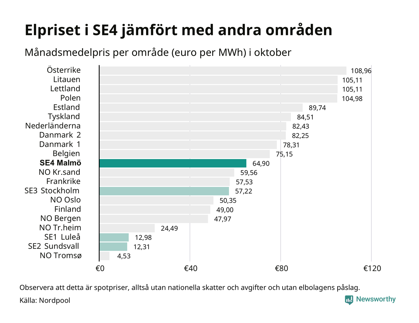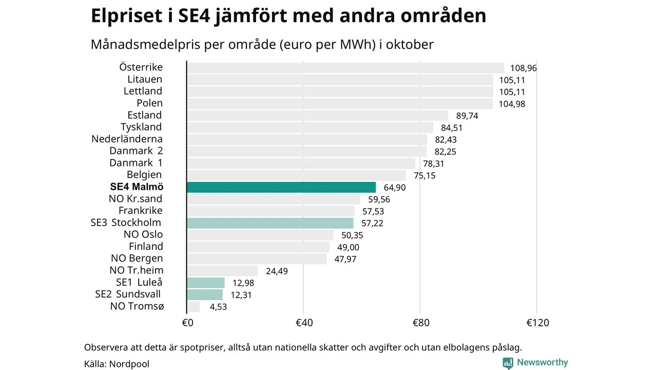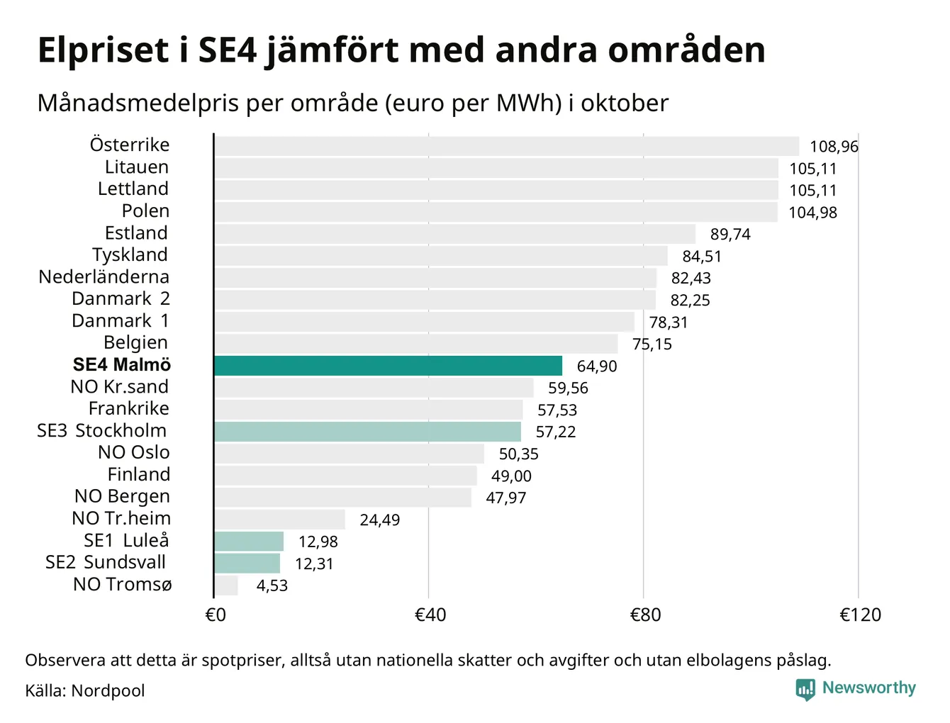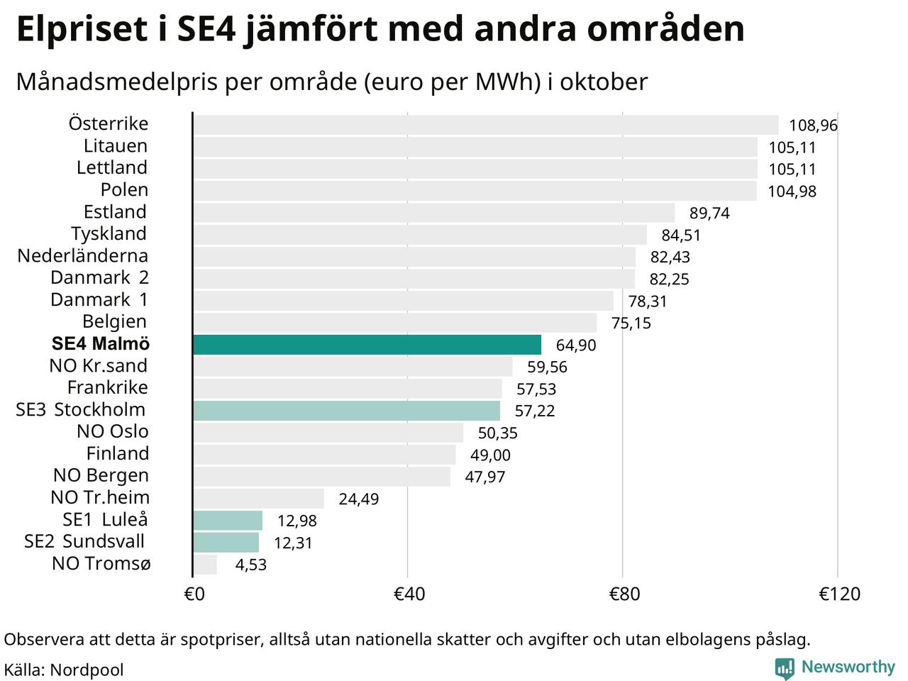 Om man tittar på månadsmedelpriset brukar de svenska elområdena oftast tillhöra de med lägst spotpriser i en europeisk jämförelse. Värt att notera är att detta handlar om spotpriser, de priser konsumenten sedan betalar beror på nationella avgifter och skatter samt elbolagens påslag. I praktiken ligger de svenska konsumentpriserna närmare det europeiska snittet efter skatter och påslag.