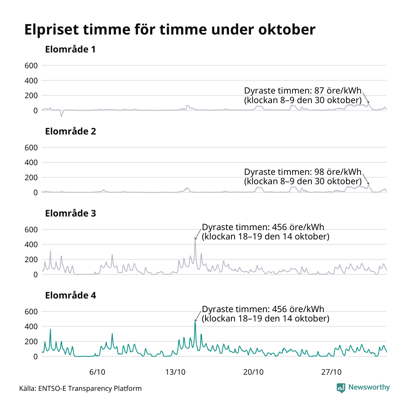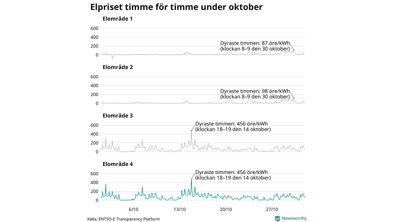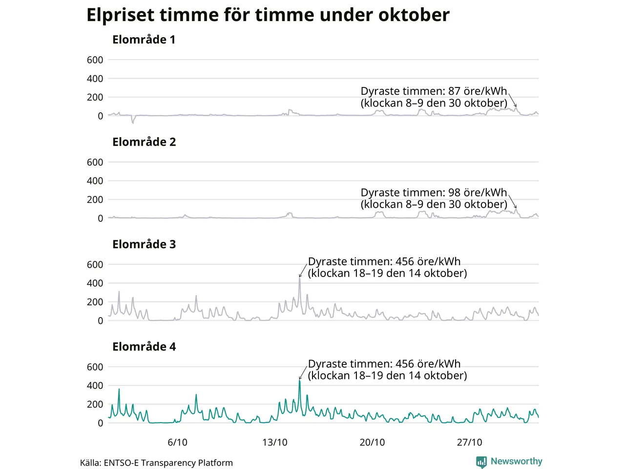 Det är inte bara prisskillnaderna mellan prisområdena som har ökat de senaste åren, även inom områdena pendlar priserna timme för timme. Skillnaderna mellan de dyraste och billigaste timmarna har blivit större sedan 2020. Dyraste timmen i oktober i Växjö inträffade mellan klockan 18 och 19 den 14 oktober, då kostade en kilowattimme 456 öre. Som lägst var priset i området −2 öre. Under oktober var timpriset negativt under 16 timmar i elområde 4 och 17 timmar i elområde 3. Negativa timpriser har noterats varje månad under det senaste året.