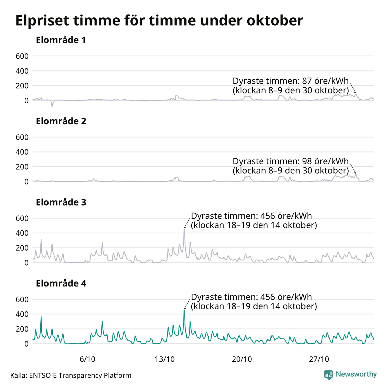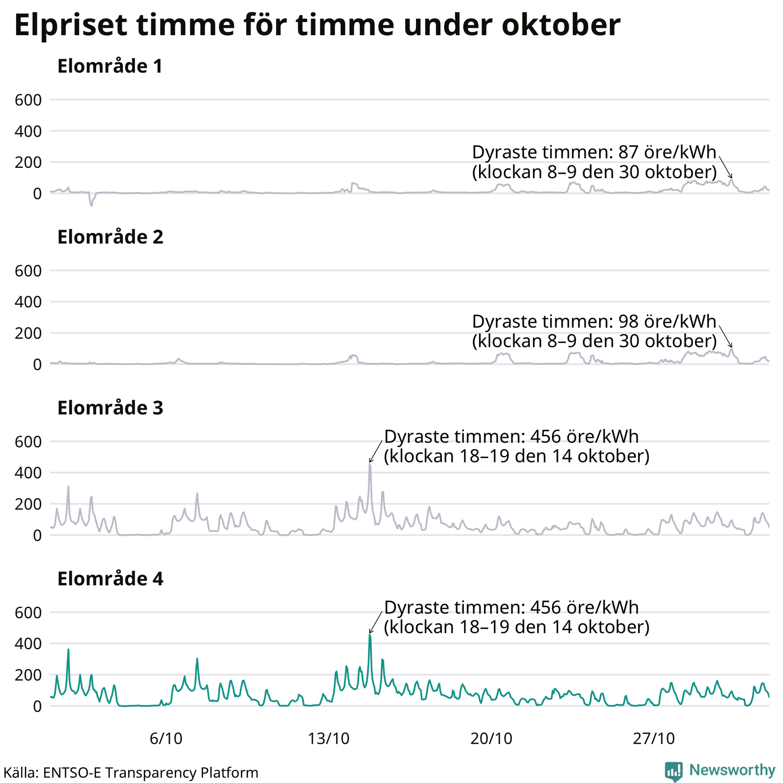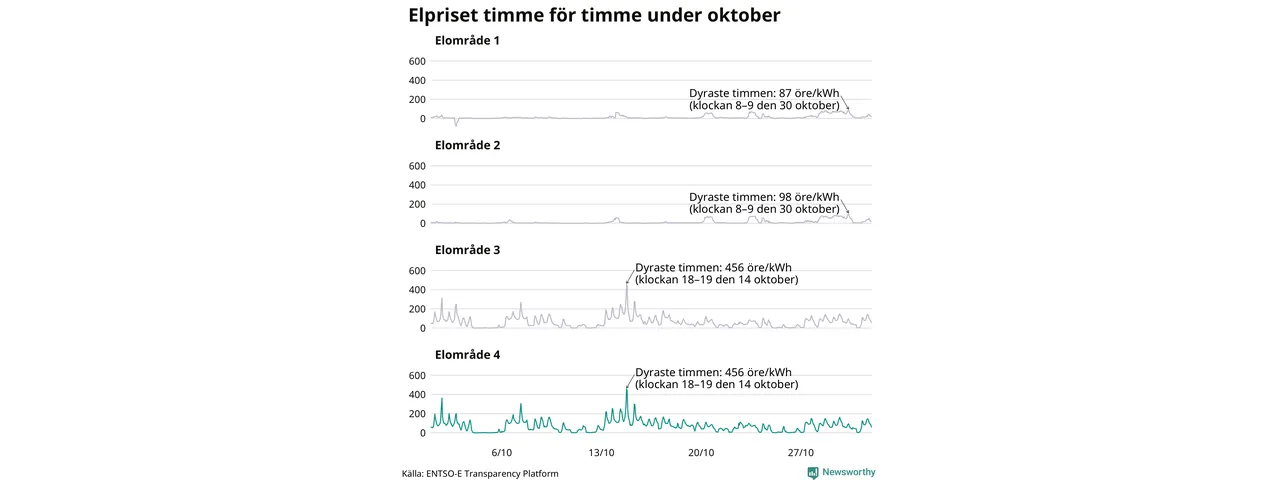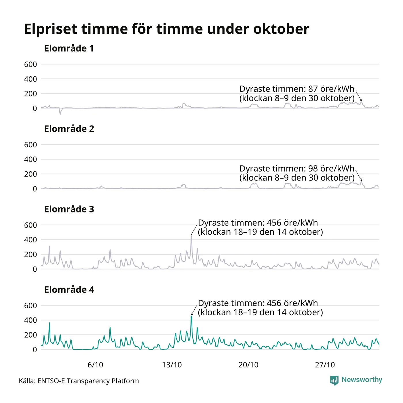 Det är inte bara prisskillnaderna mellan prisområdena som har ökat de senaste åren, även inom områdena pendlar priserna timme för timme. Skillnaderna mellan de dyraste och billigaste timmarna har blivit större sedan 2020. Dyraste timmen i oktober i Växjö inträffade mellan klockan 18 och 19 den 14 oktober, då kostade en kilowattimme 456 öre. Som lägst var priset i området −2 öre. Under oktober var timpriset negativt under 16 timmar i elområde 4 och 17 timmar i elområde 3. Negativa timpriser har noterats varje månad under det senaste året.
