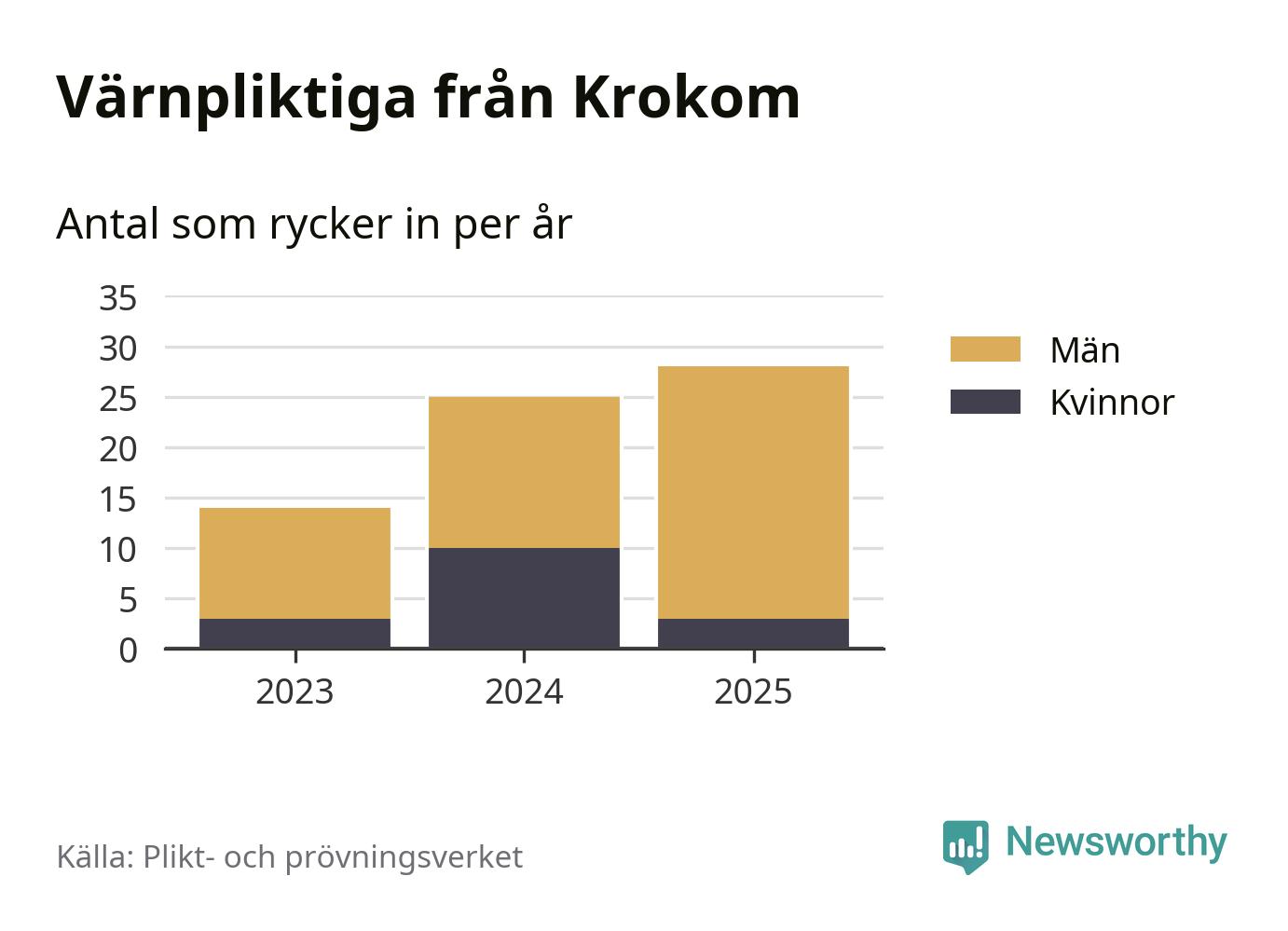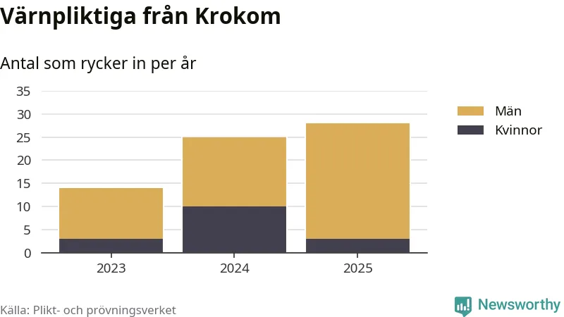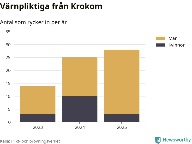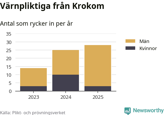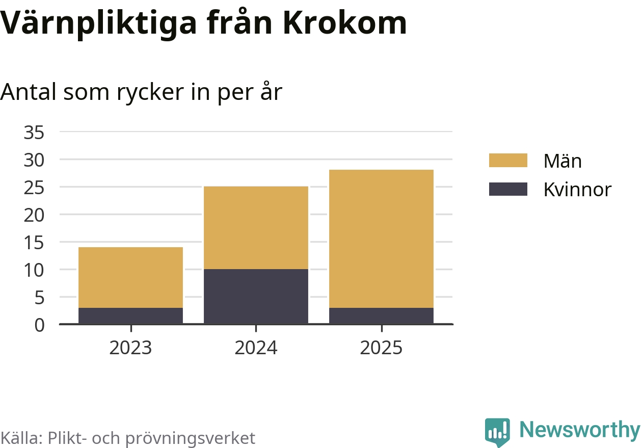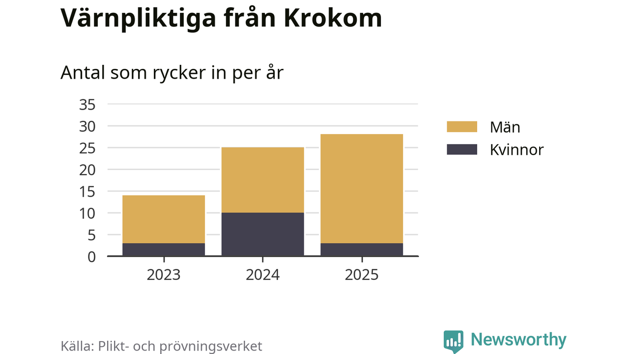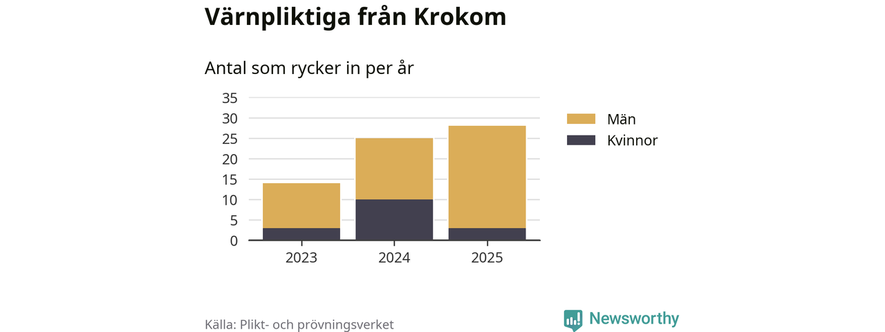 Sedan 2023 – som är det första året vi har jämförbara siffror för – har totalt 67 ungdomar från Krokom påbörjat sin värnplikt. Av dem har 16 varit kvinnor.