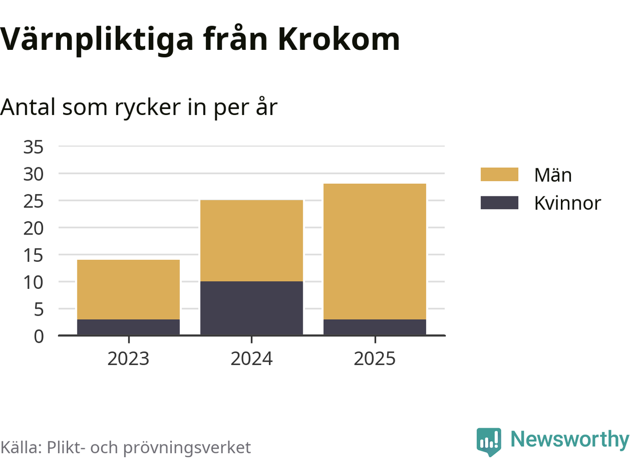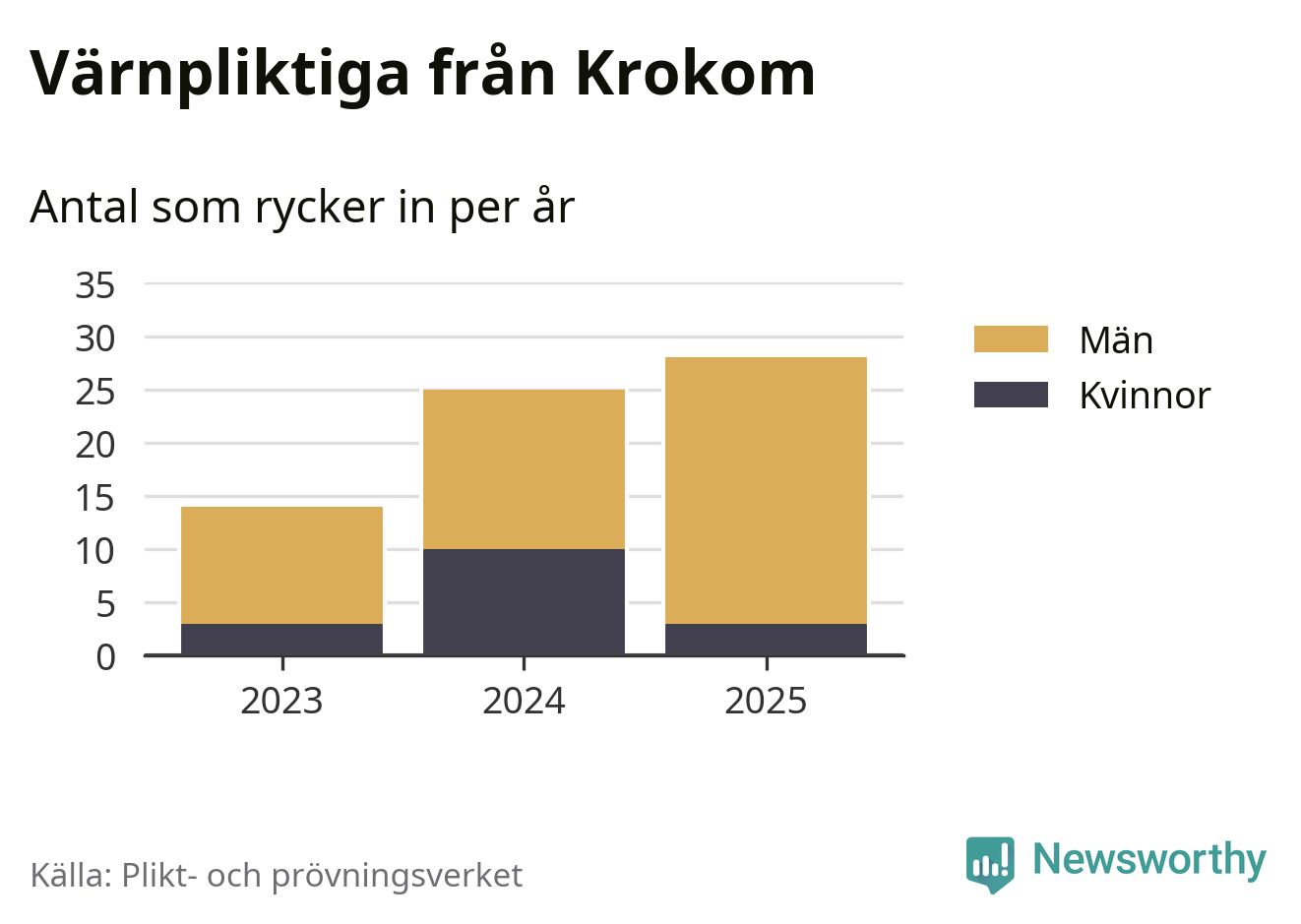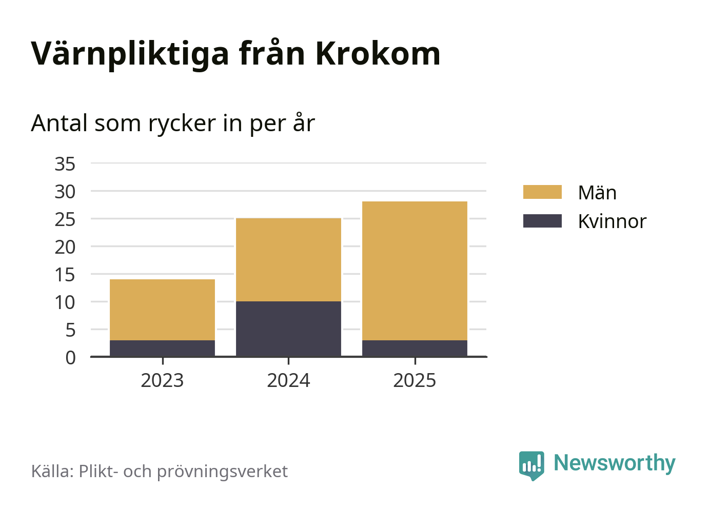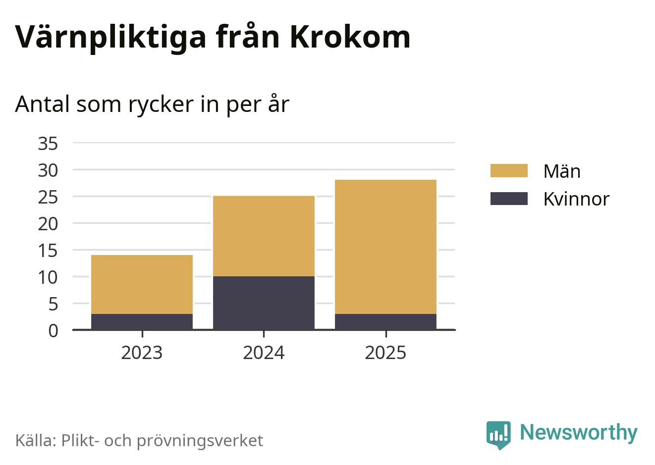 Sedan 2023 – som är det första året vi har jämförbara siffror för – har totalt 67 ungdomar från Krokom påbörjat sin värnplikt. Av dem har 16 varit kvinnor.