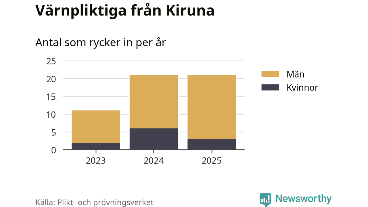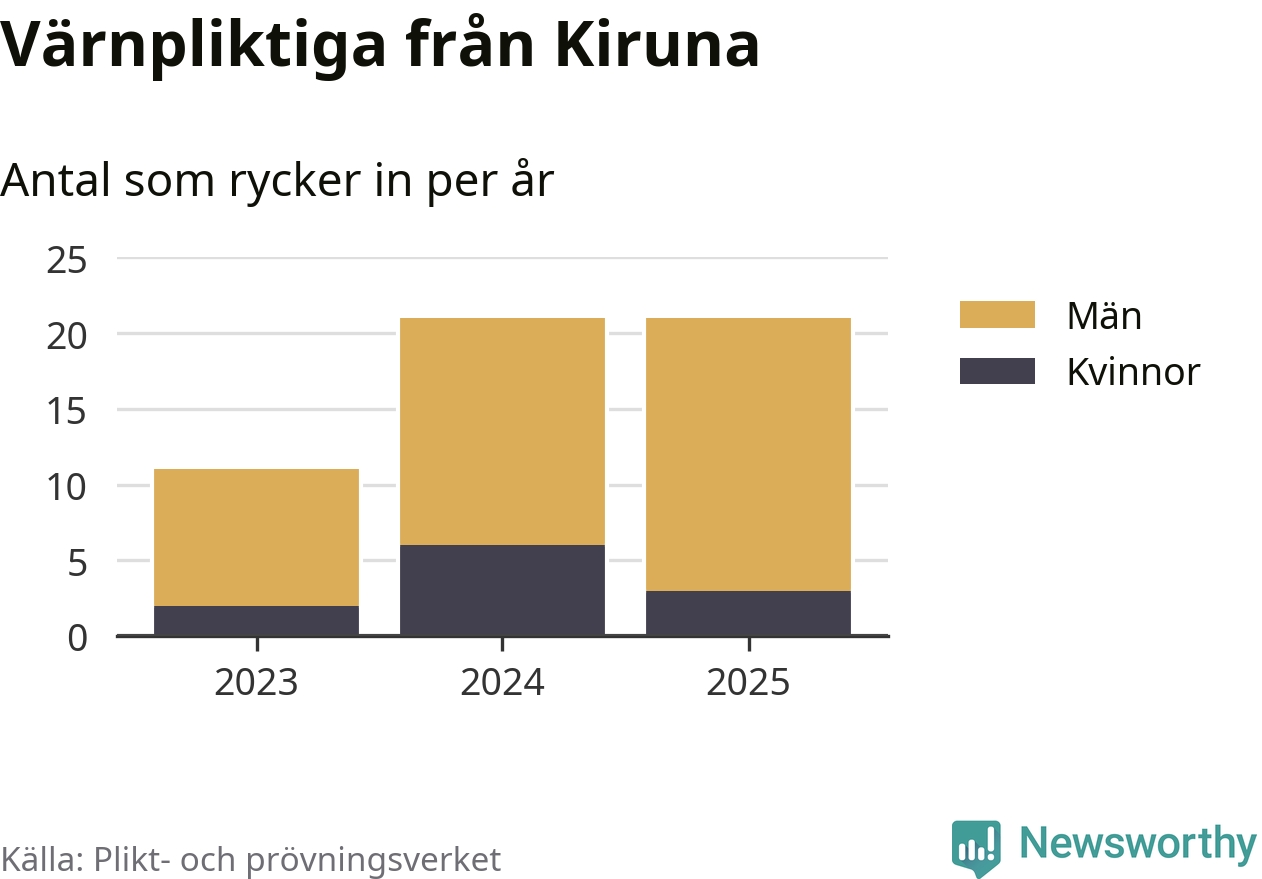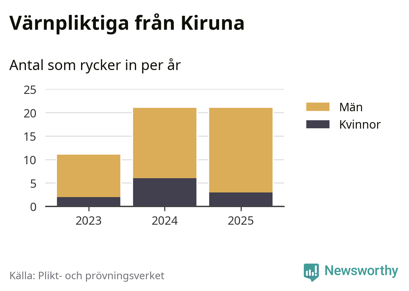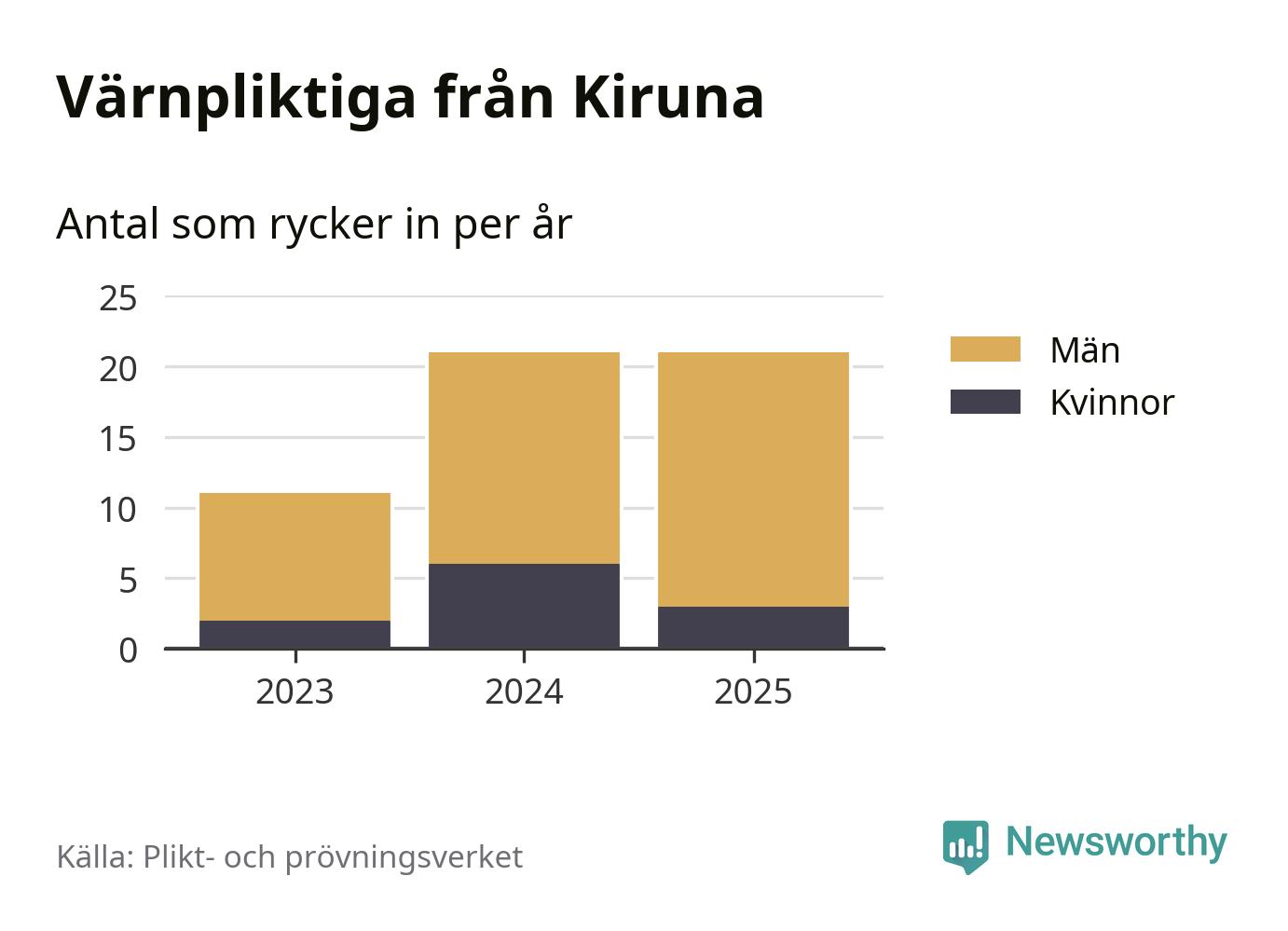 Sedan 2023 – som är det första året vi har jämförbara siffror för – har totalt 53 ungdomar från Kiruna påbörjat sin värnplikt. Av dem har elva varit kvinnor.