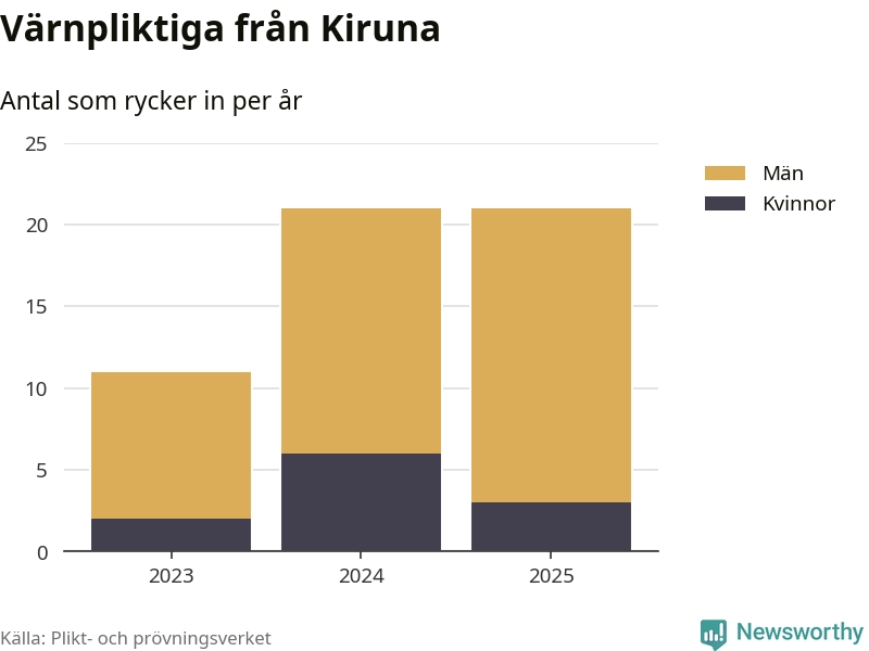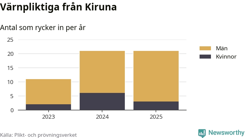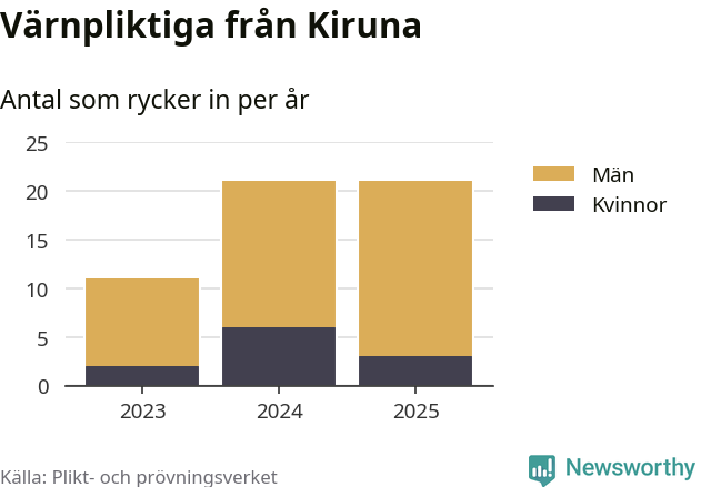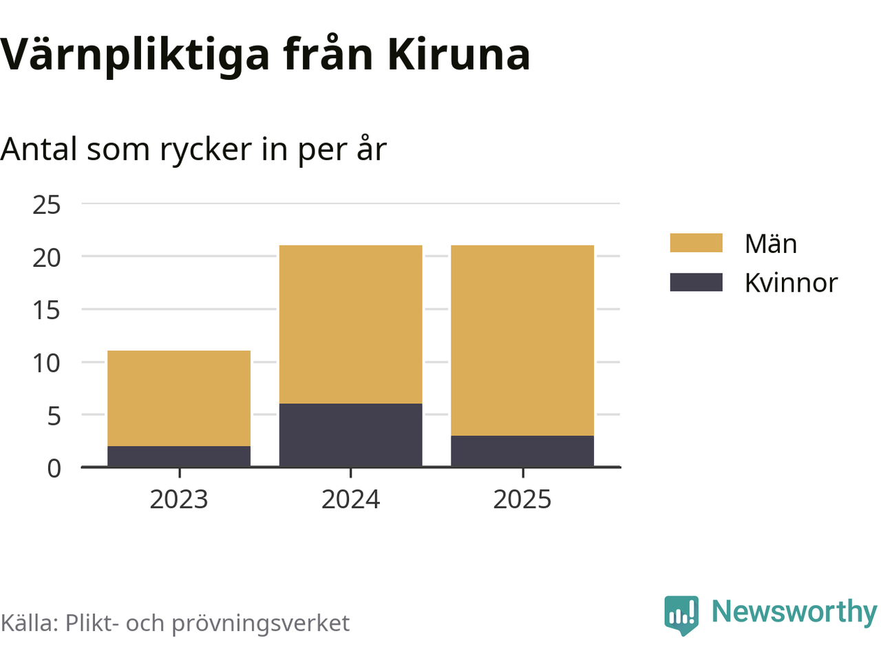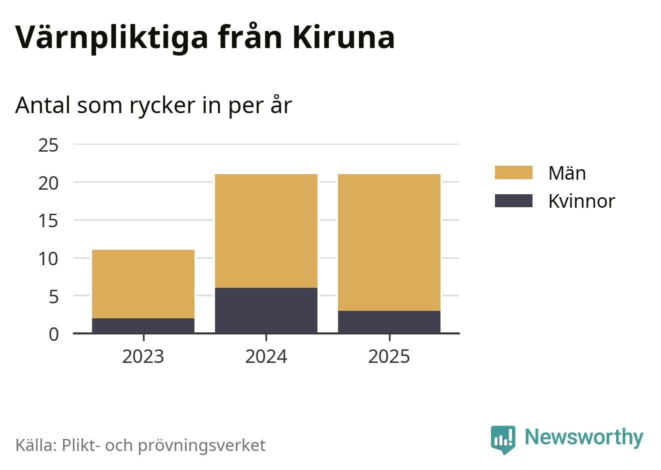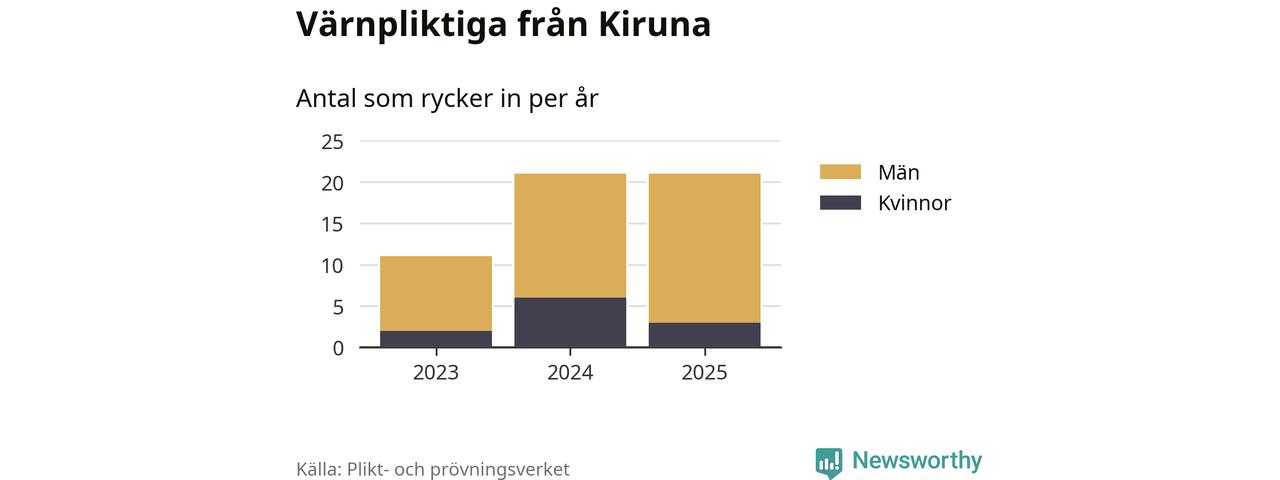 Sedan 2023 – som är det första året vi har jämförbara siffror för – har totalt 53 ungdomar från Kiruna påbörjat sin värnplikt. Av dem har elva varit kvinnor.