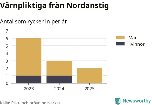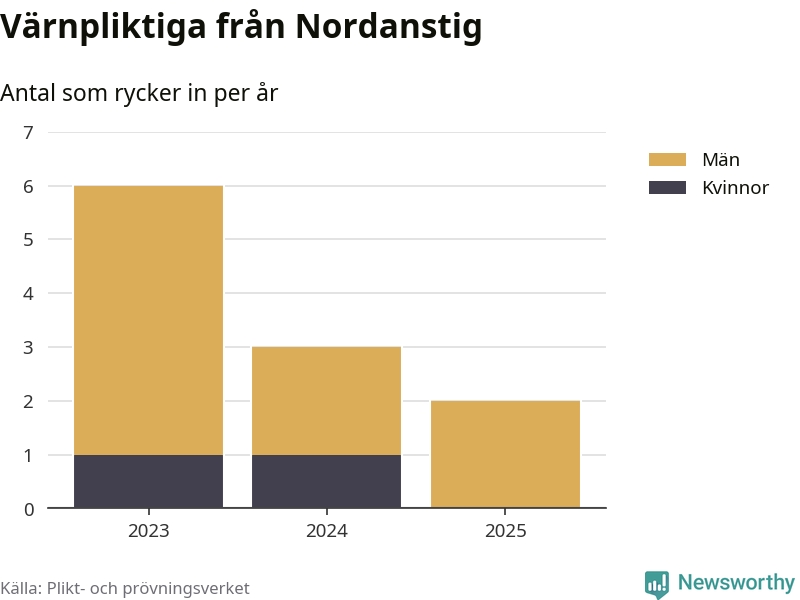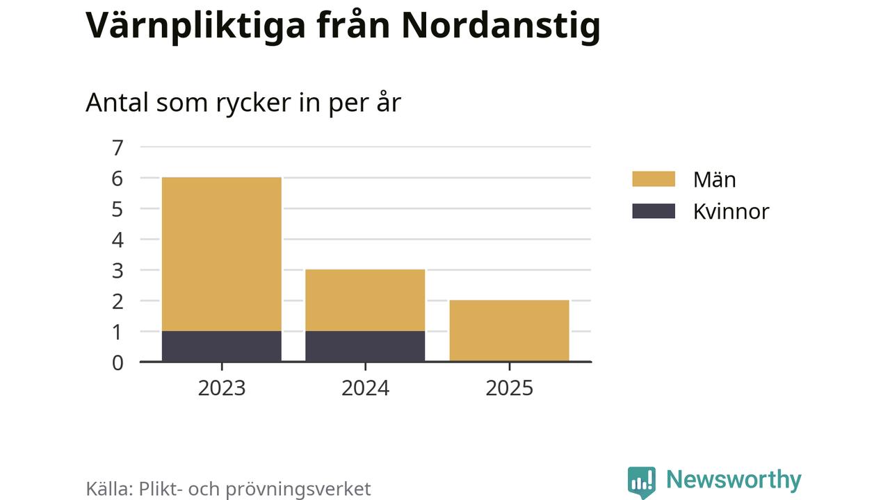 Båda de värnpliktiga från Nordanstig är män. Totalt i riket är 16 procent av de värnpliktiga kvinnor, även det en minskning jämfört med föregående år.