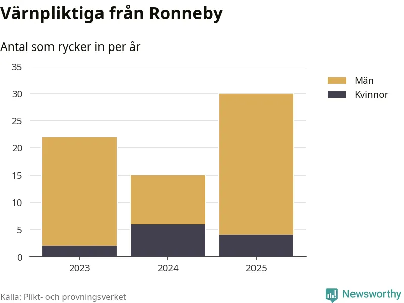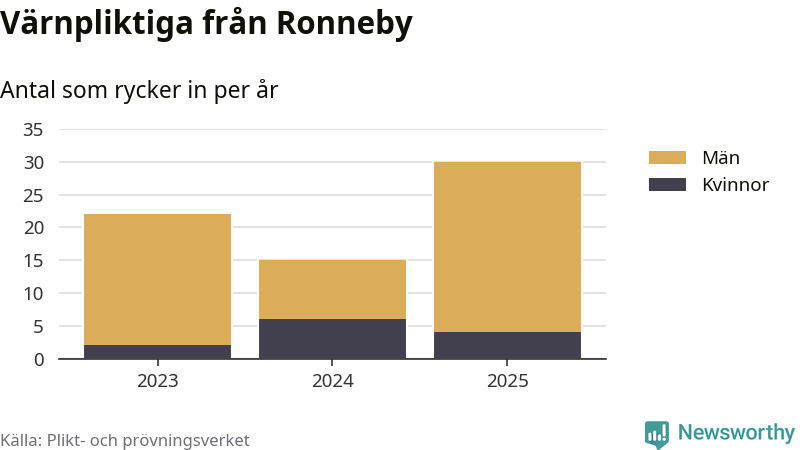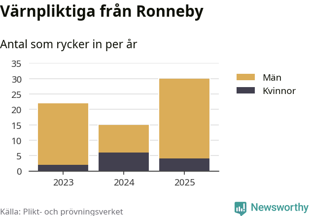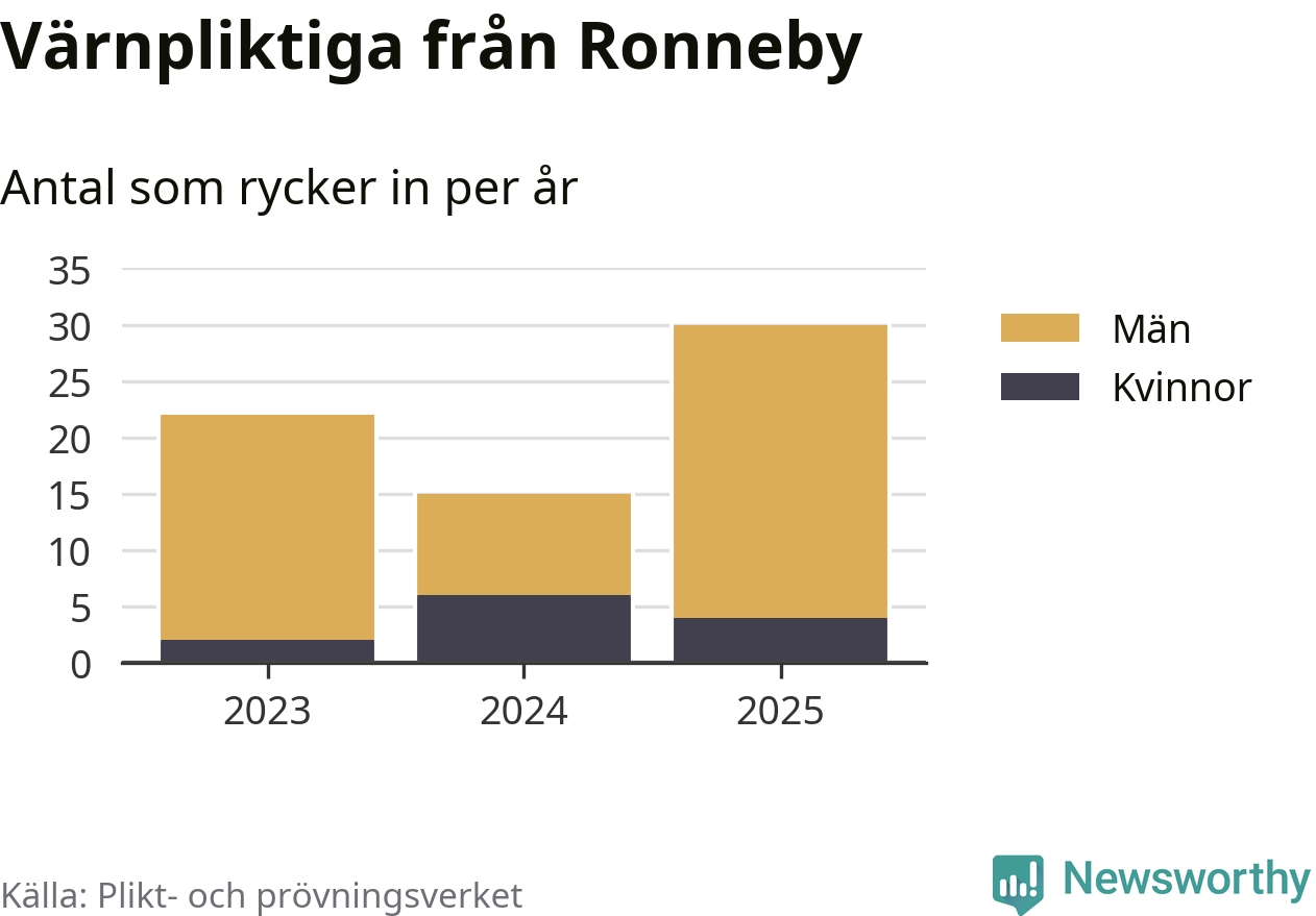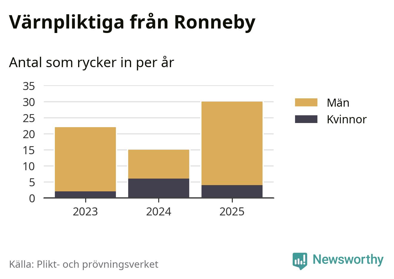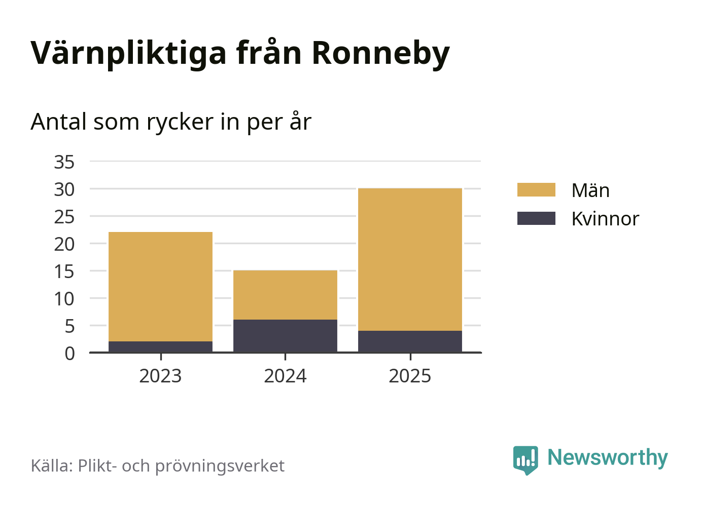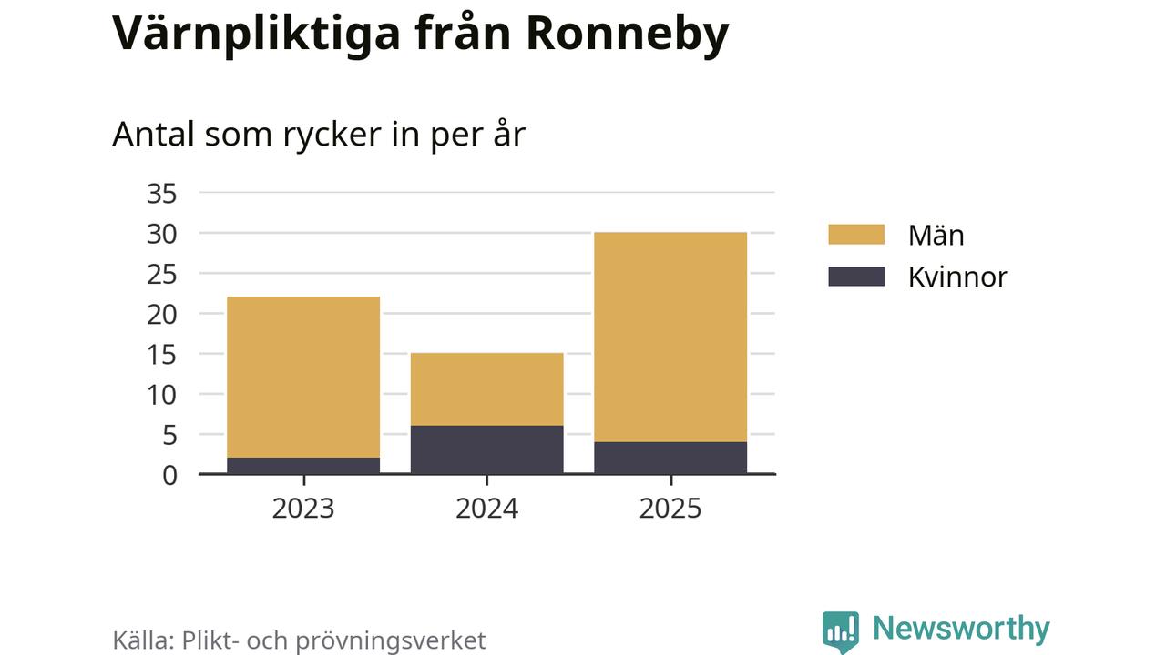 Sedan 2023 – som är det första året vi har jämförbara siffror för – har totalt 67 ungdomar från Ronneby påbörjat sin värnplikt. Av dem har tolv varit kvinnor.