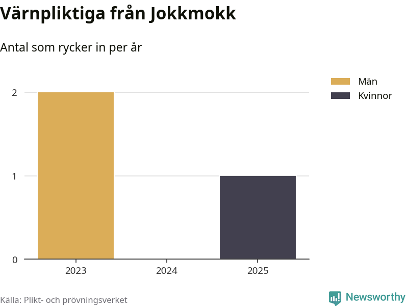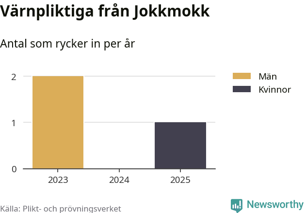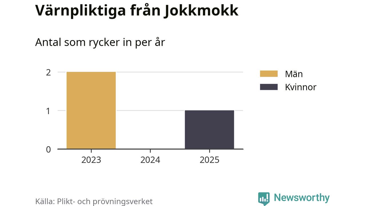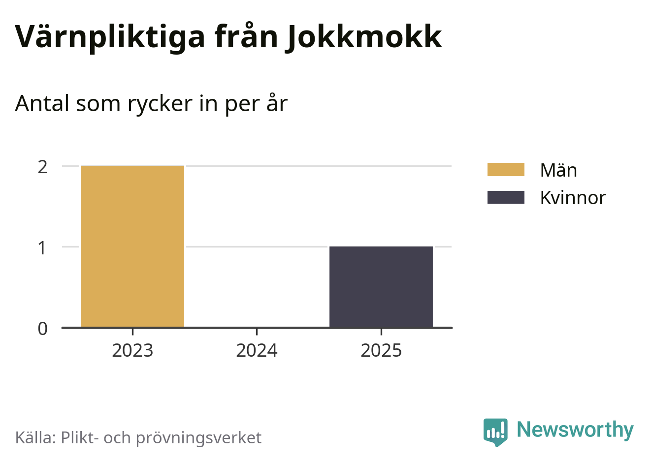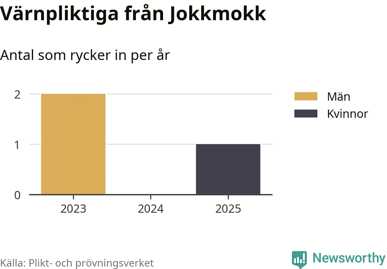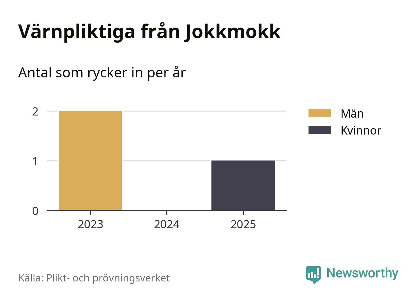 De som rycker in i år är främst ungdomar födda år 2006 och från Jokkmokk är det en ungdom som påbörjar sin värnplikt, en kvinna. Året innan – 2024 – var det ingen från Jokkmokk som ryckte in.