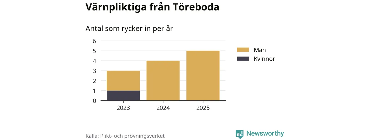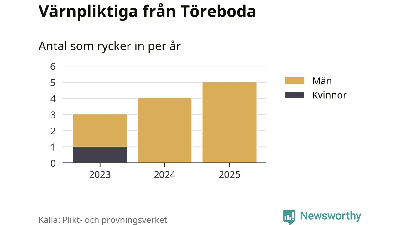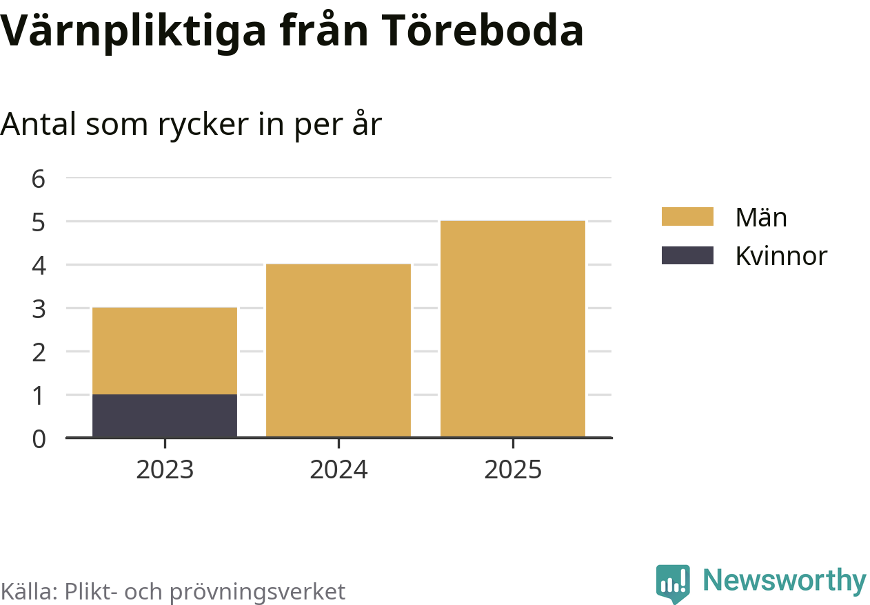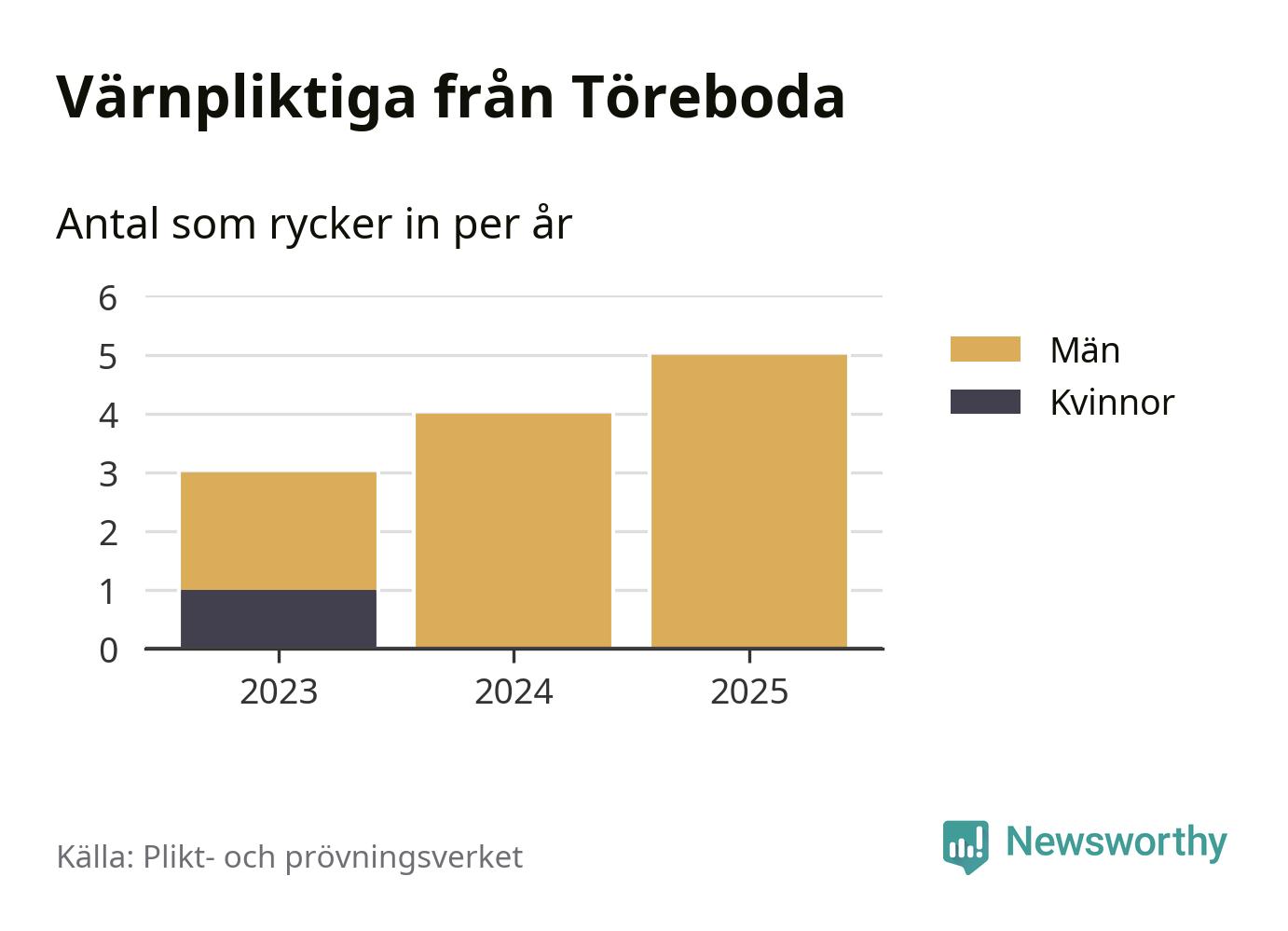 Sedan 2023 – som är det första året vi har jämförbara siffror för – har totalt tolv ungdomar från Töreboda påbörjat sin värnplikt. Av dem har en varit kvinna.