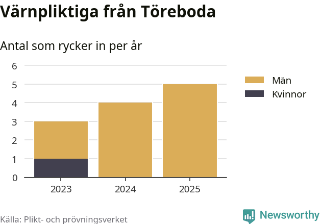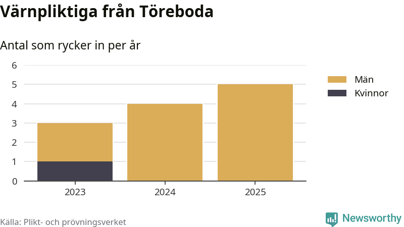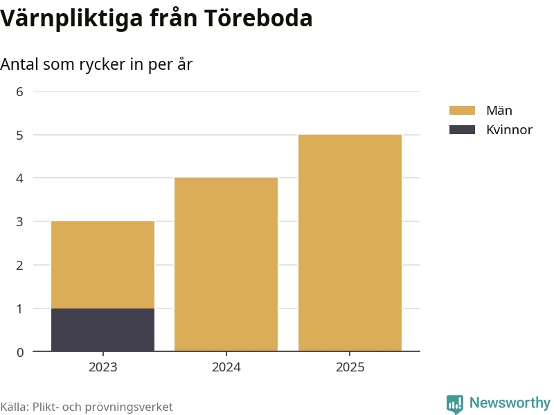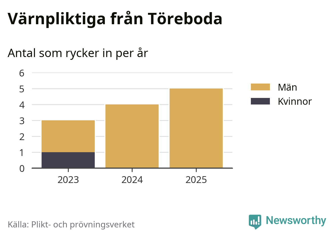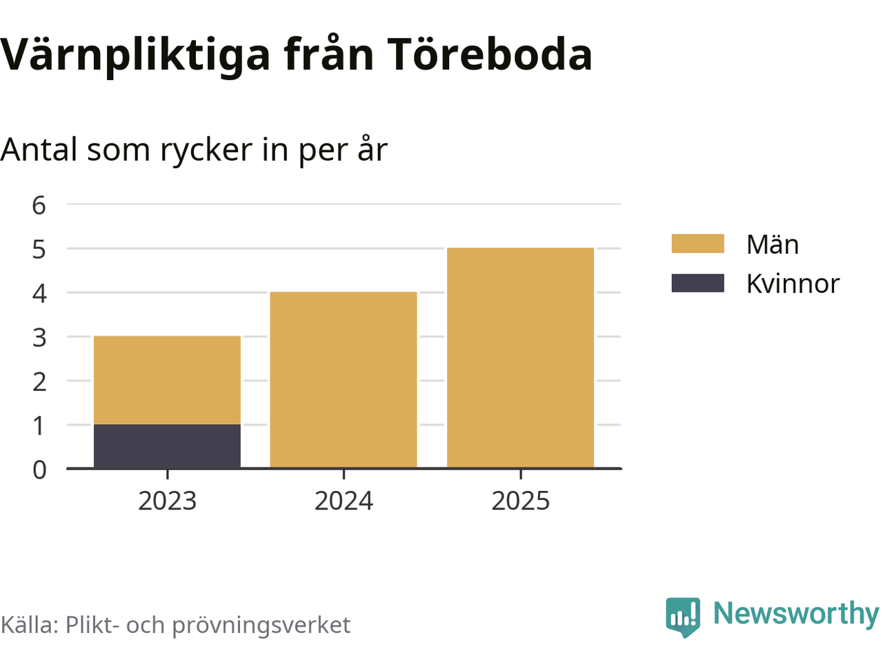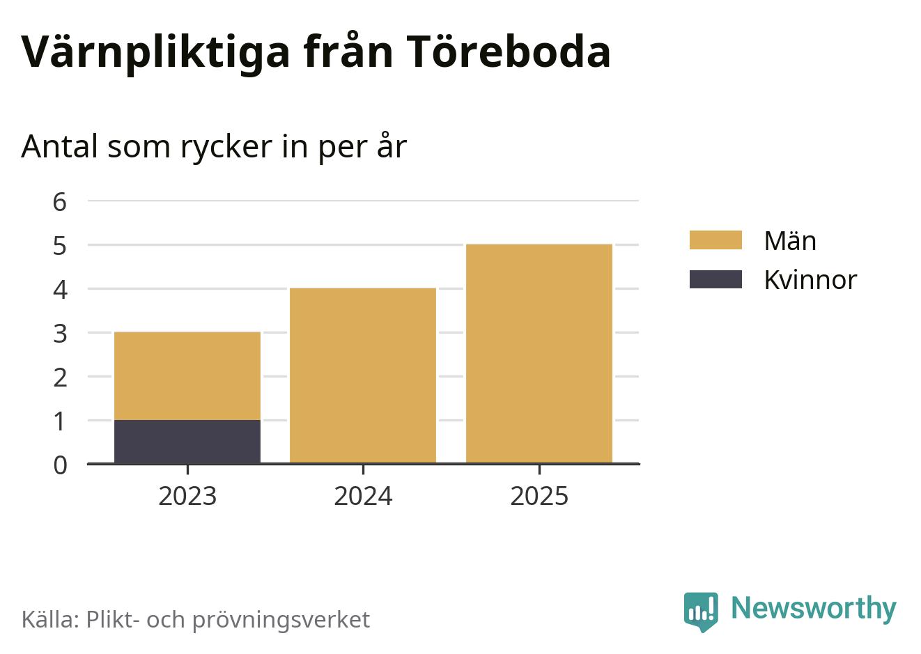 Sedan 2023 – som är det första året vi har jämförbara siffror för – har totalt tolv ungdomar från Töreboda påbörjat sin värnplikt. Av dem har en varit kvinna.