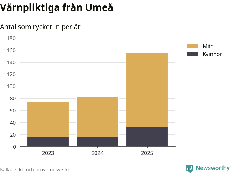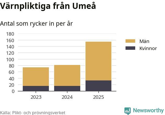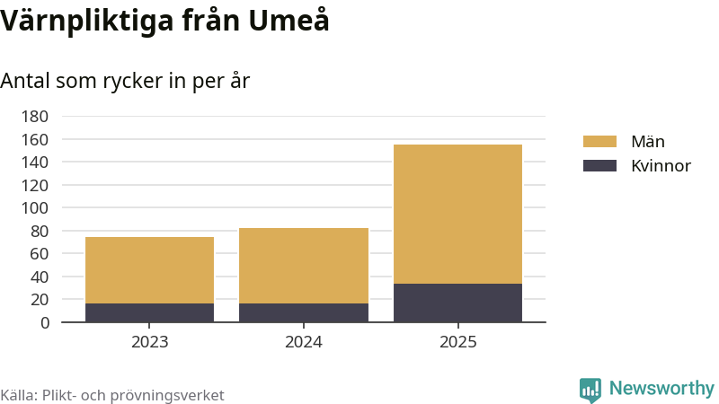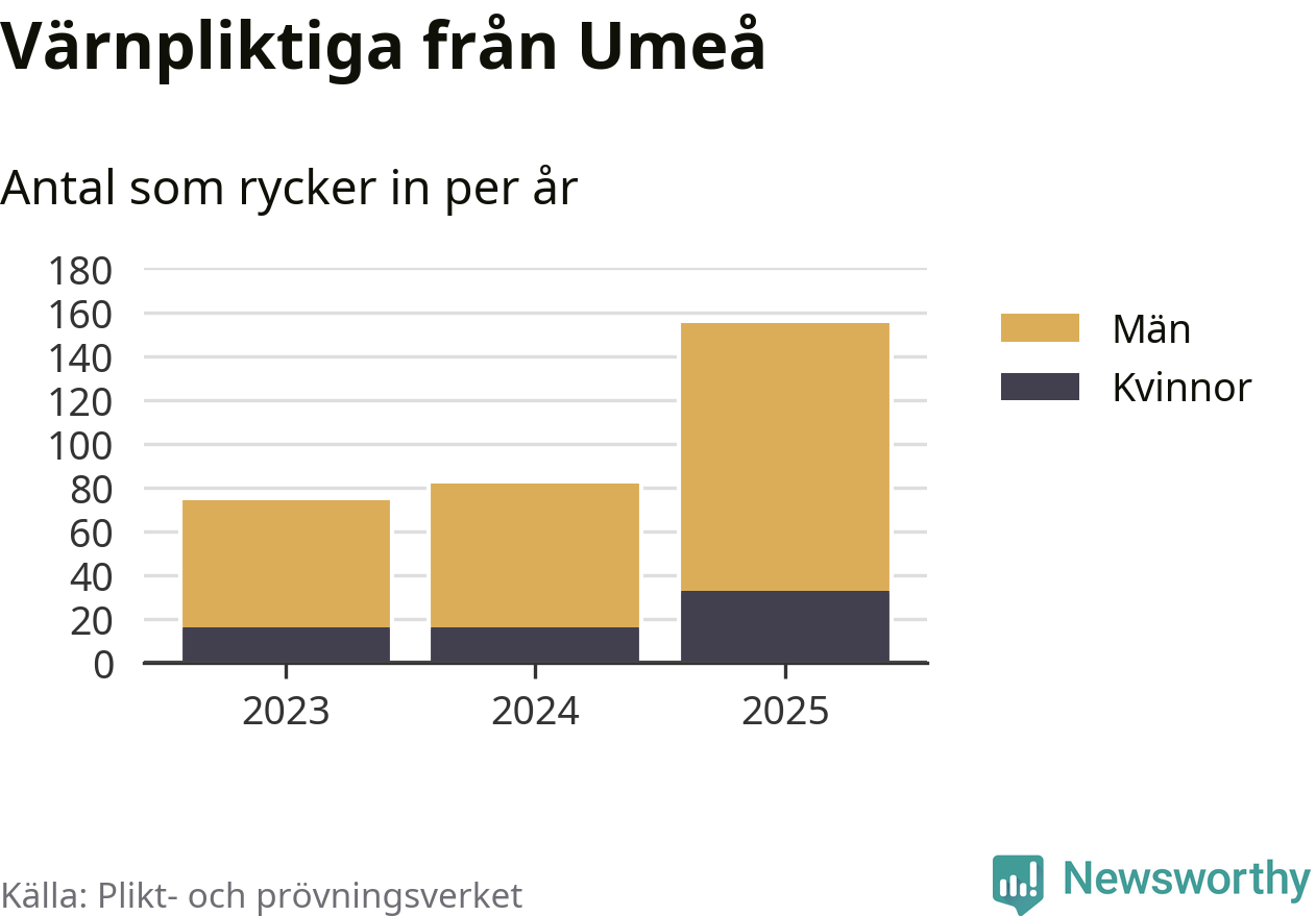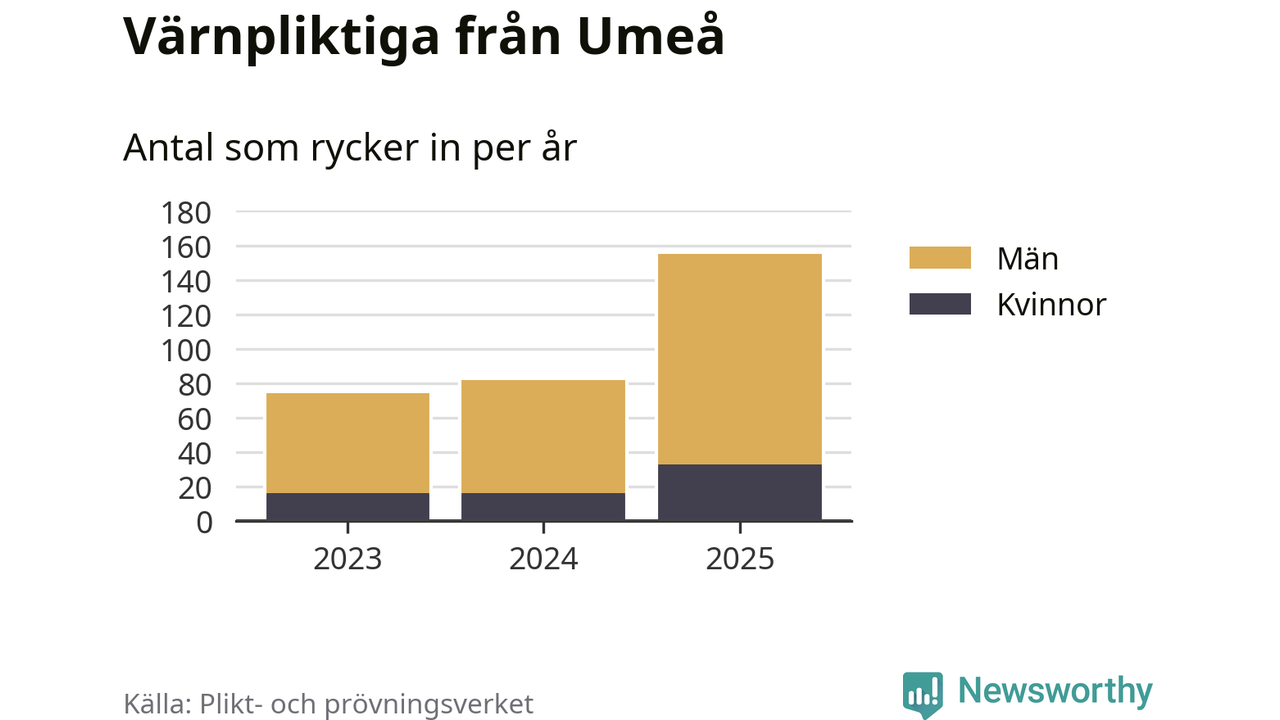 Sedan 2023 – som är det första året vi har jämförbara siffror för – har totalt 311 ungdomar från Umeå påbörjat sin värnplikt. Av dem har 65 varit kvinnor.