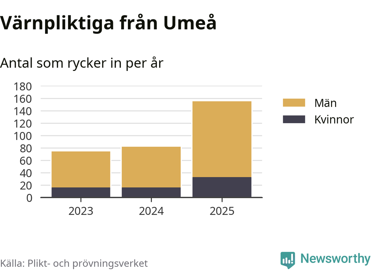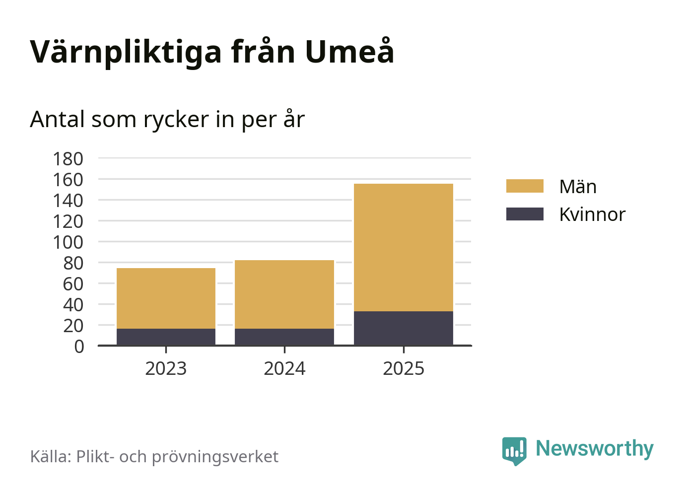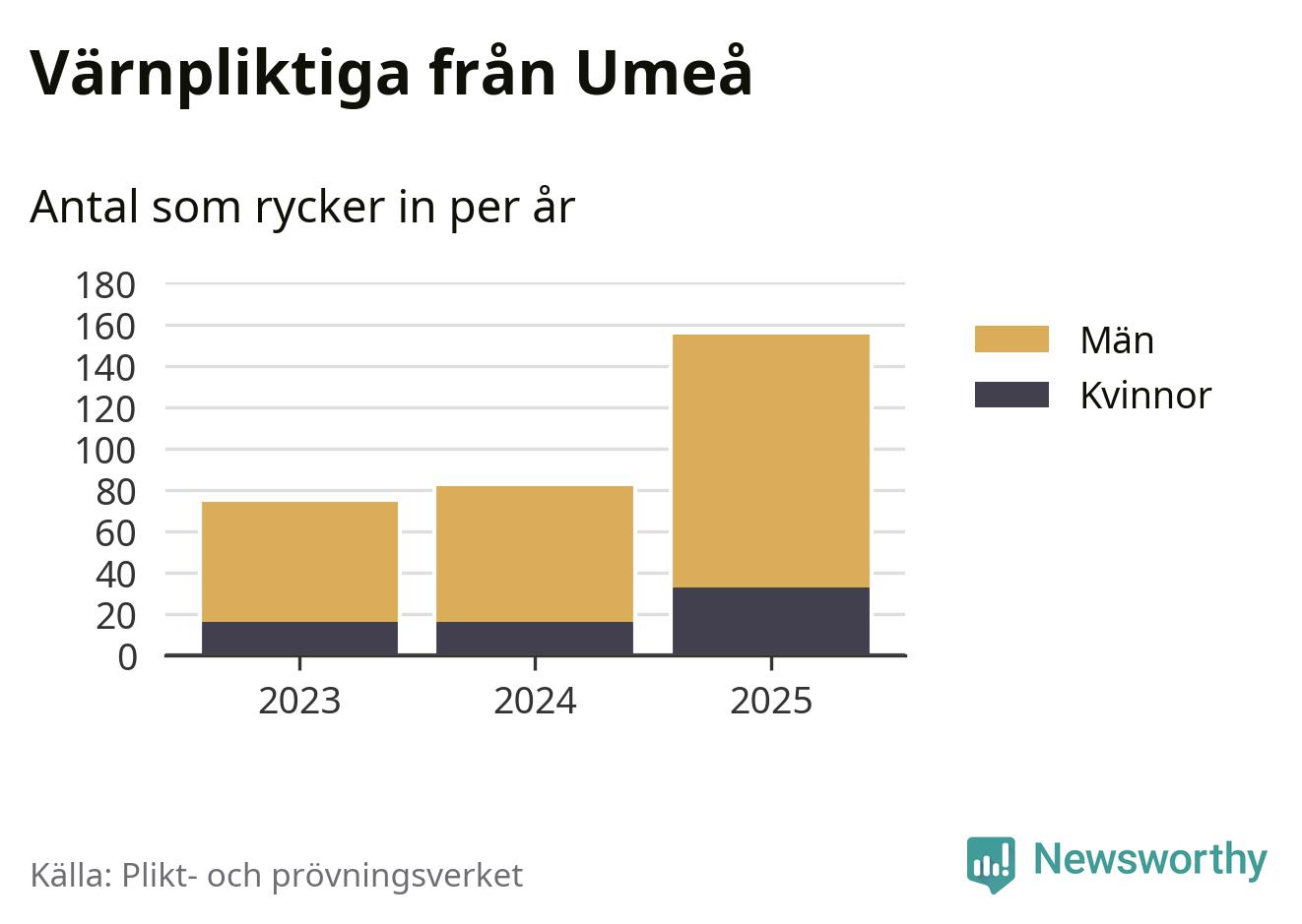 Sedan 2023 – som är det första året vi har jämförbara siffror för – har totalt 311 ungdomar från Umeå påbörjat sin värnplikt. Av dem har 65 varit kvinnor.